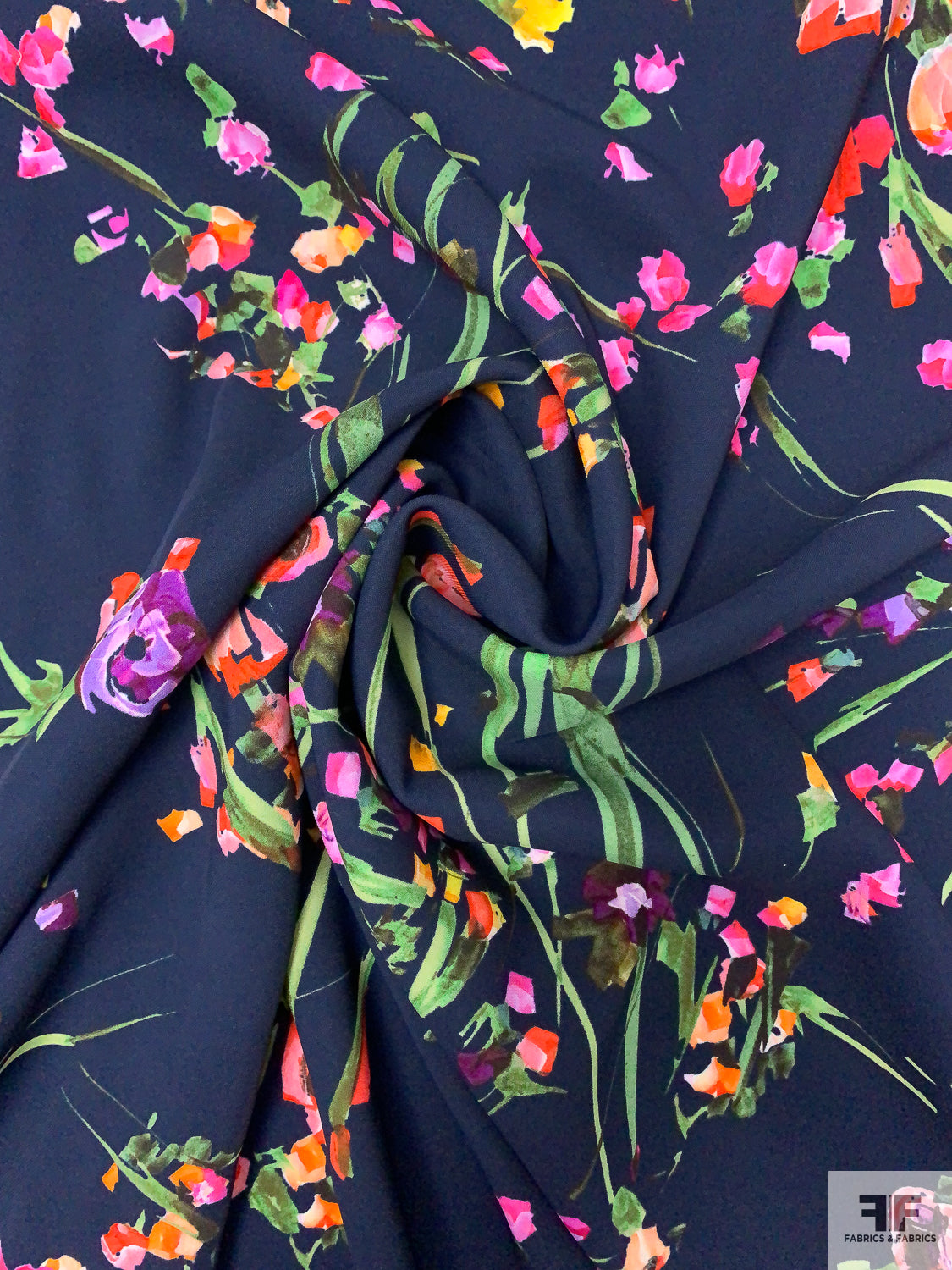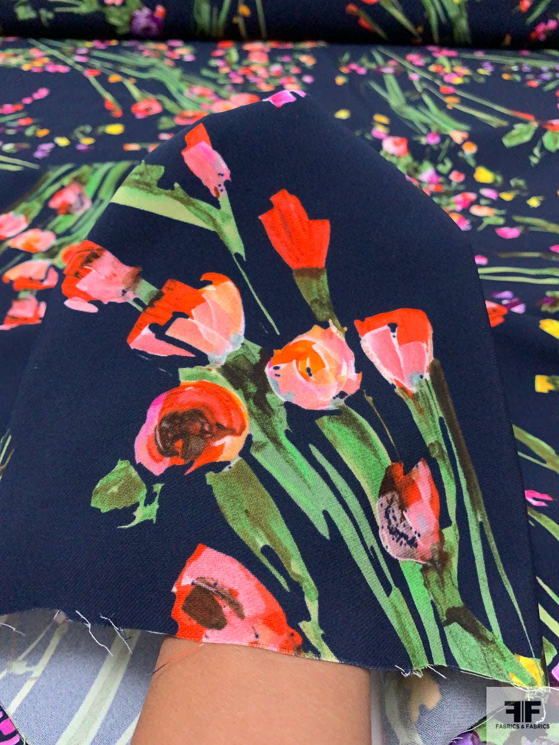 Impressionist Tulips Printed Heavy Stretch Rayon Crepe - Navy / Green / Multicolor