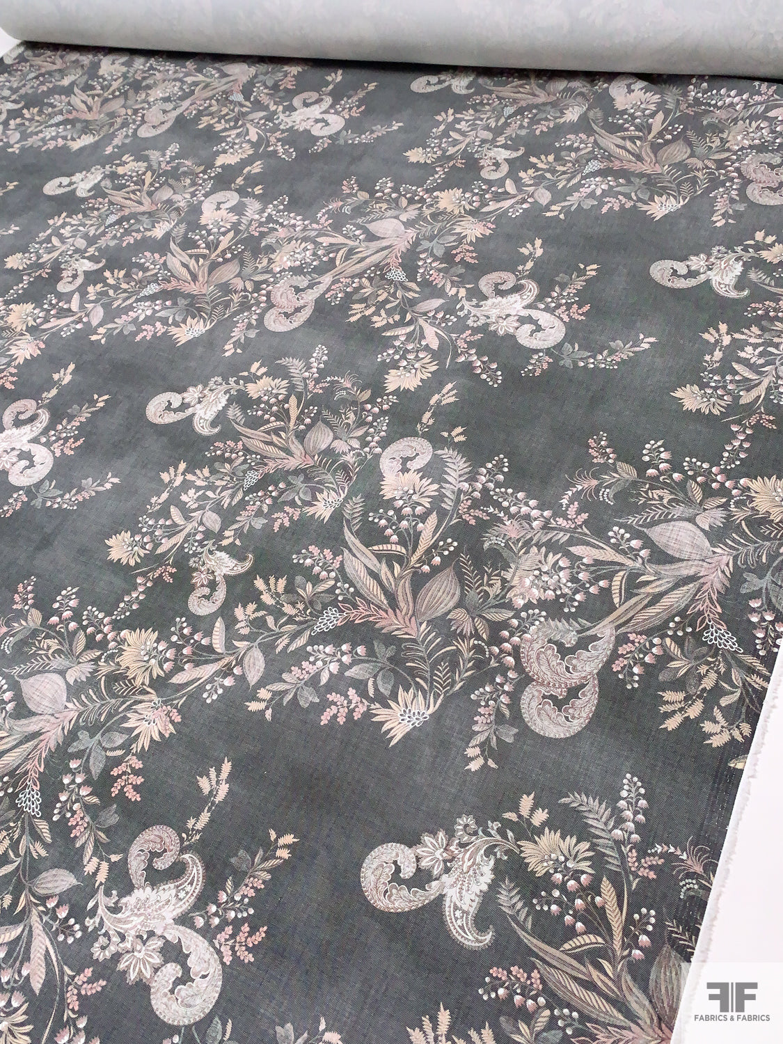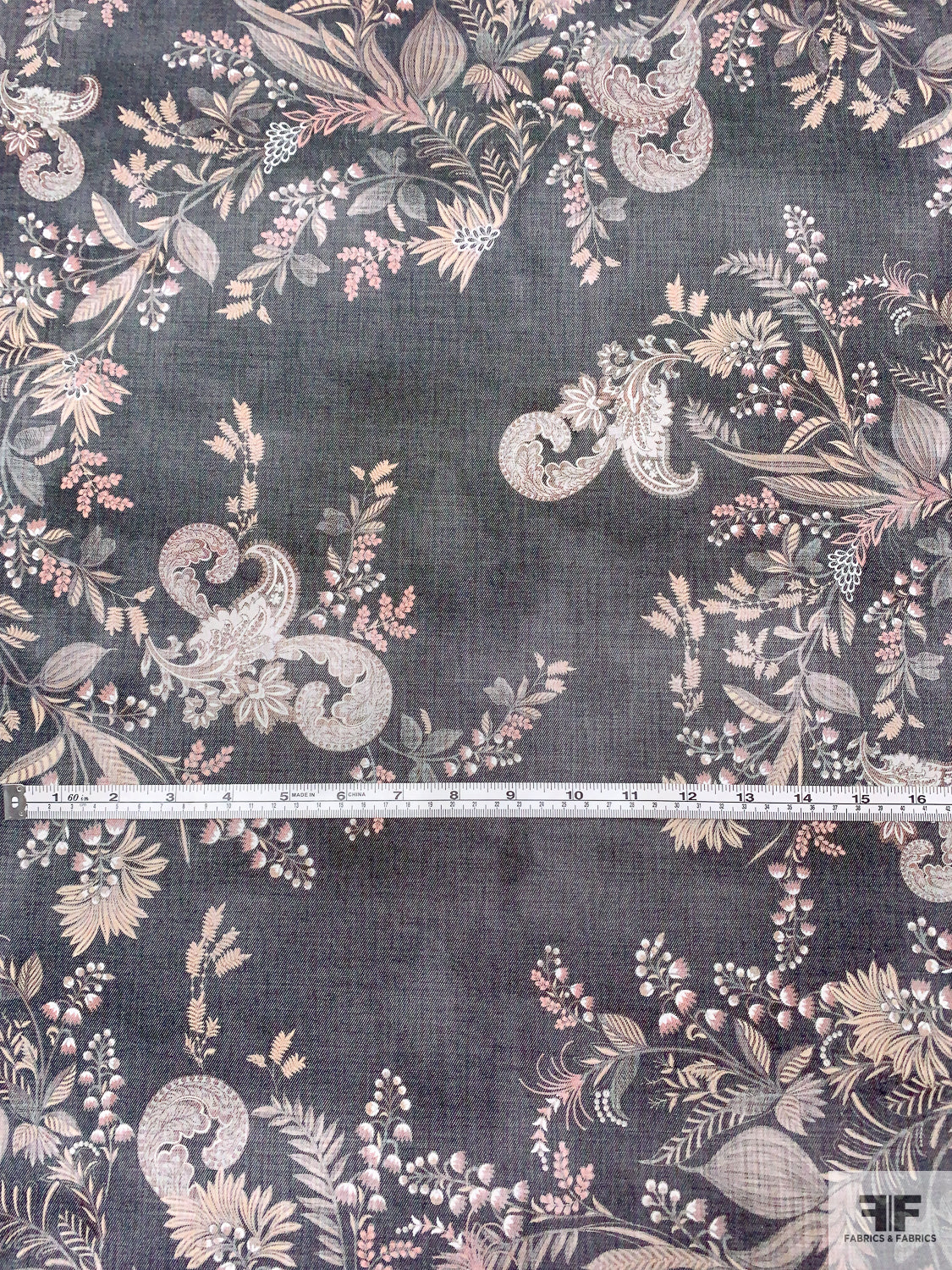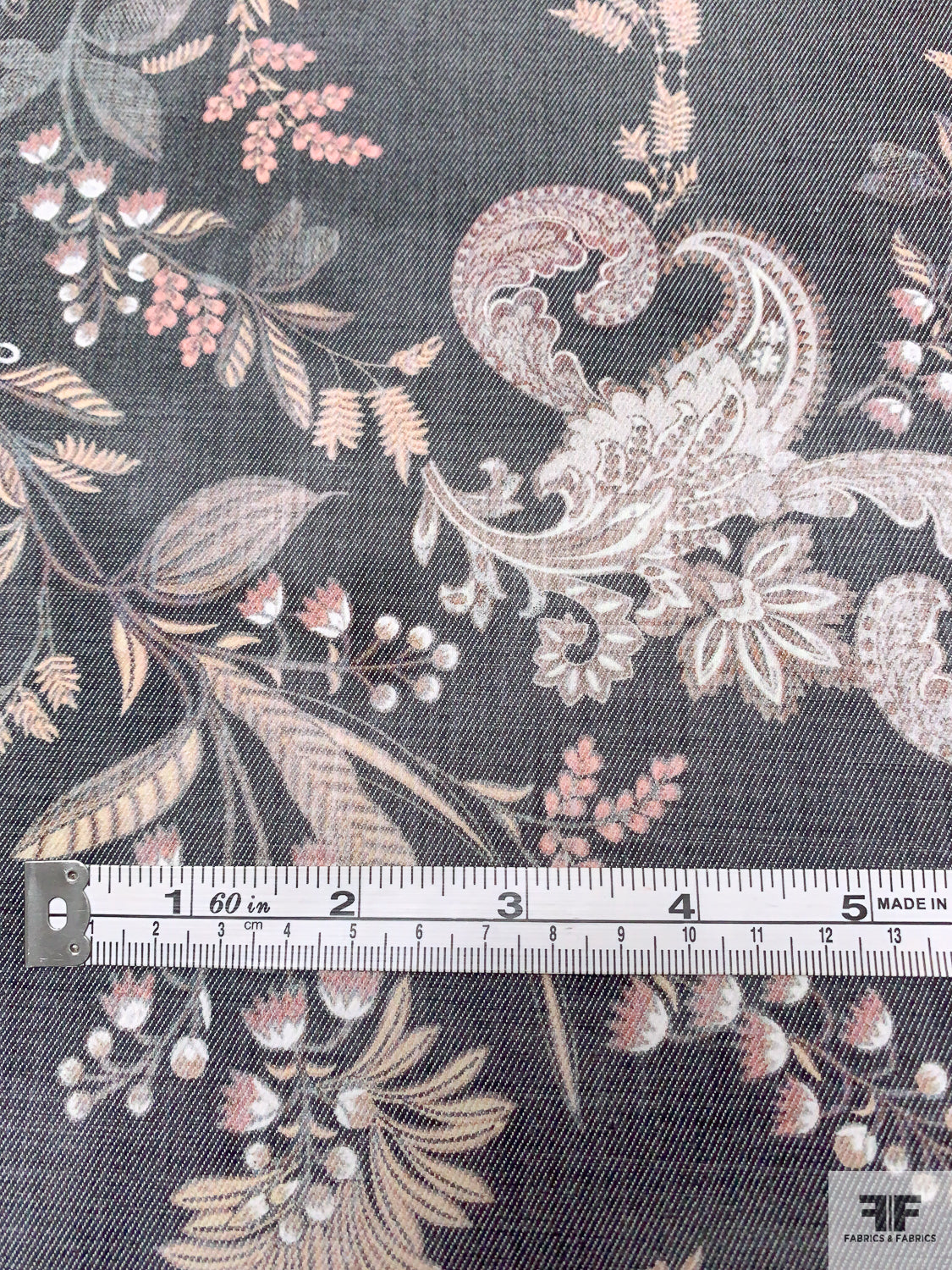 Italian Paisley Floral Printed Stretch Denim - Dark Grey / Pale Tones