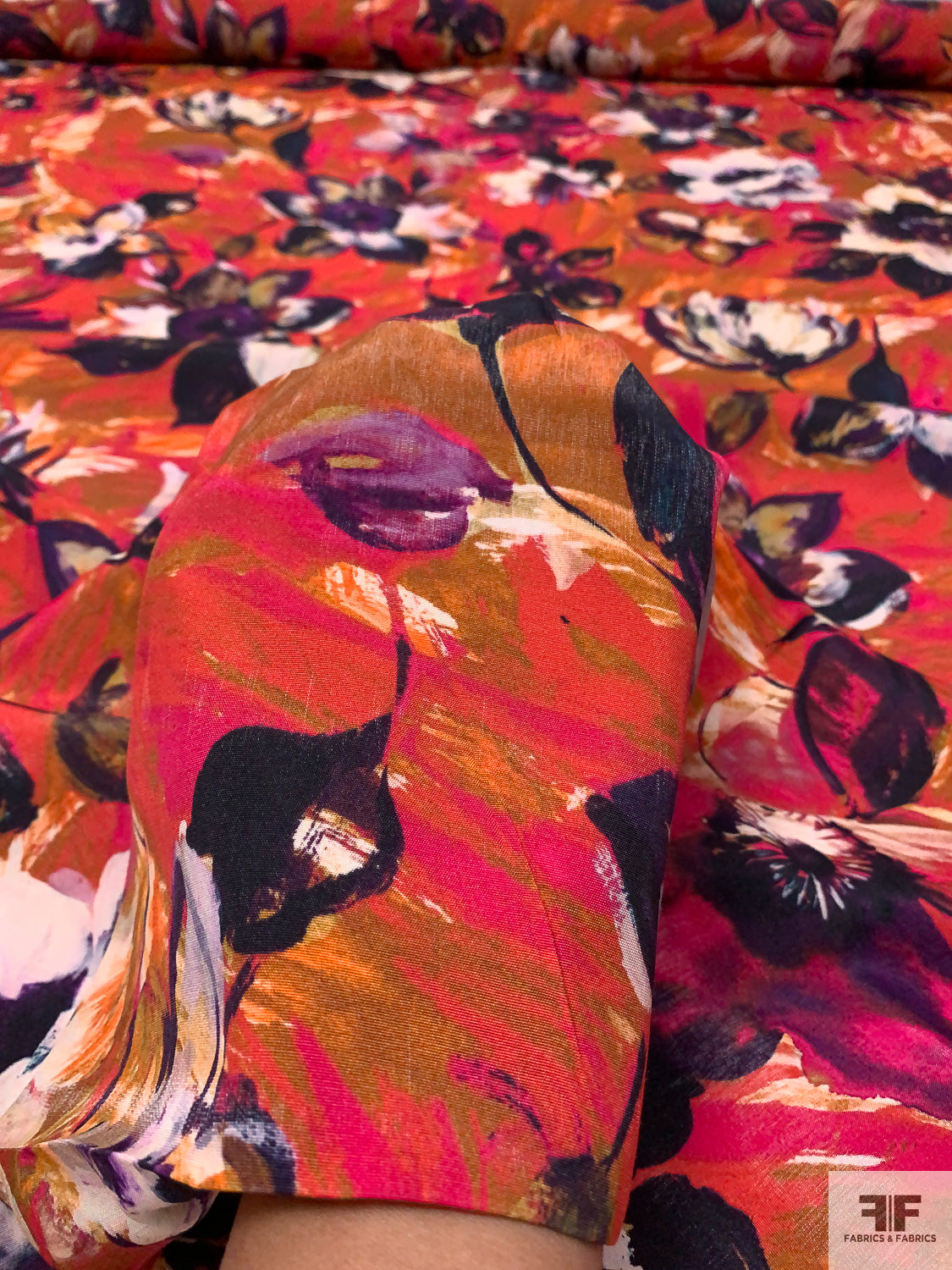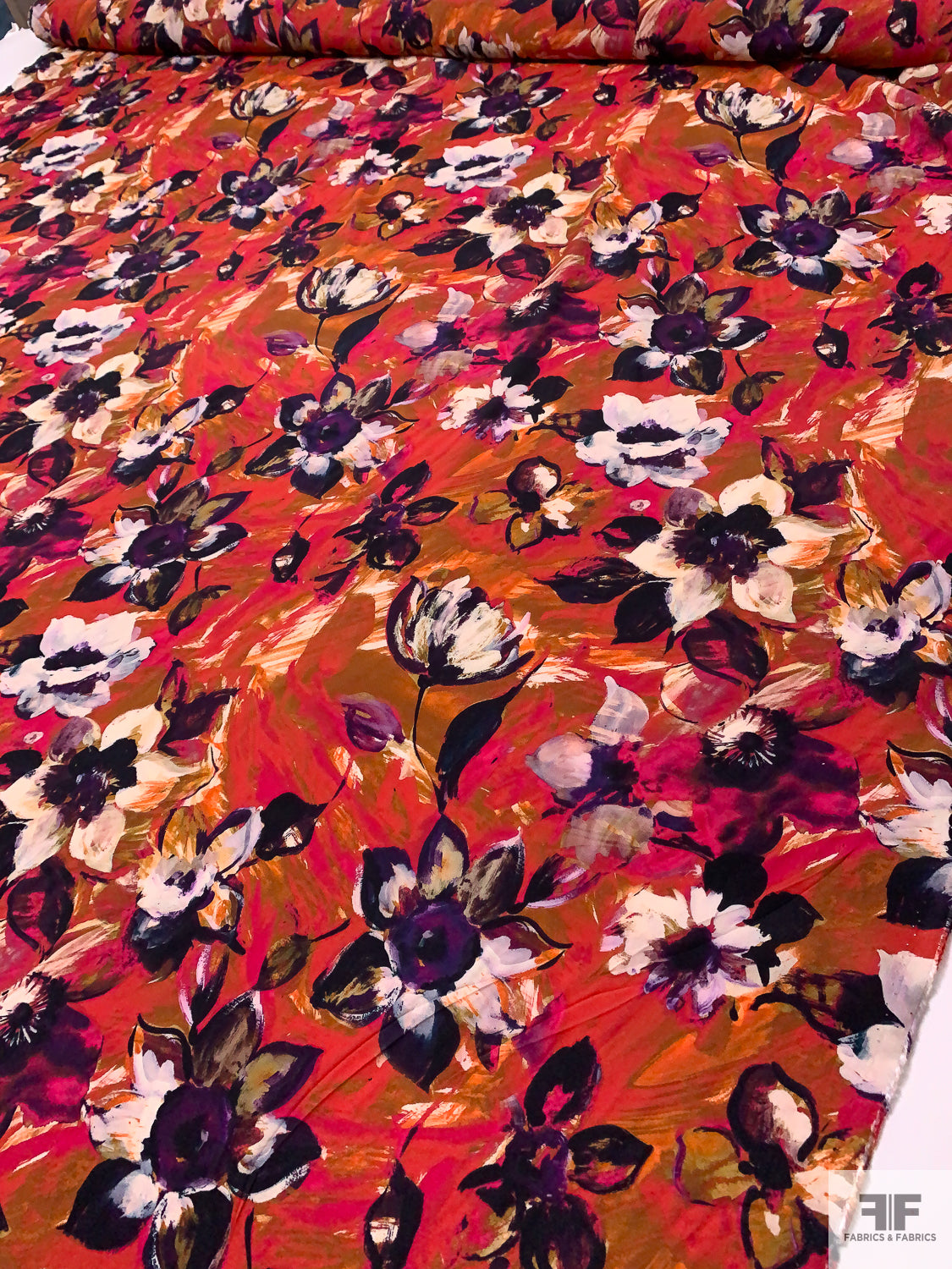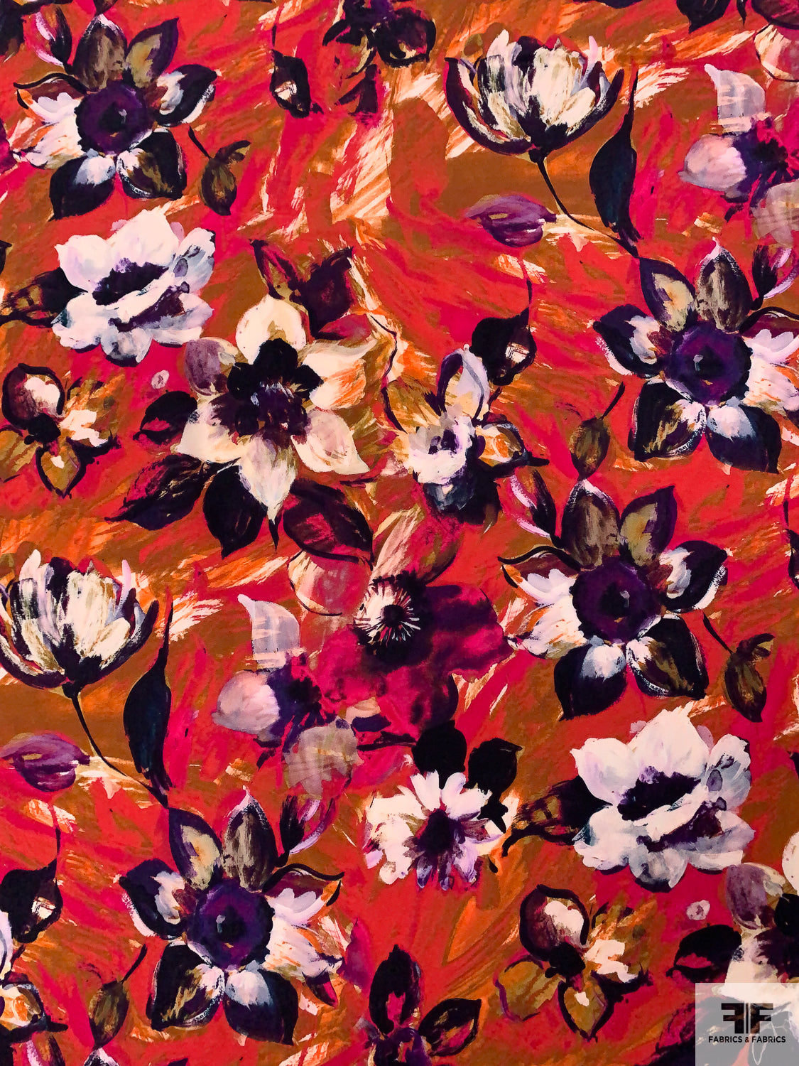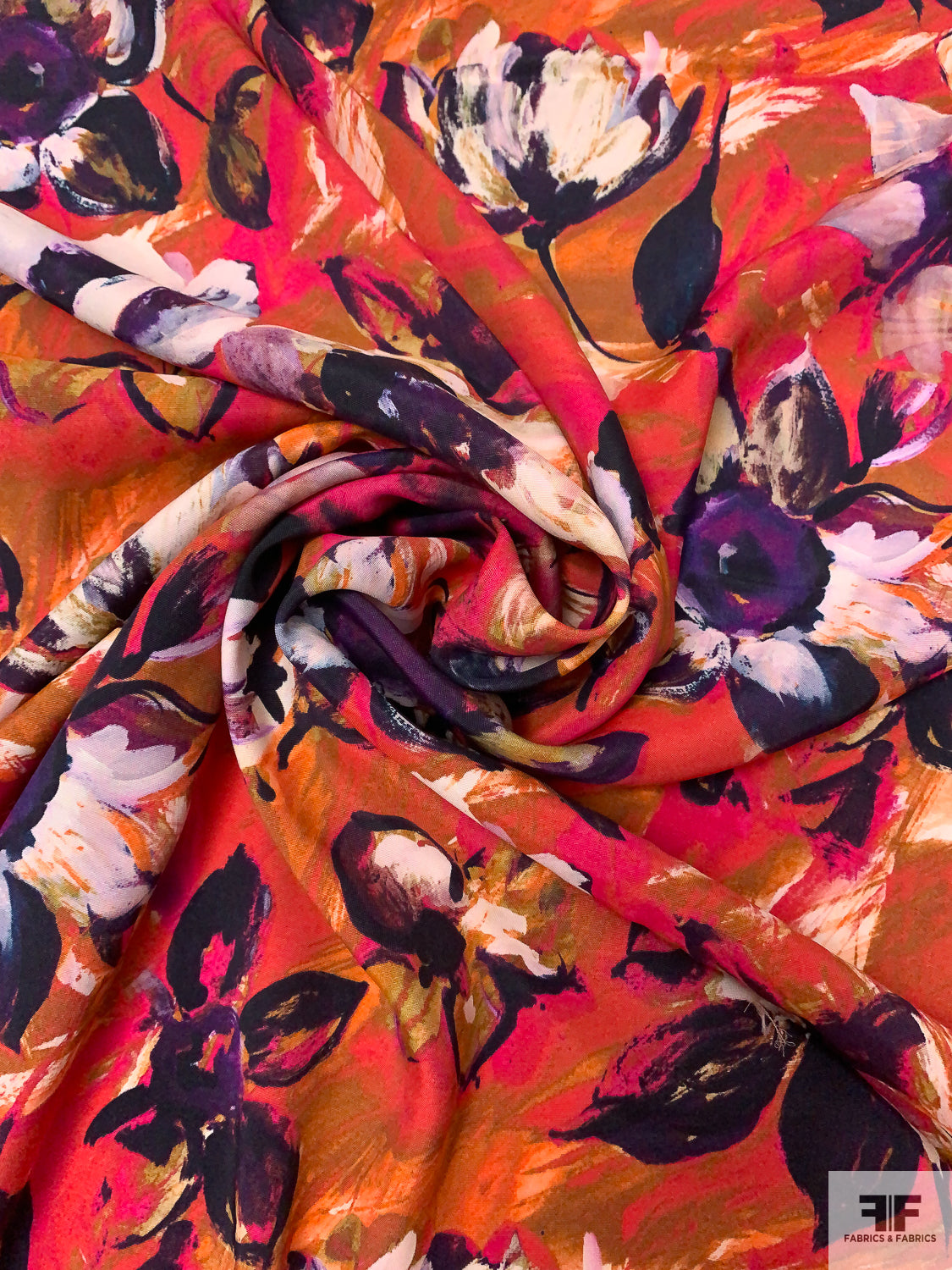 Painterly Floral Printed Rayon Challis - Magenta / Dark Purple / Ochre-Orange / Off-White