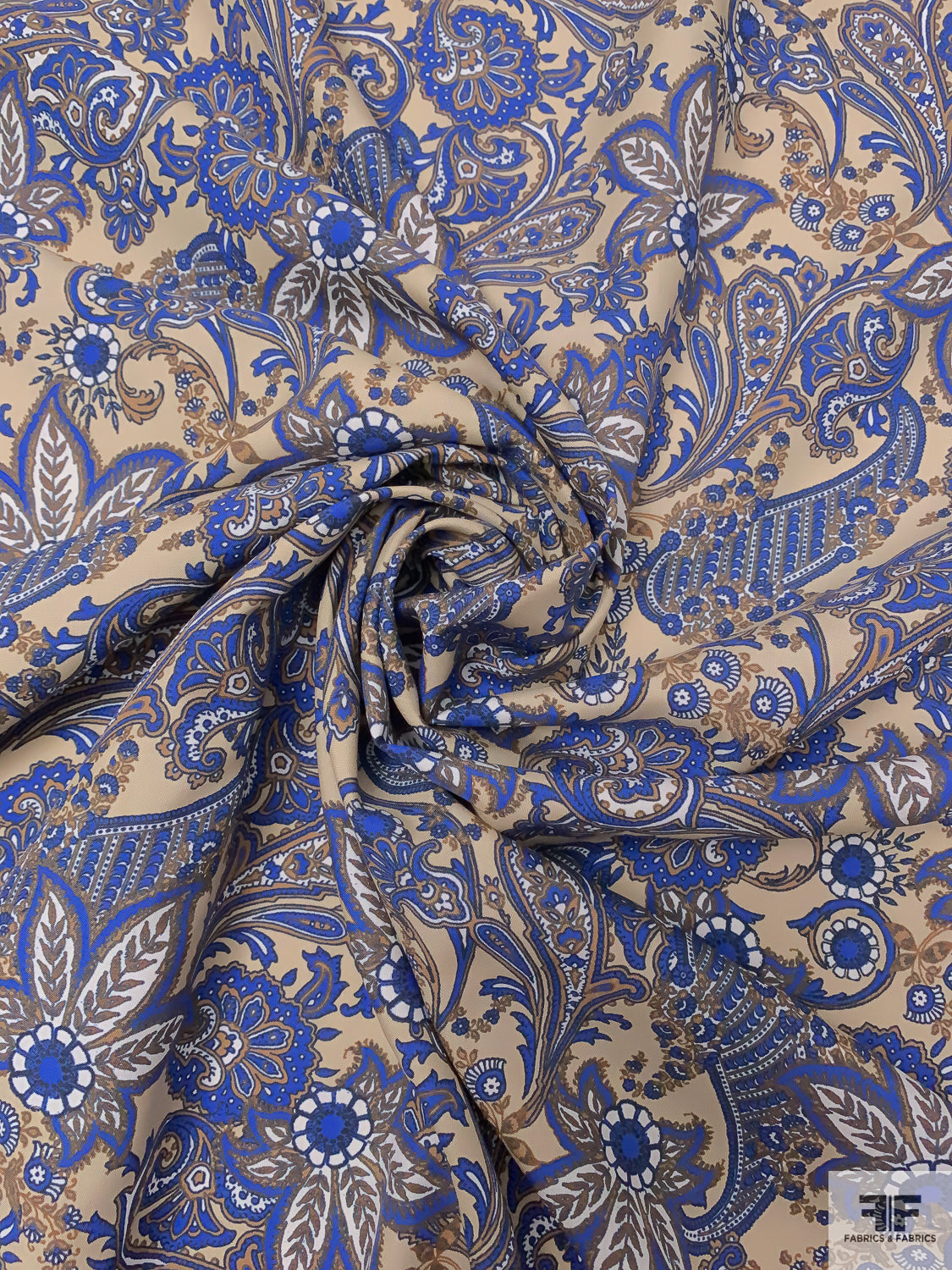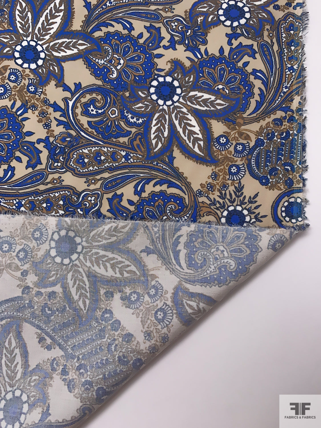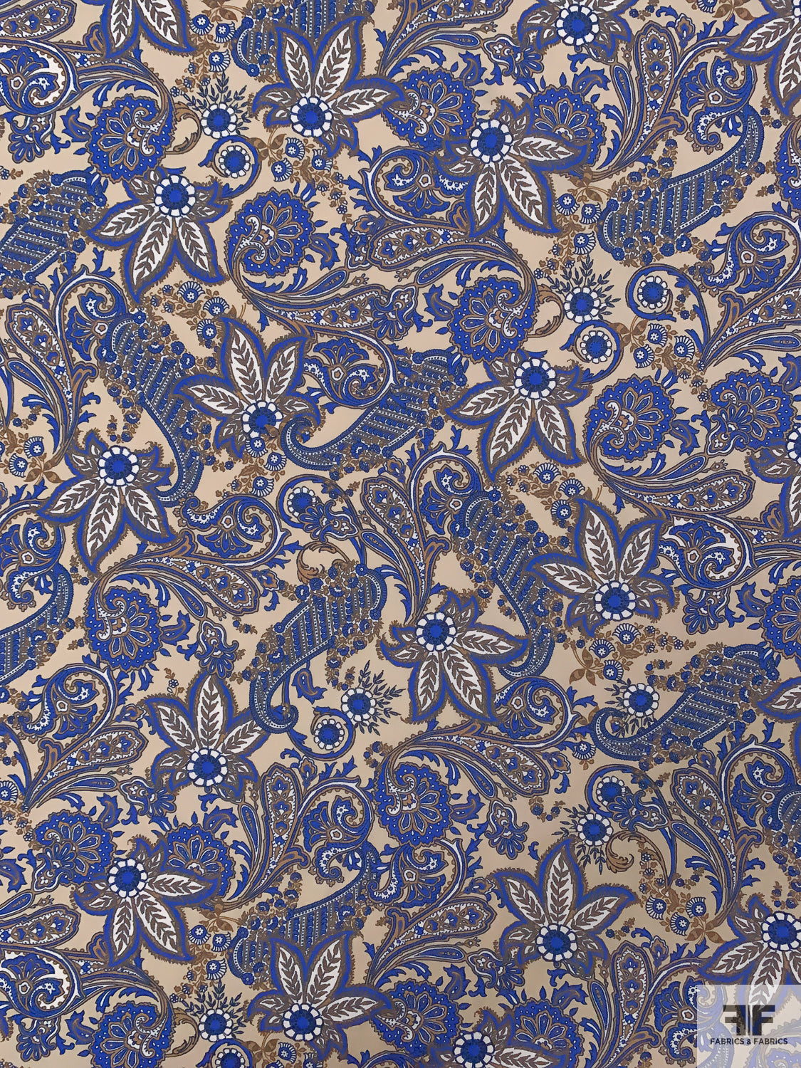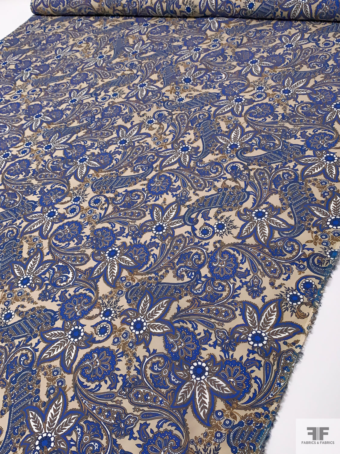 Paisley Floral Printed Silk Broadcloth - Blue / Tan / Brown