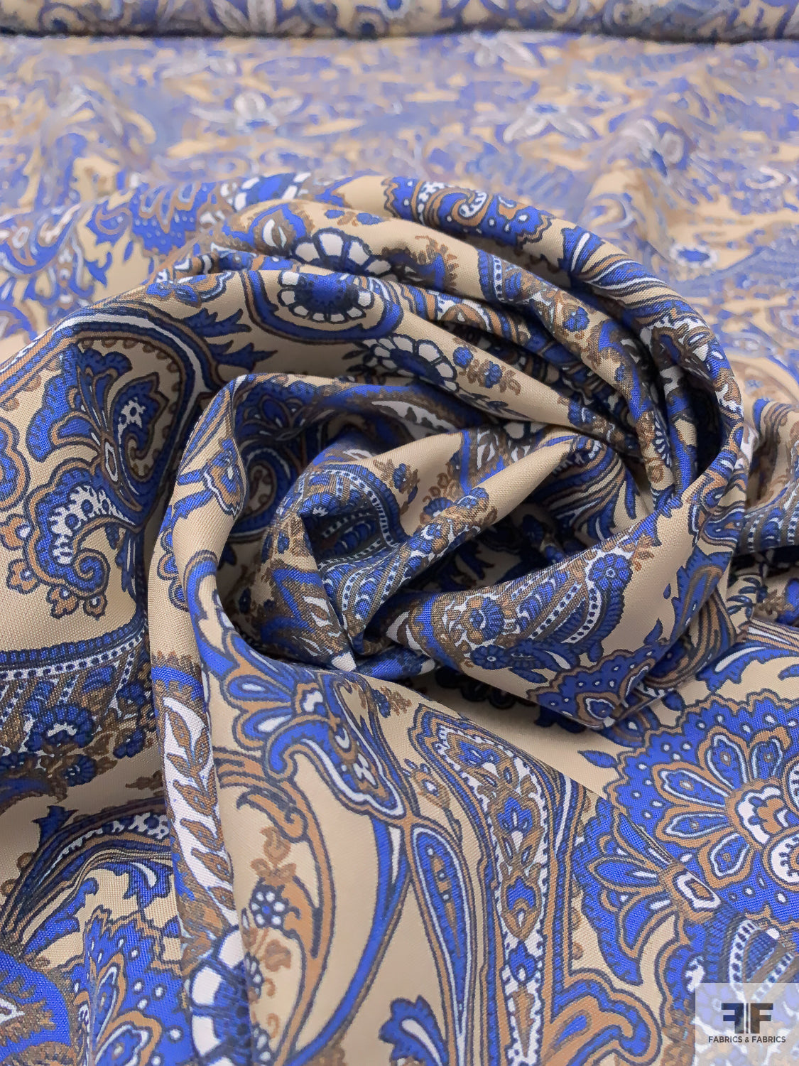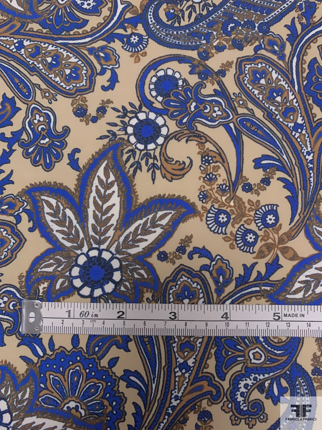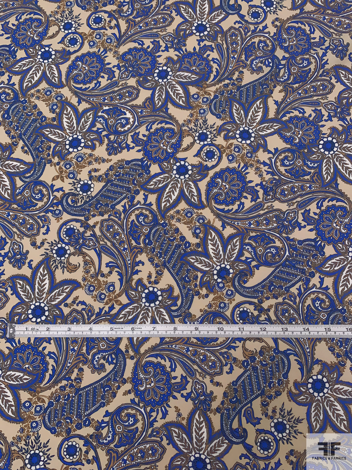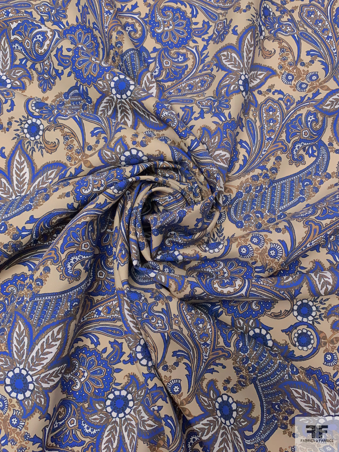 Paisley Floral Printed Silk Broadcloth - Blue / Tan / Brown