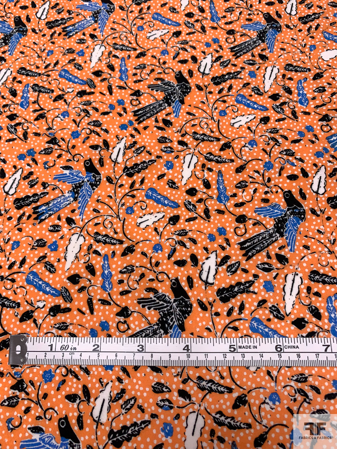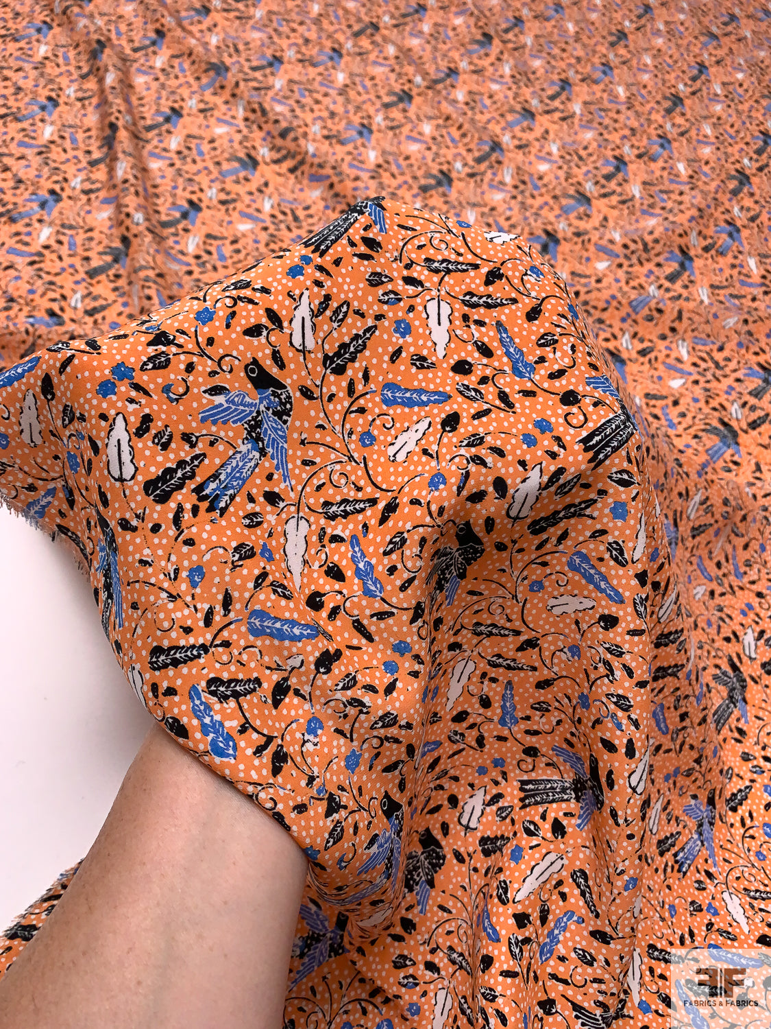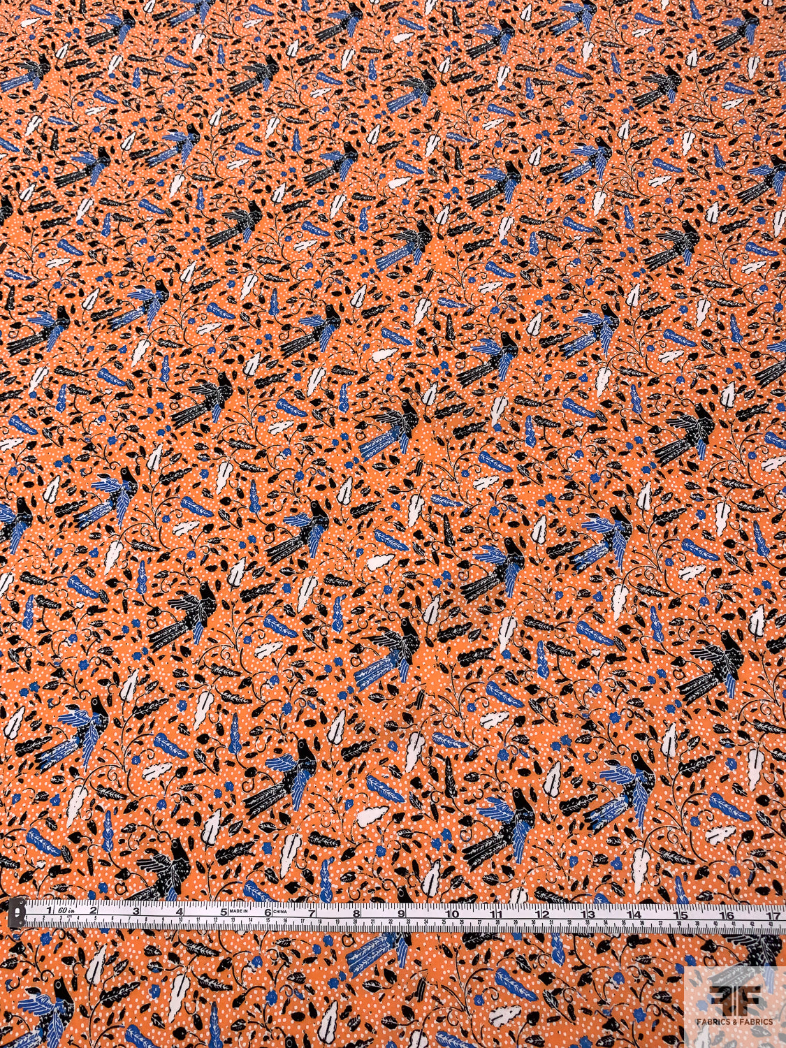 Birds and Ditsy Leaf Matte-Side Printed Silk Charmeuse - Orange / Blue / Navy