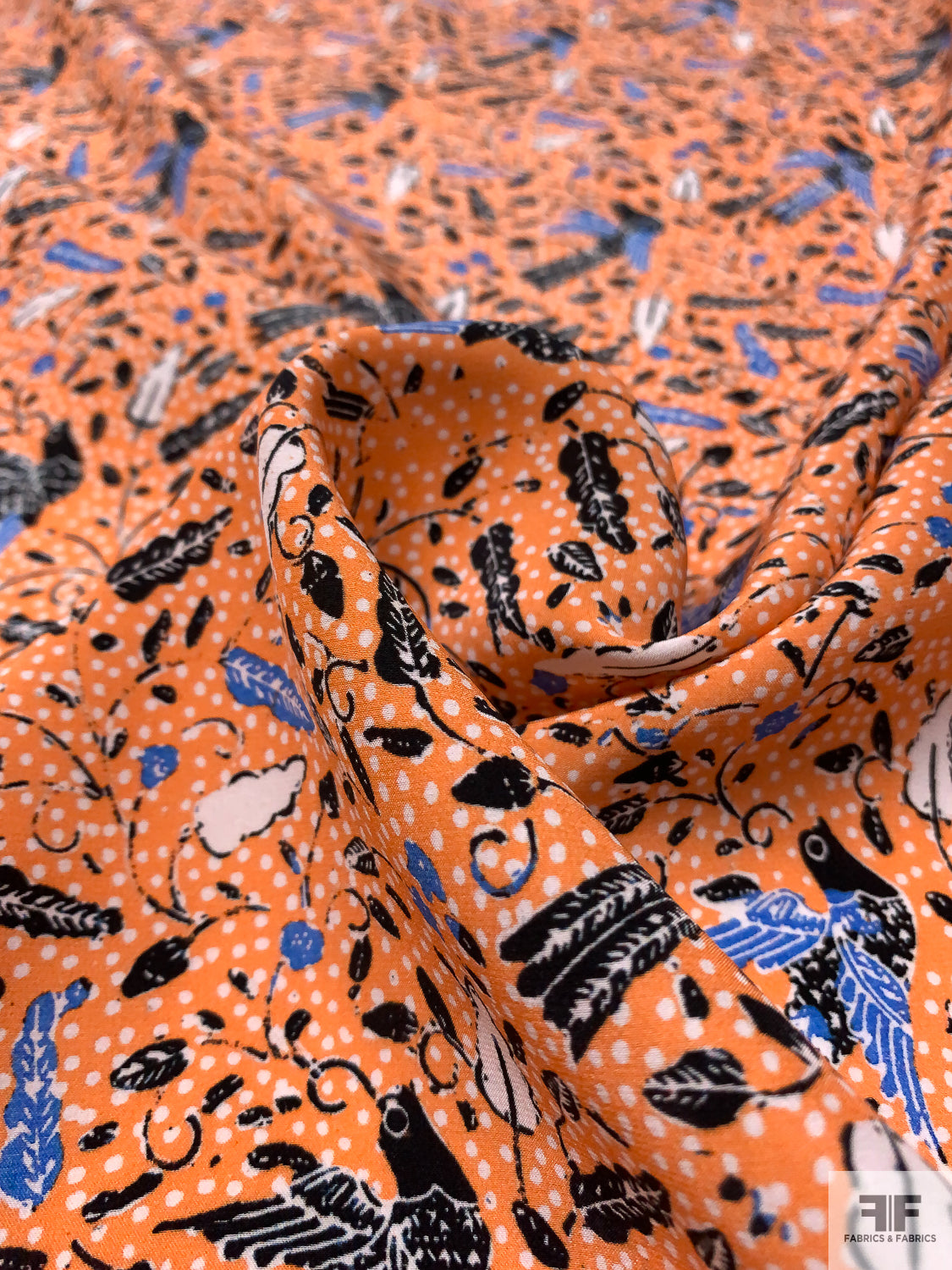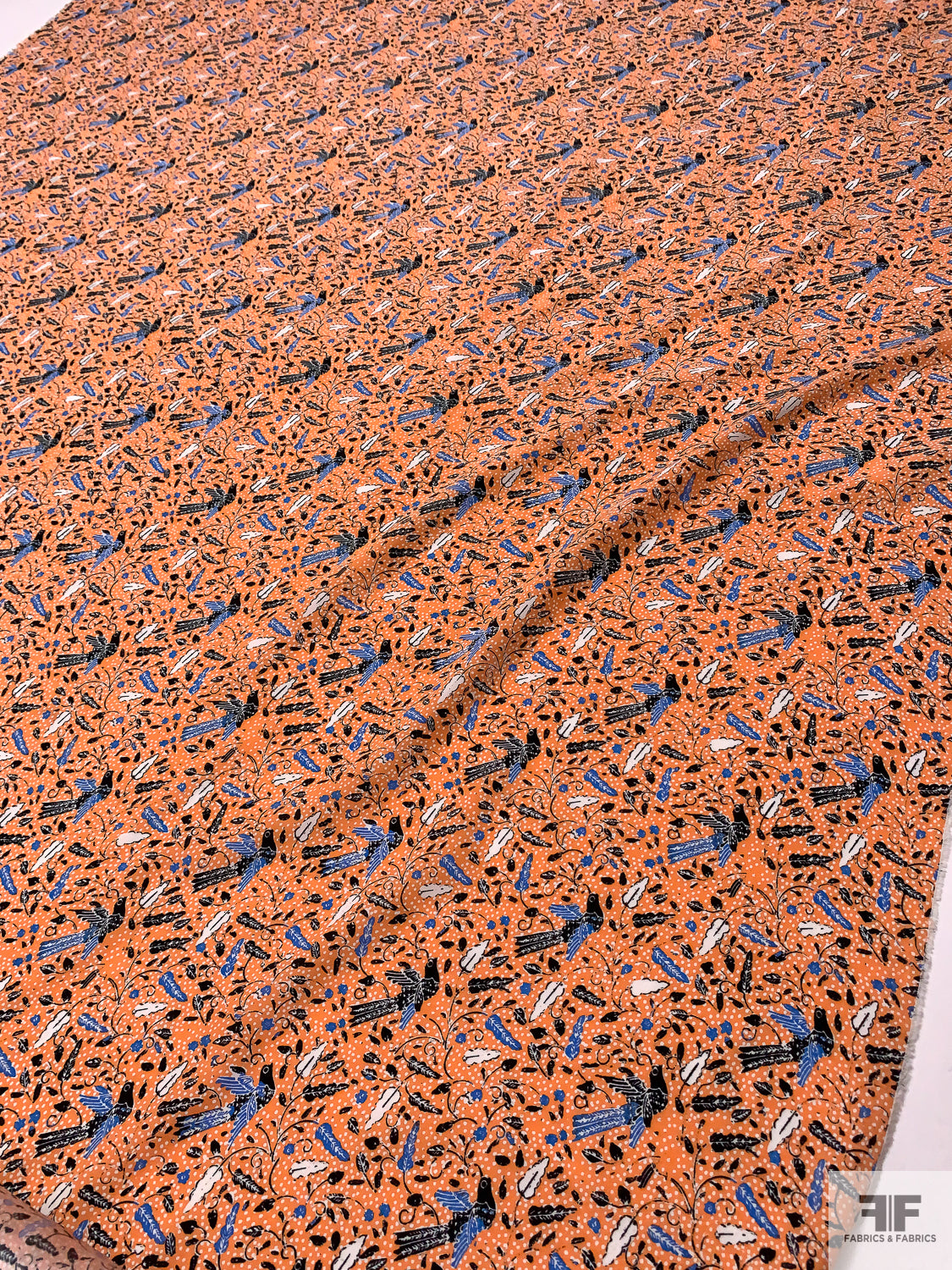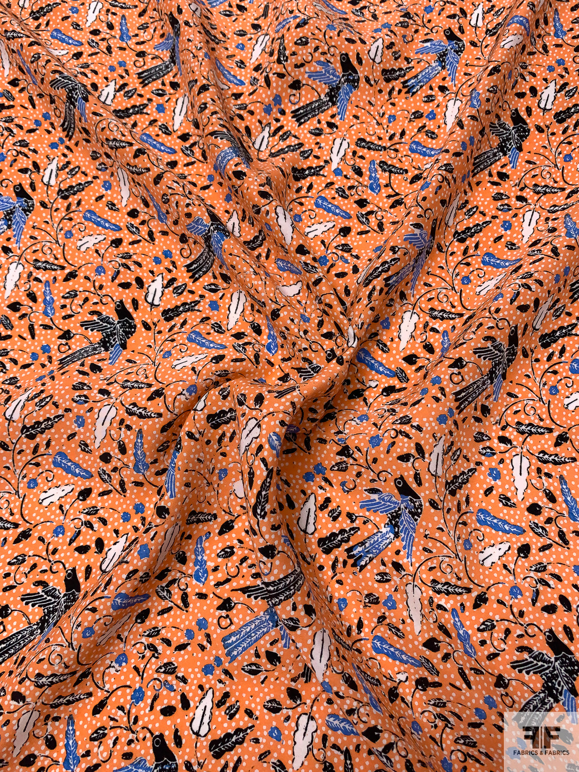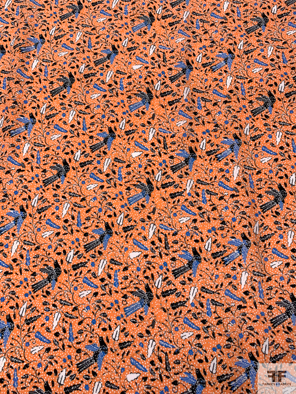 Birds and Ditsy Leaf Matte-Side Printed Silk Charmeuse - Orange / Blue / Navy