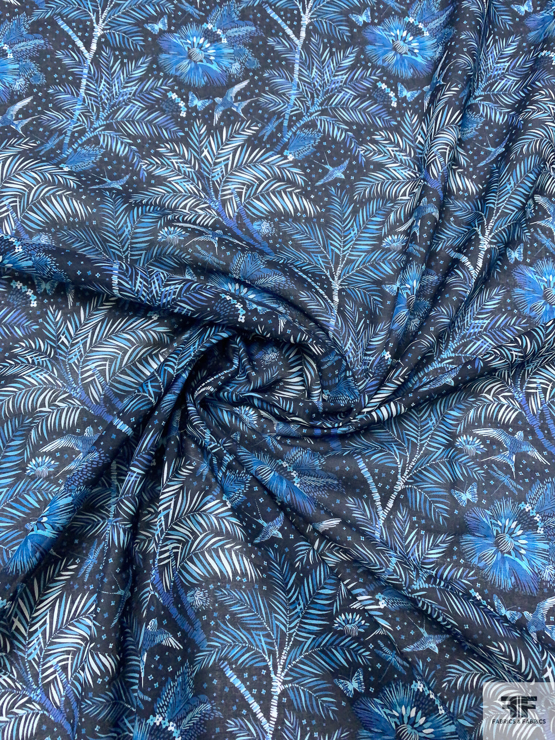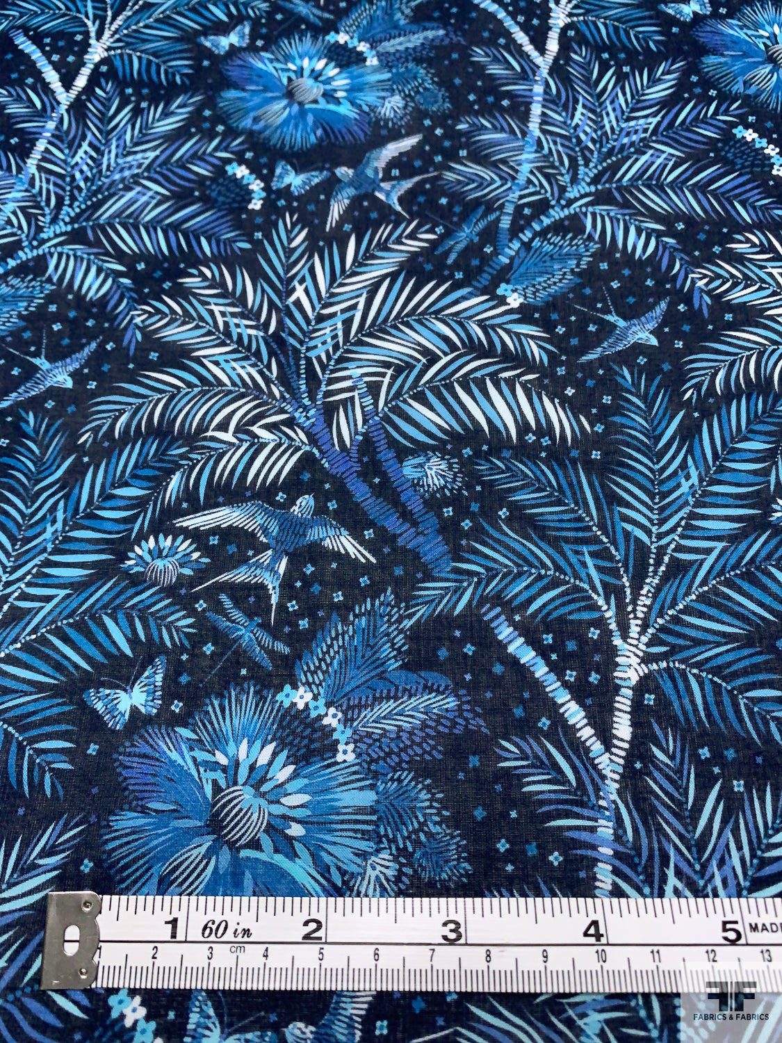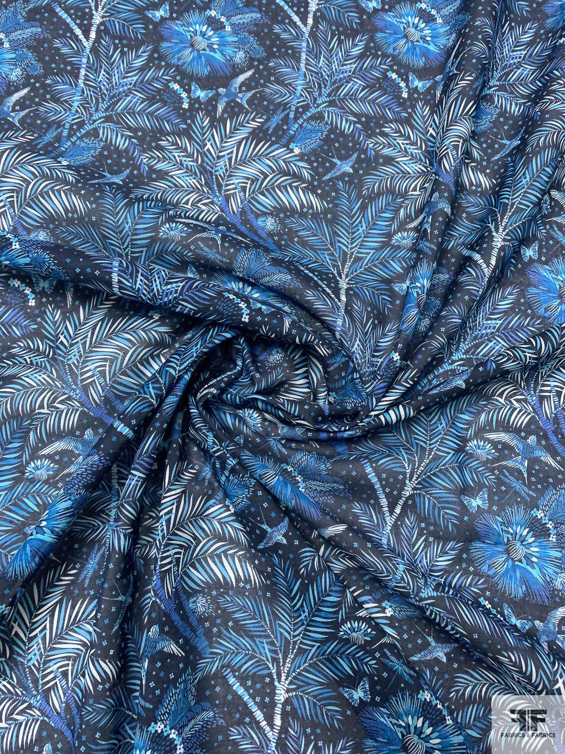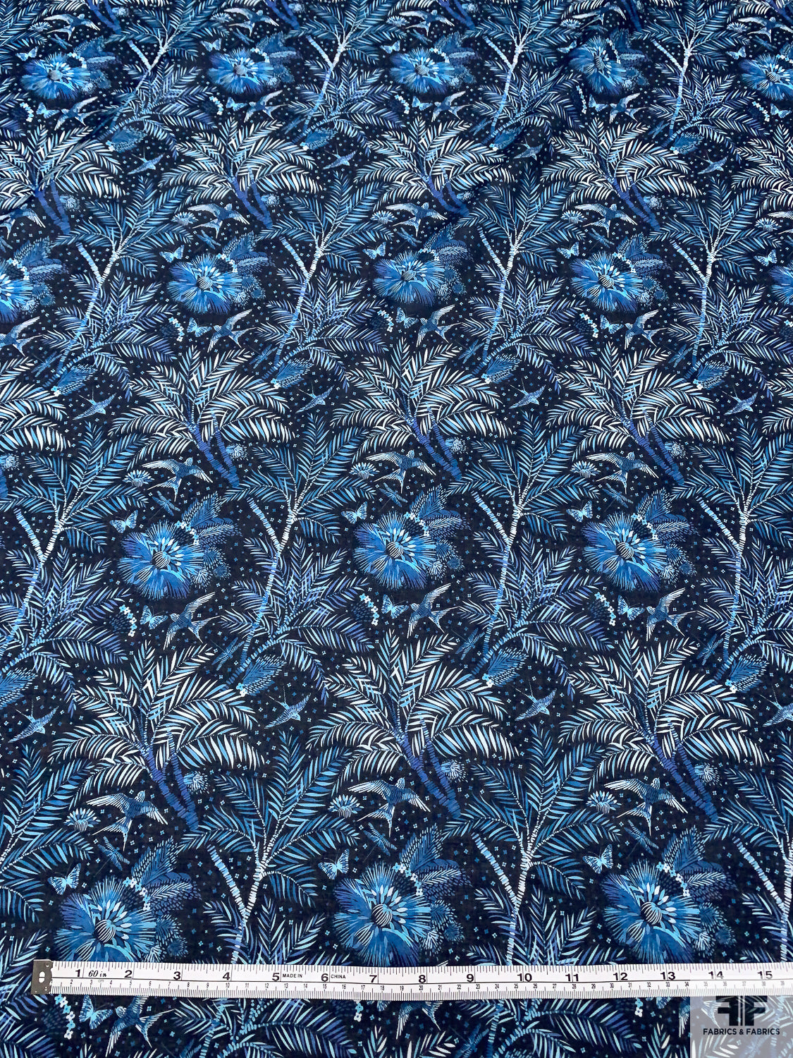 Tropical Floral Birds and Butterflies Printed Cotton Voile - Navy / Teal Blue / White
