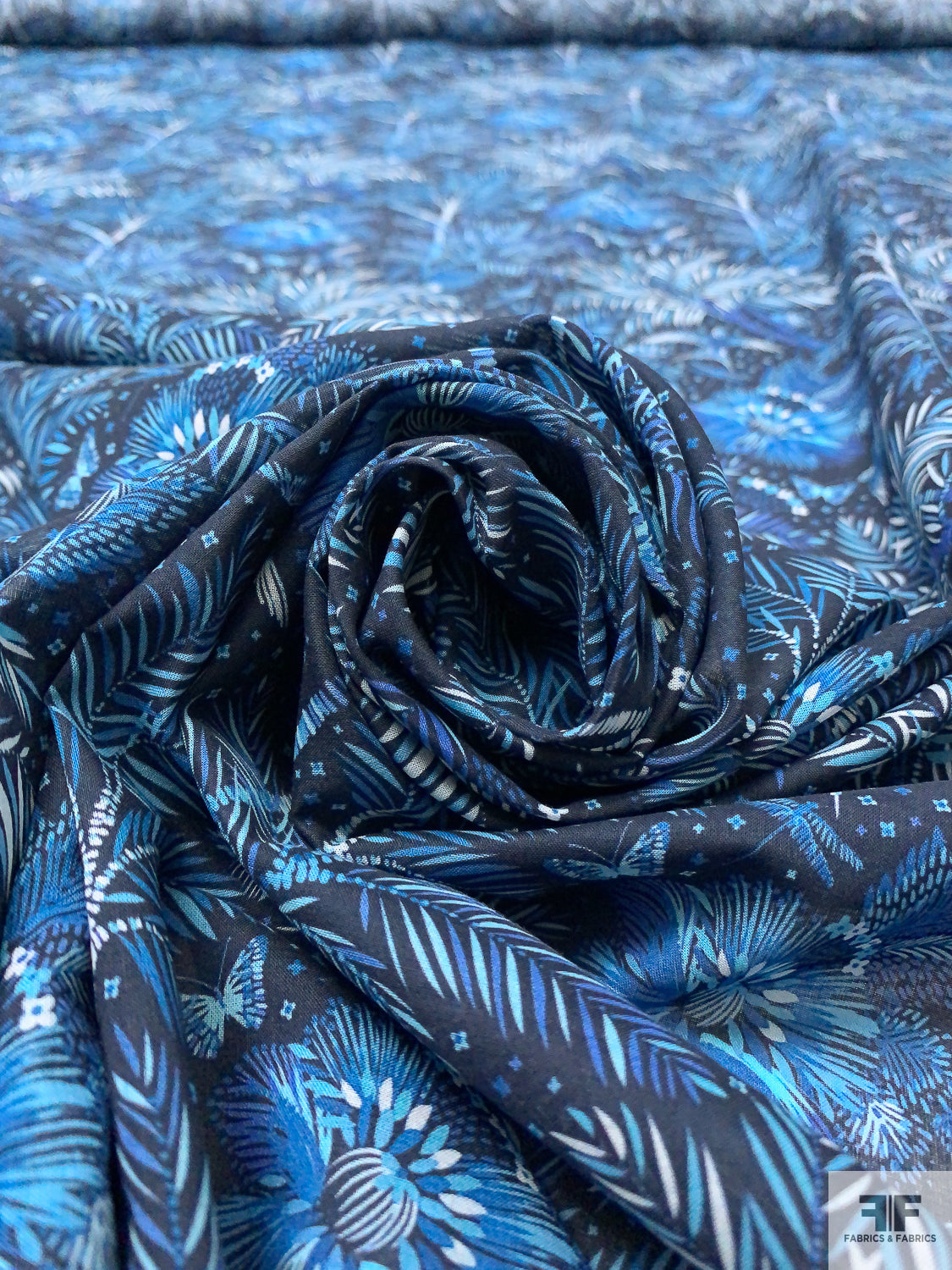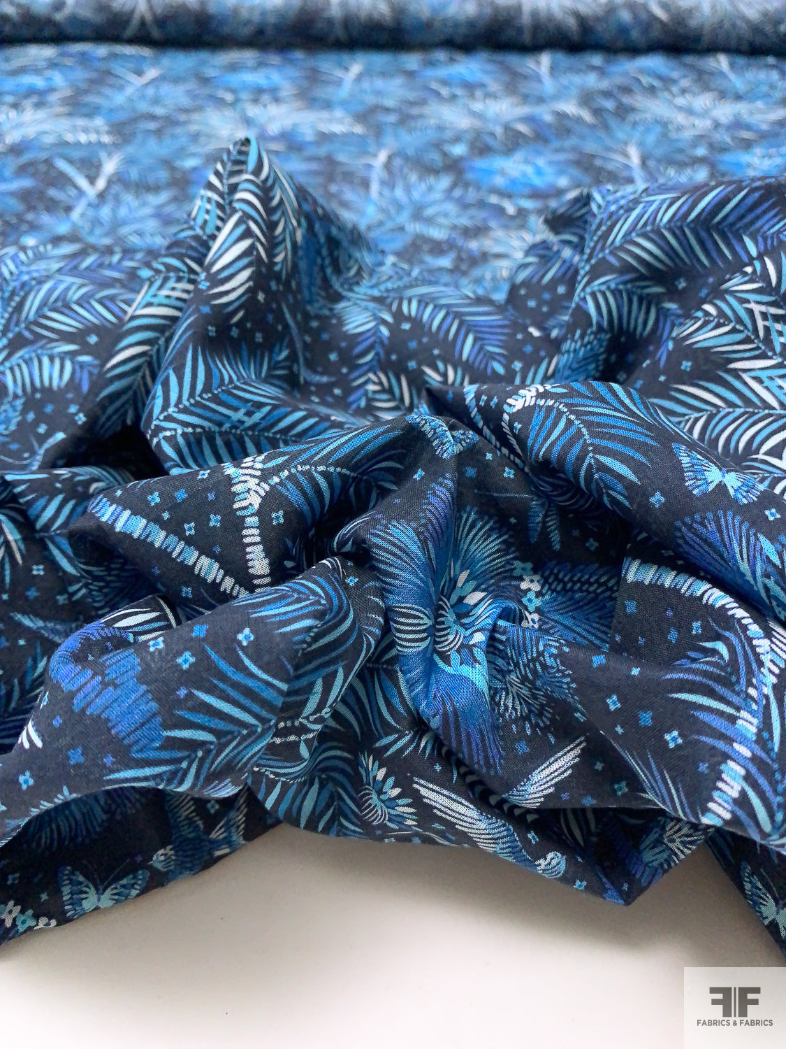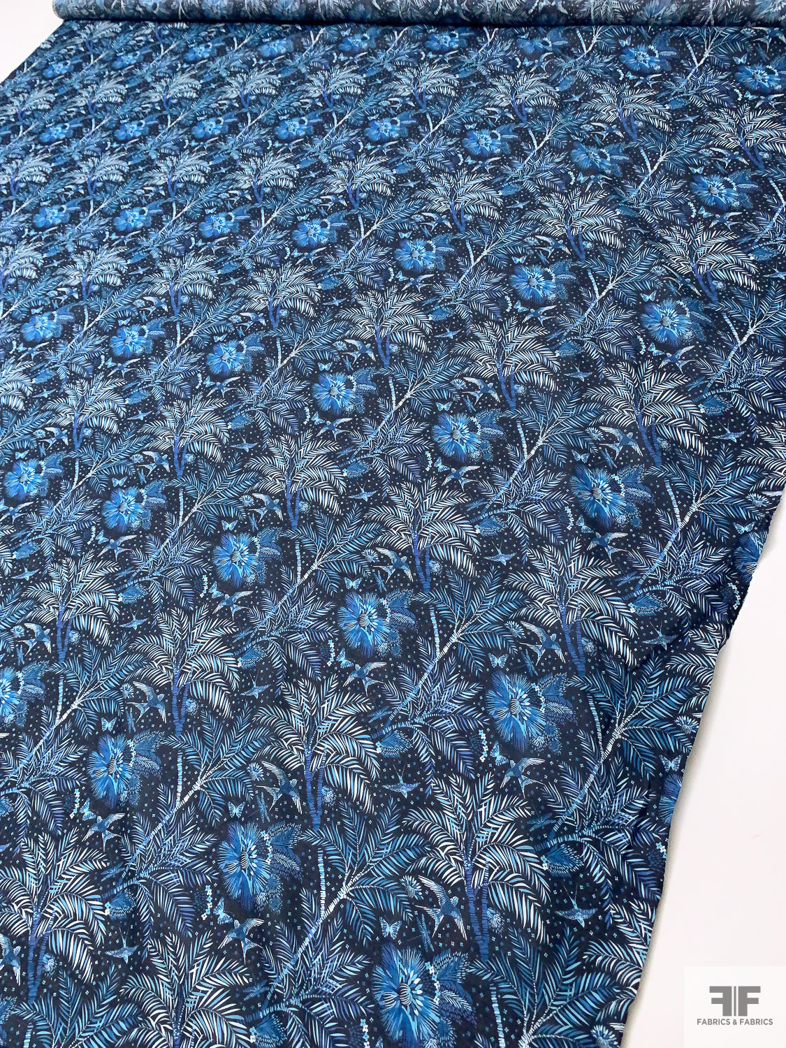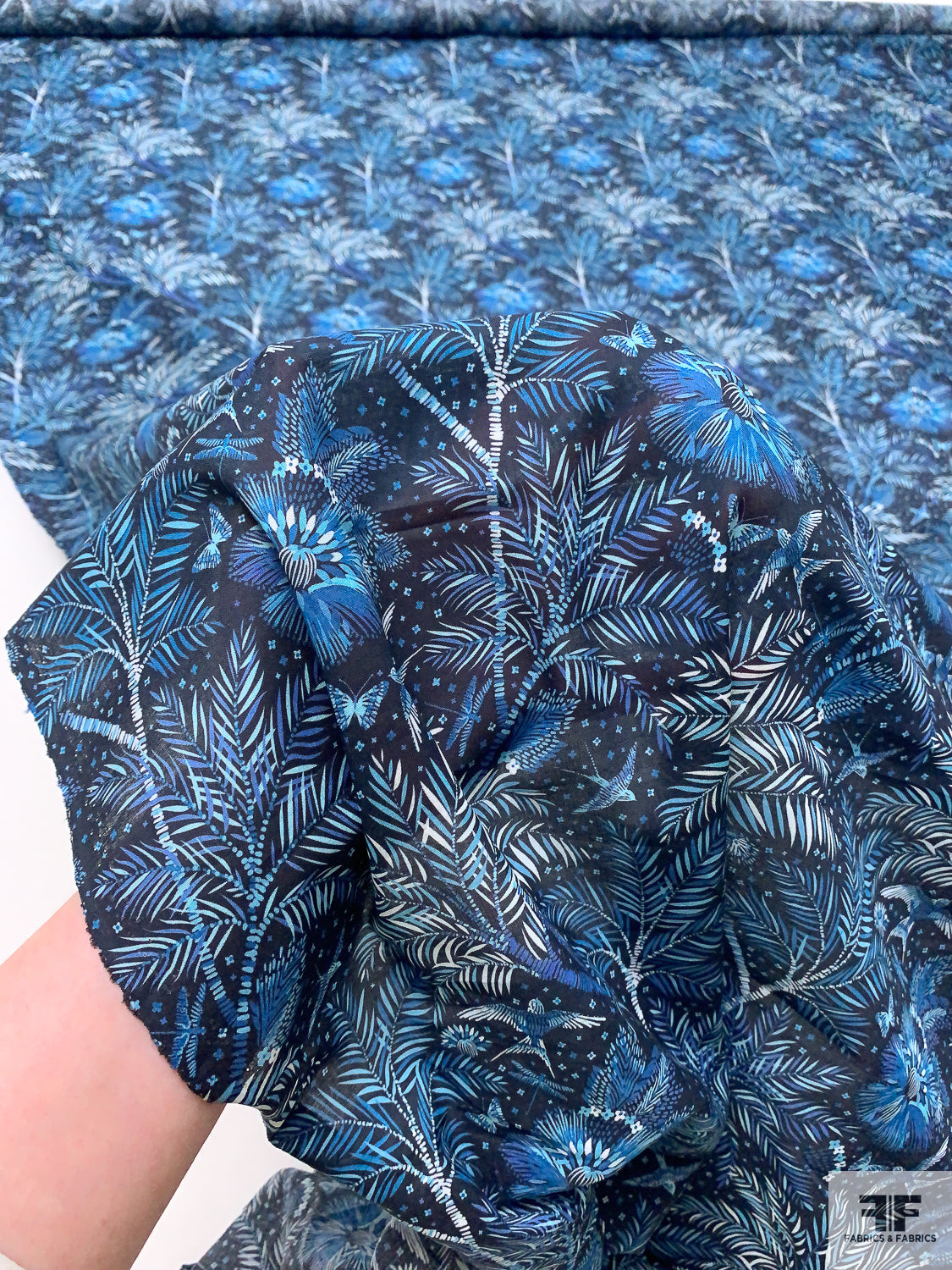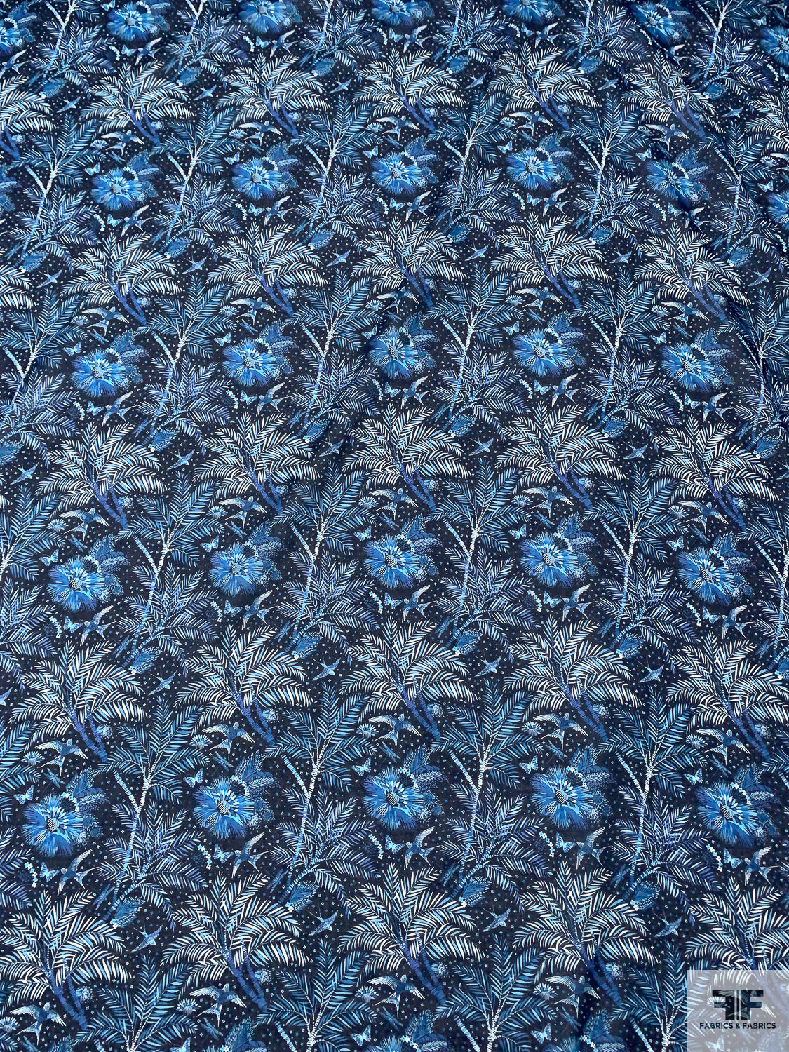 Tropical Floral Birds and Butterflies Printed Cotton Voile - Navy / Teal Blue / White