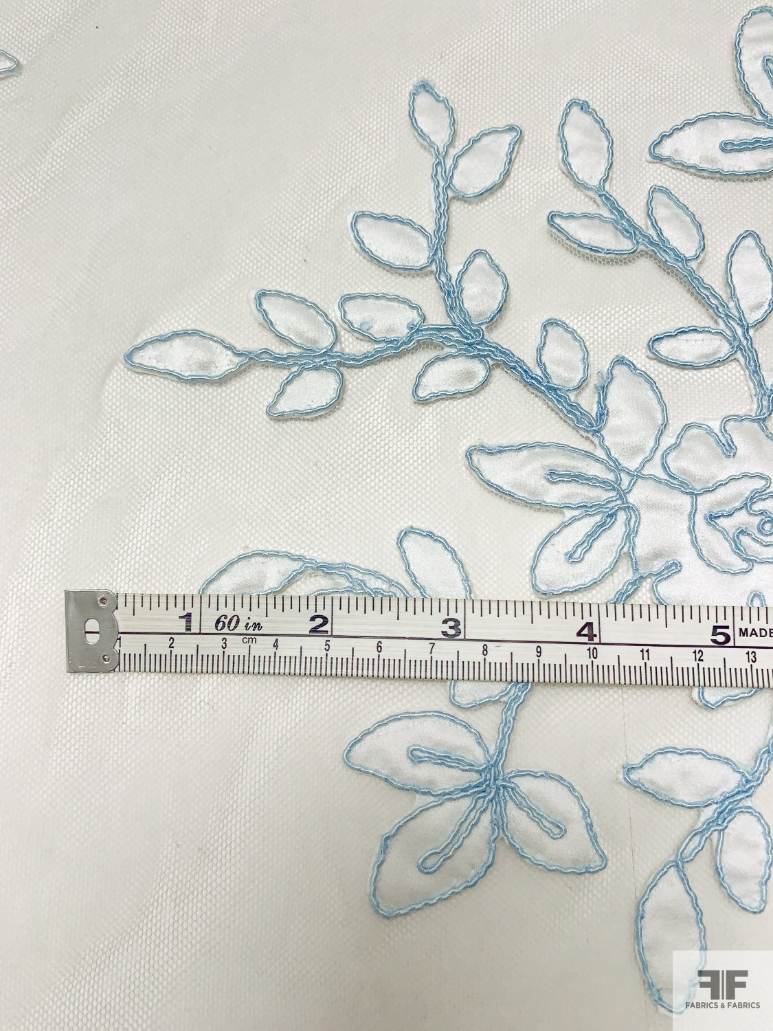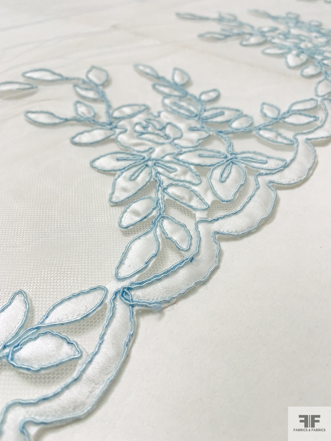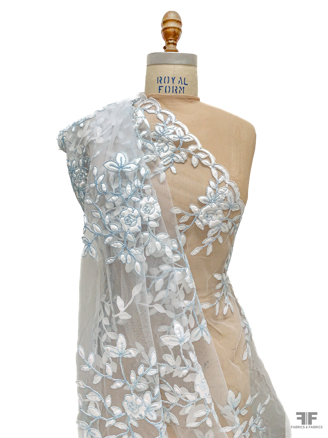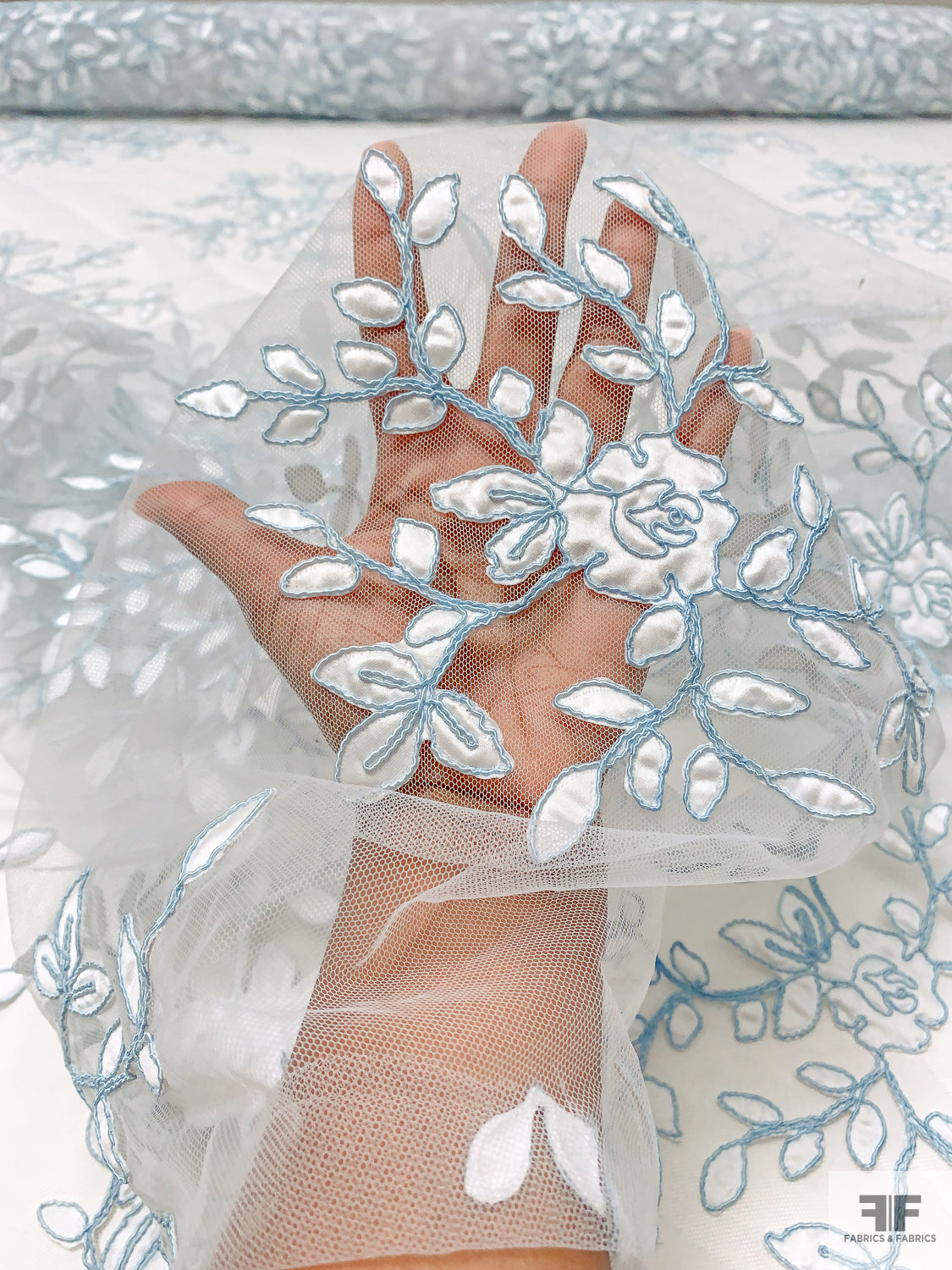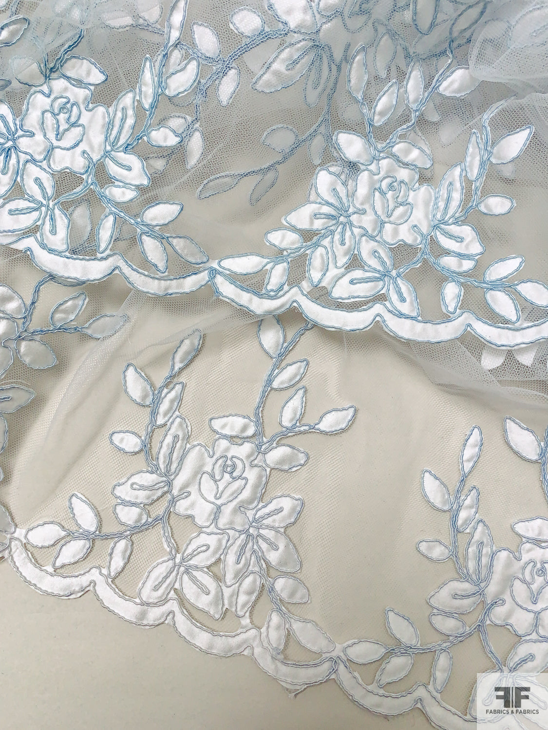 Floral Motif Appliqué and Cording on Tulle - Light Blue / White