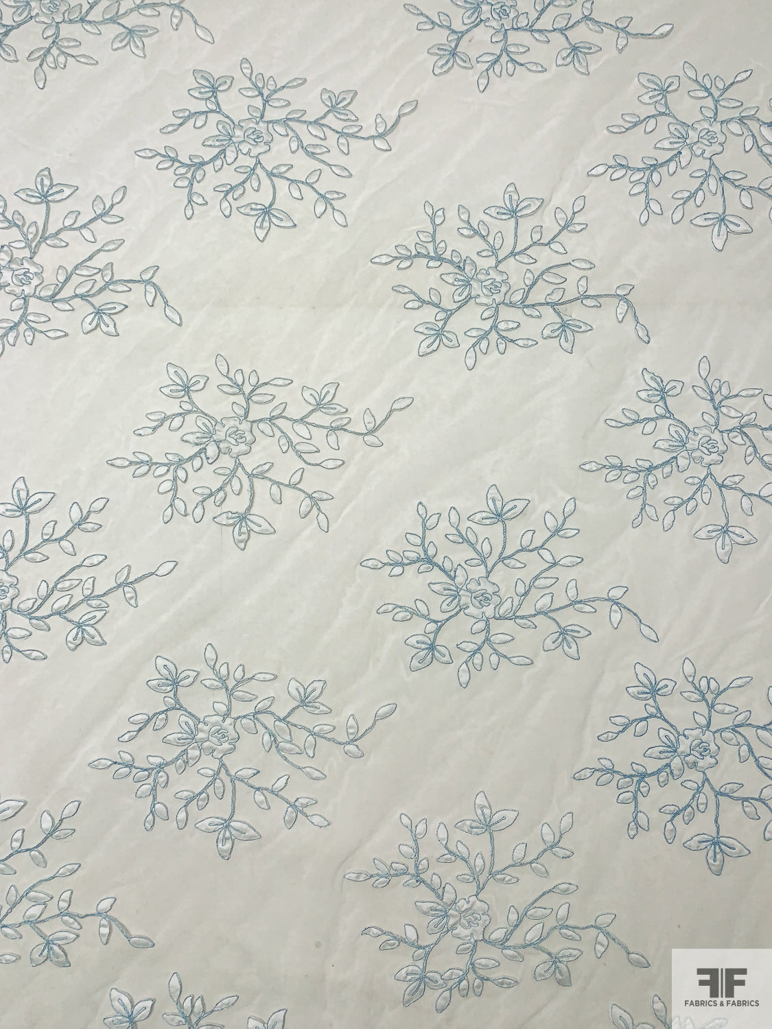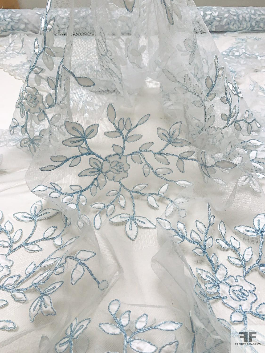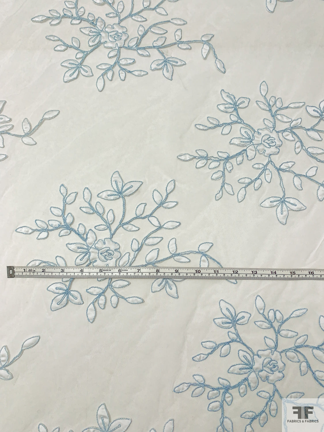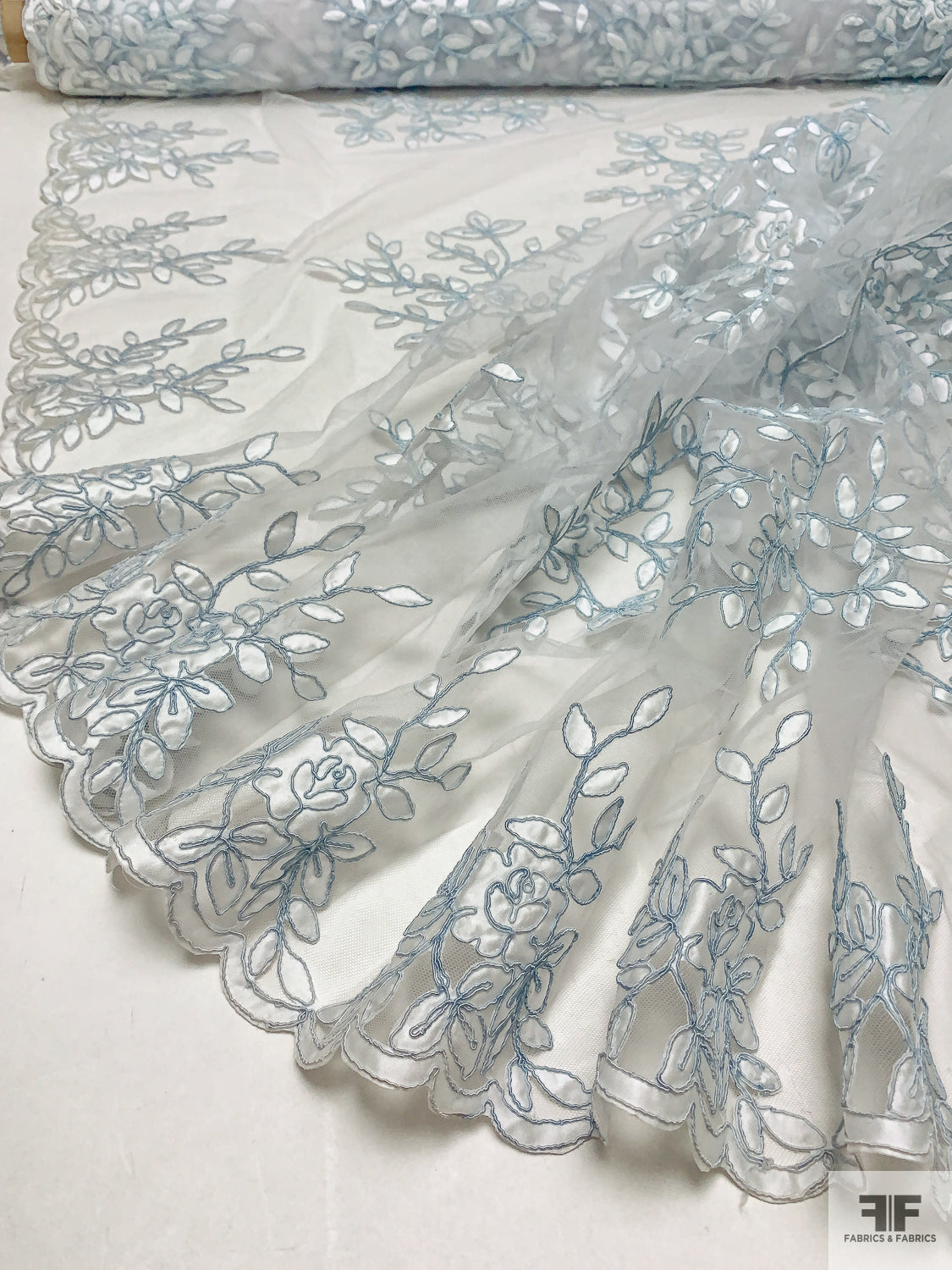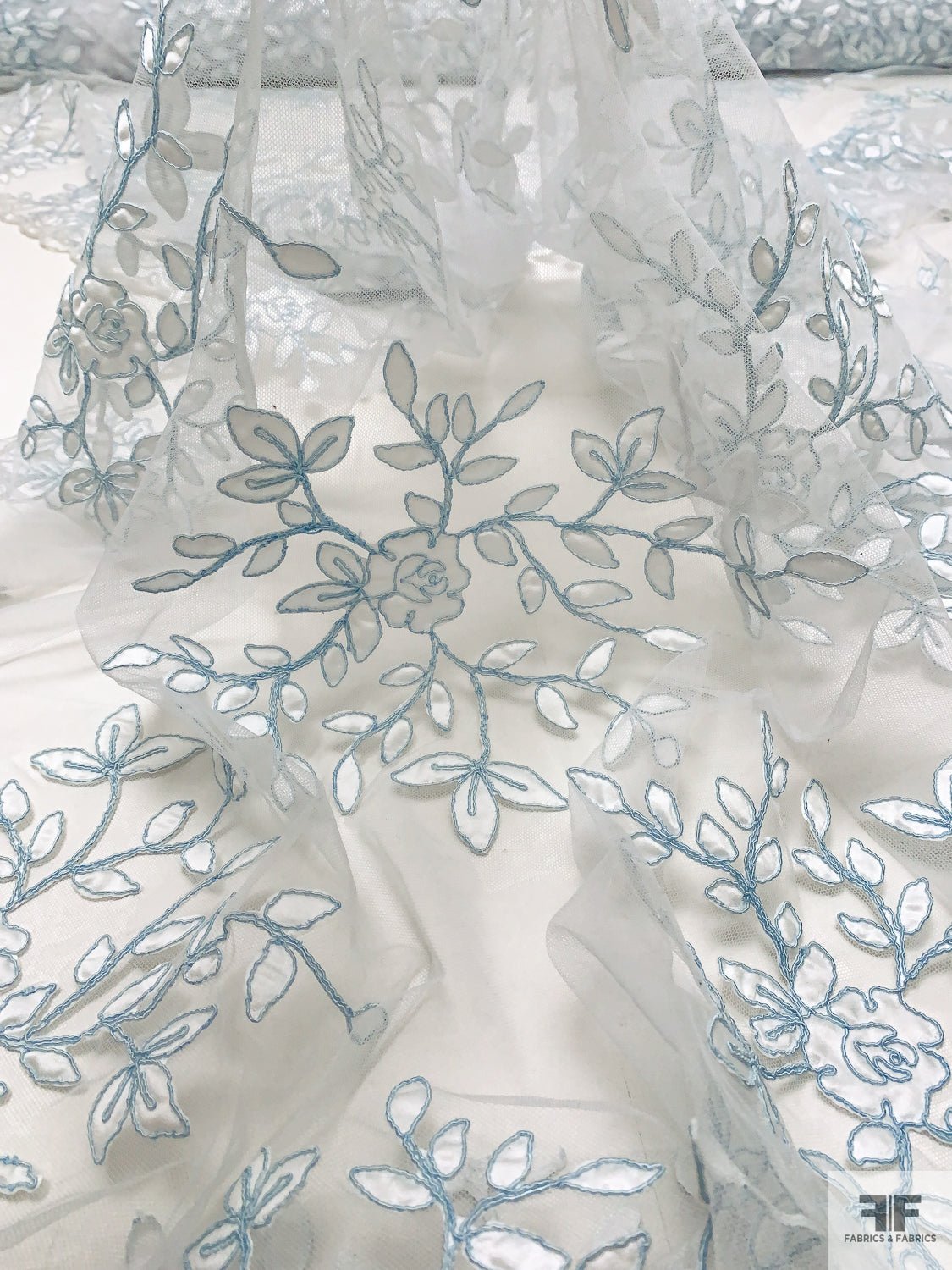 Floral Motif Appliqué and Cording on Tulle - Light Blue / White