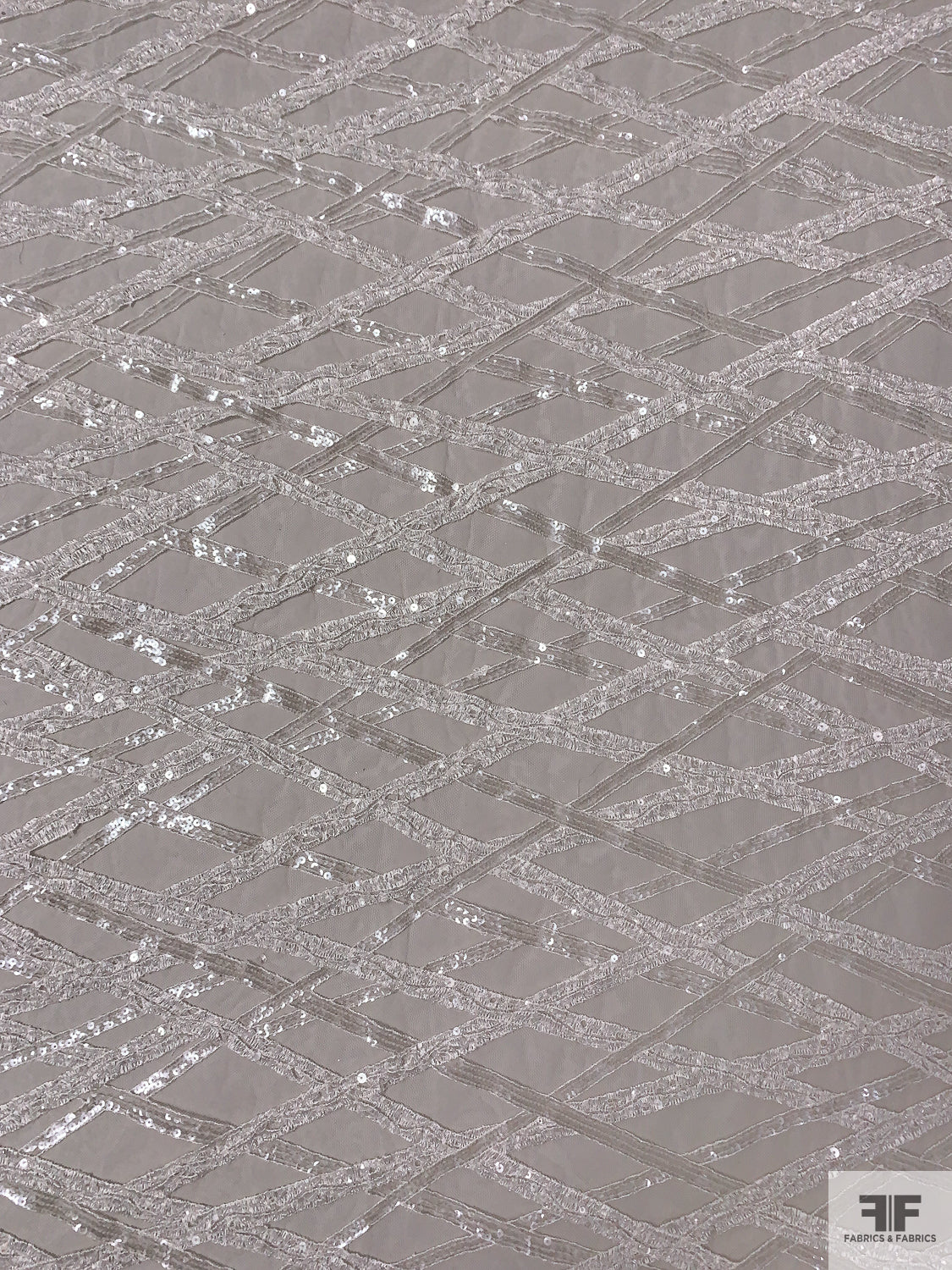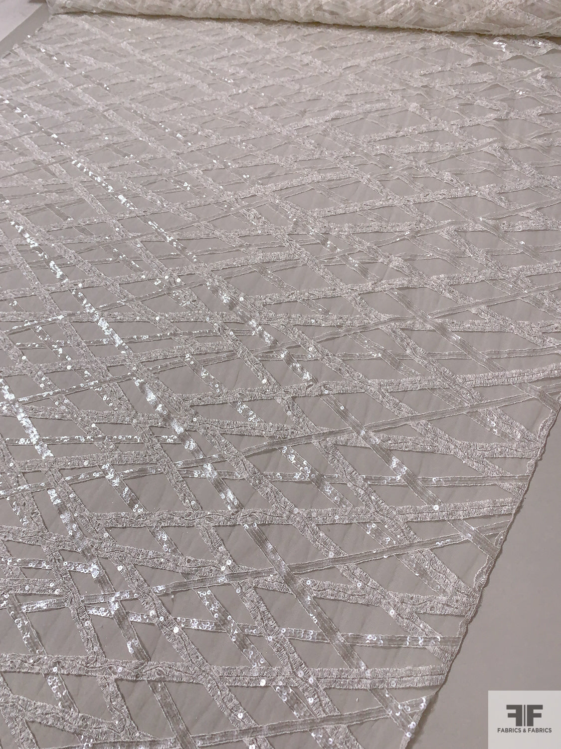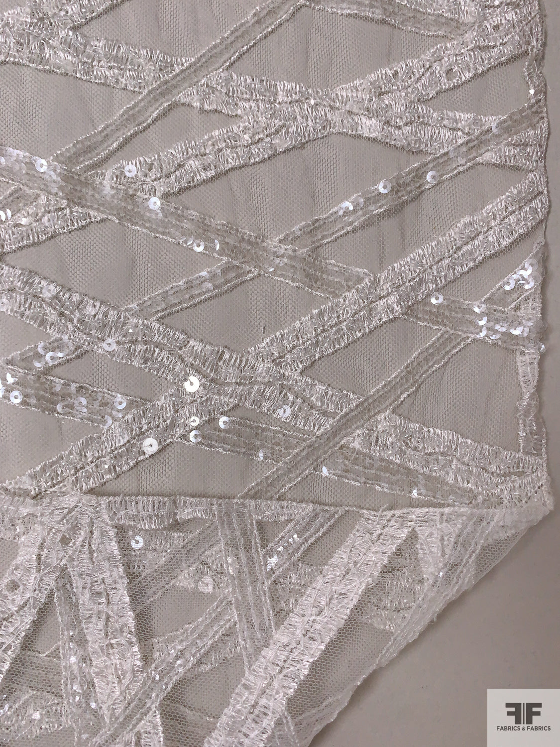 Made in Netherlands Crosshatch Embriodered Tulle with Sequins and Beads - Off-White