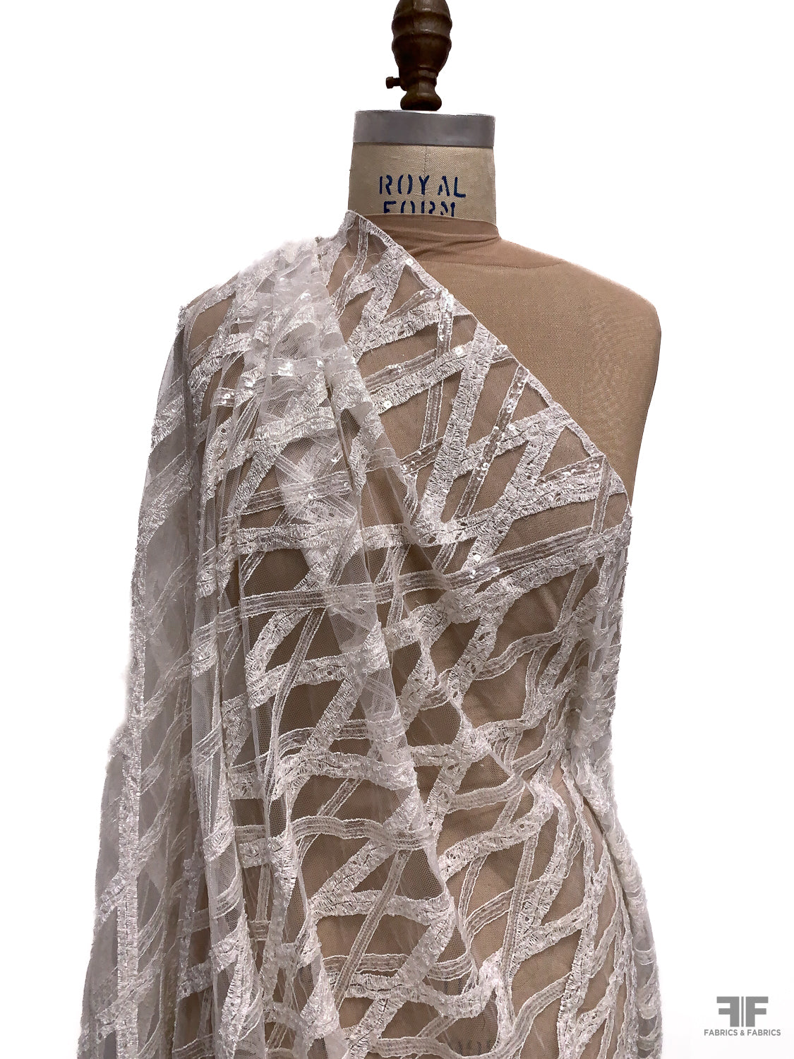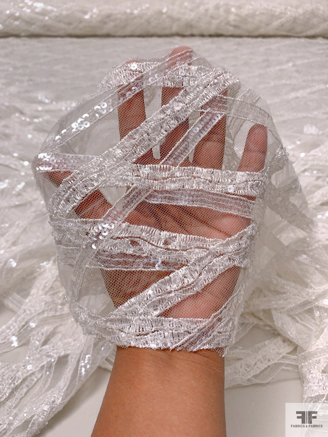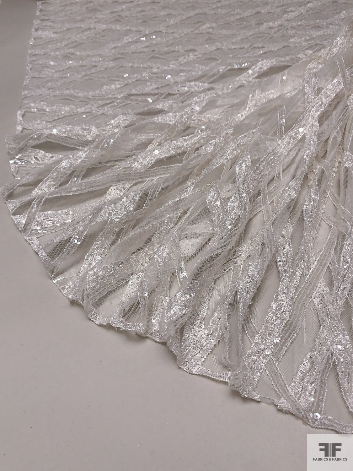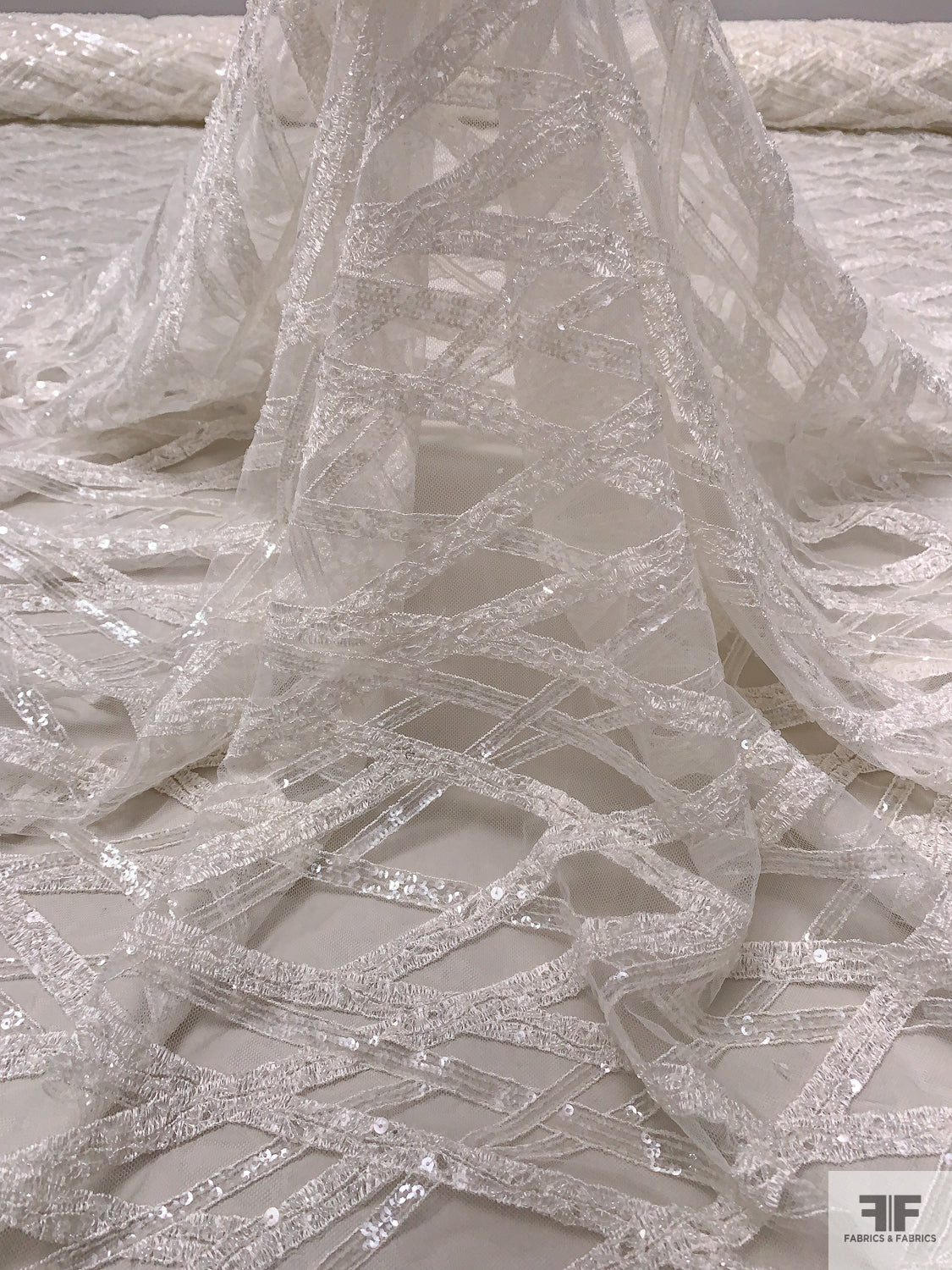 Made in Netherlands Crosshatch Embriodered Tulle with Sequins and Beads - Off-White