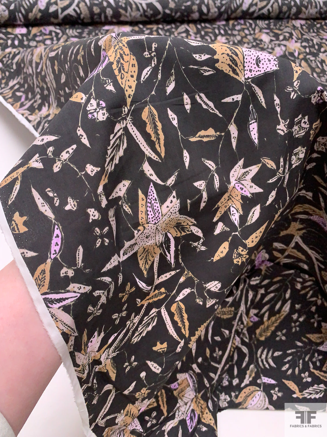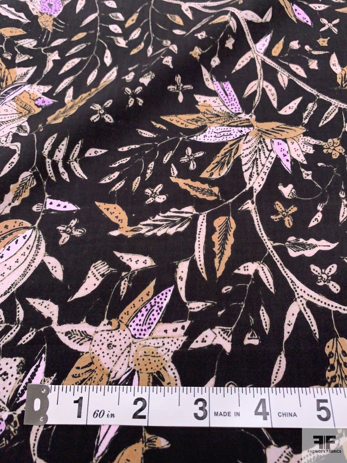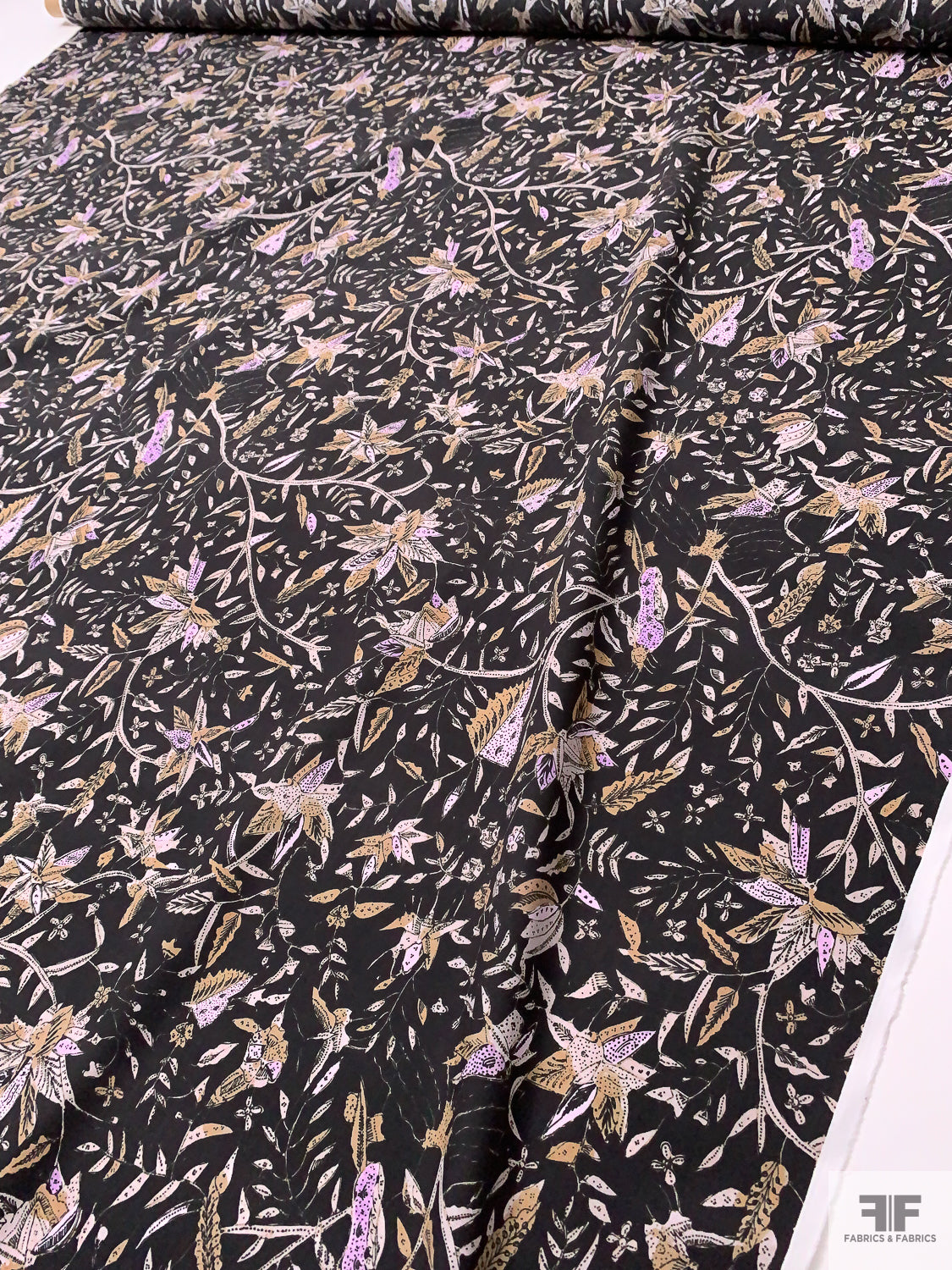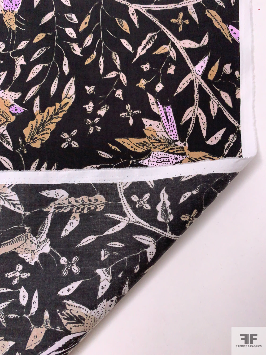 Floral Leaf Stems Printed Cotton Poplin - Tan / Black / Wisteria