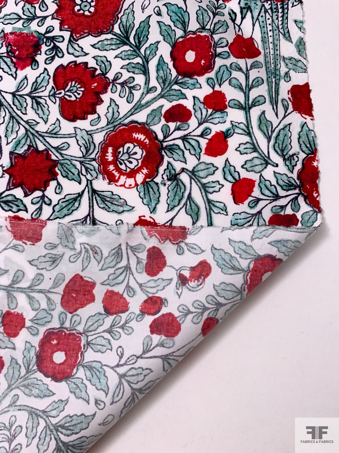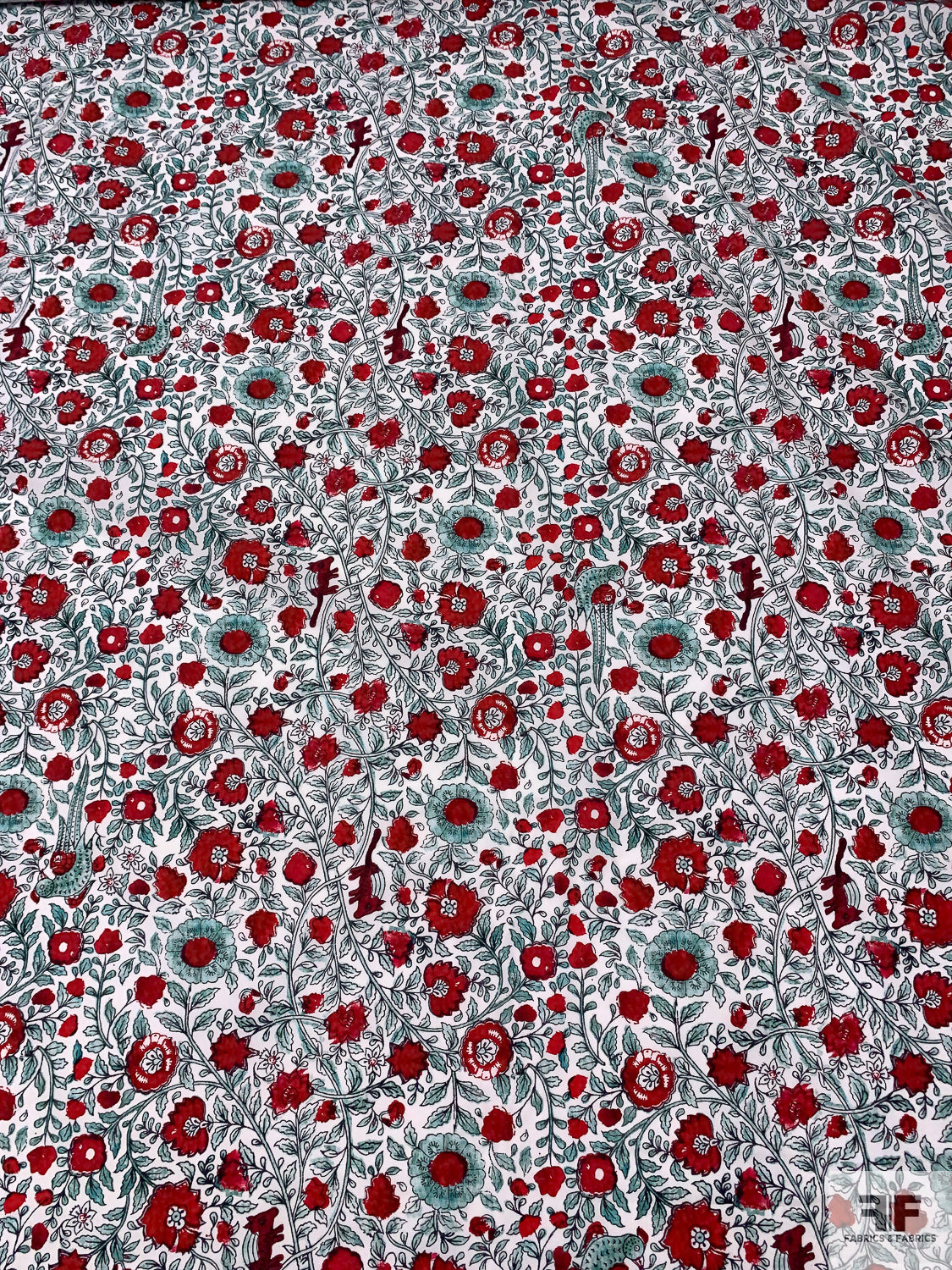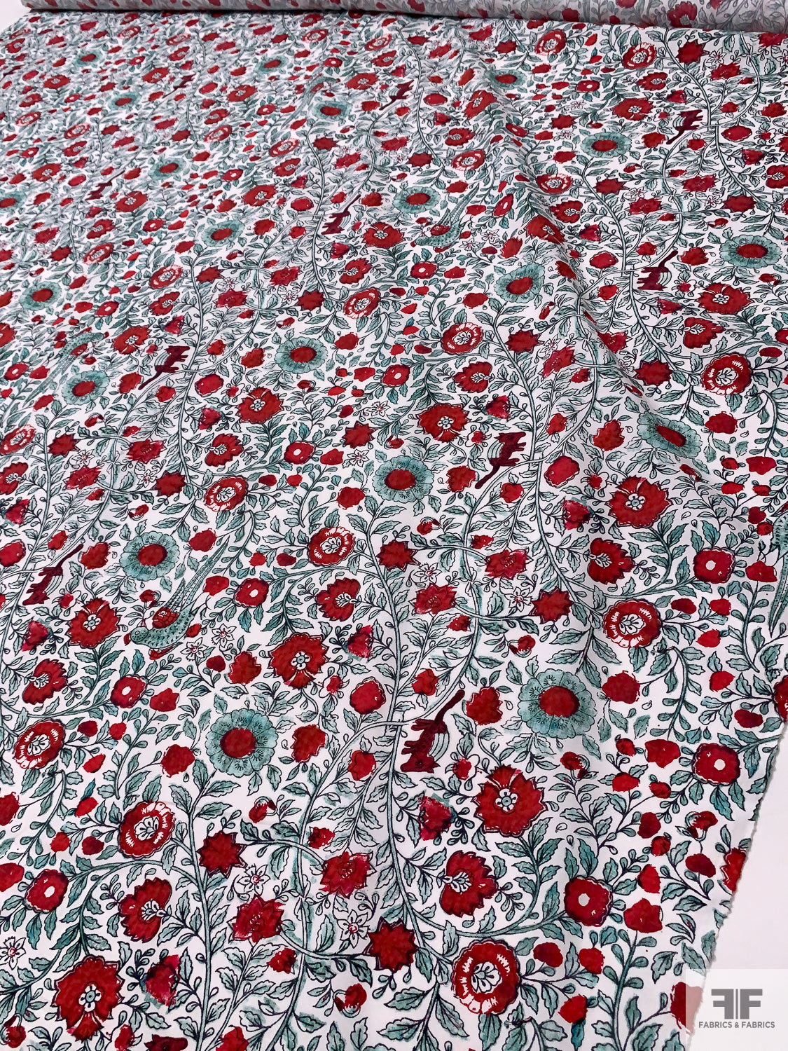 Floral Vines and Birds Printed Cotton Poplin - Red / Seafoam / White