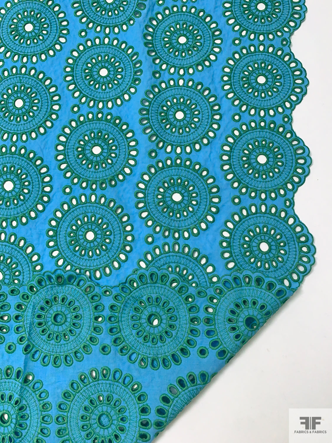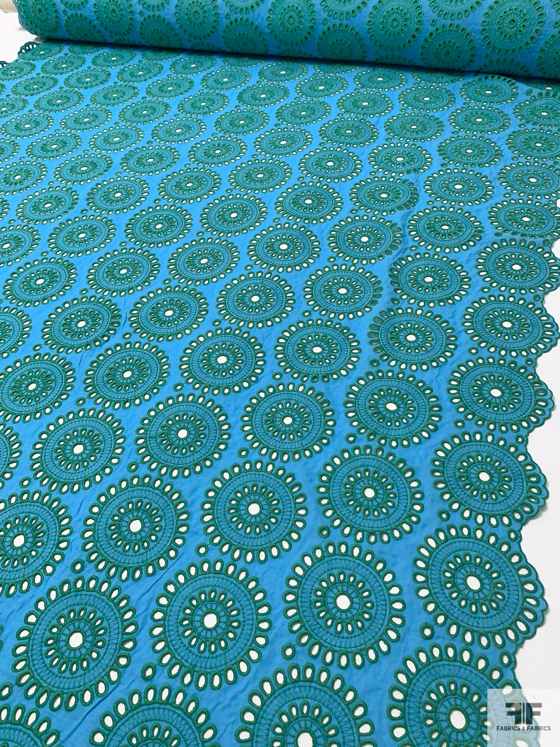 Floral Medallions Embroidered Eyelet Heavy Cotton Voile - Turquoise / Green
