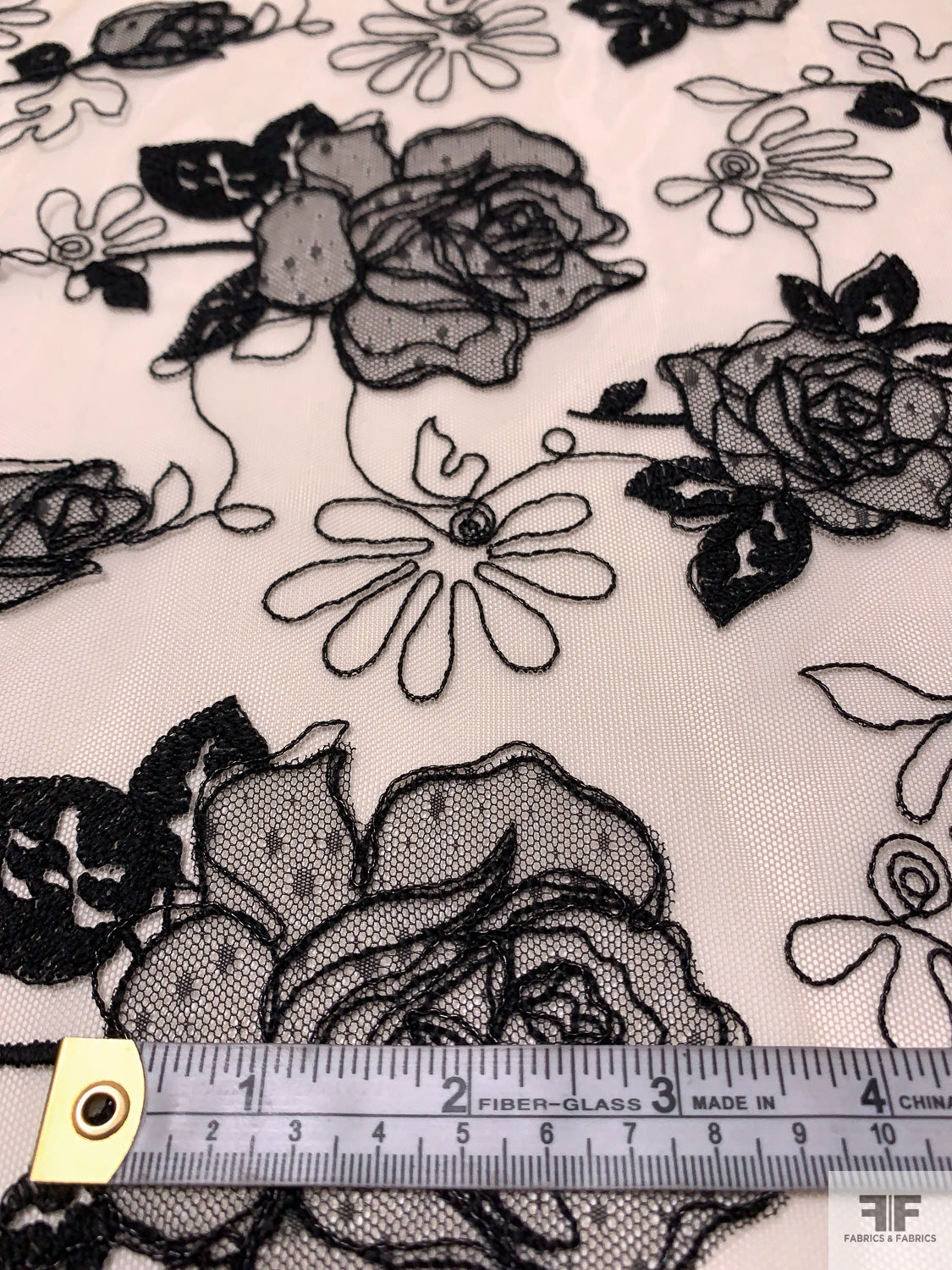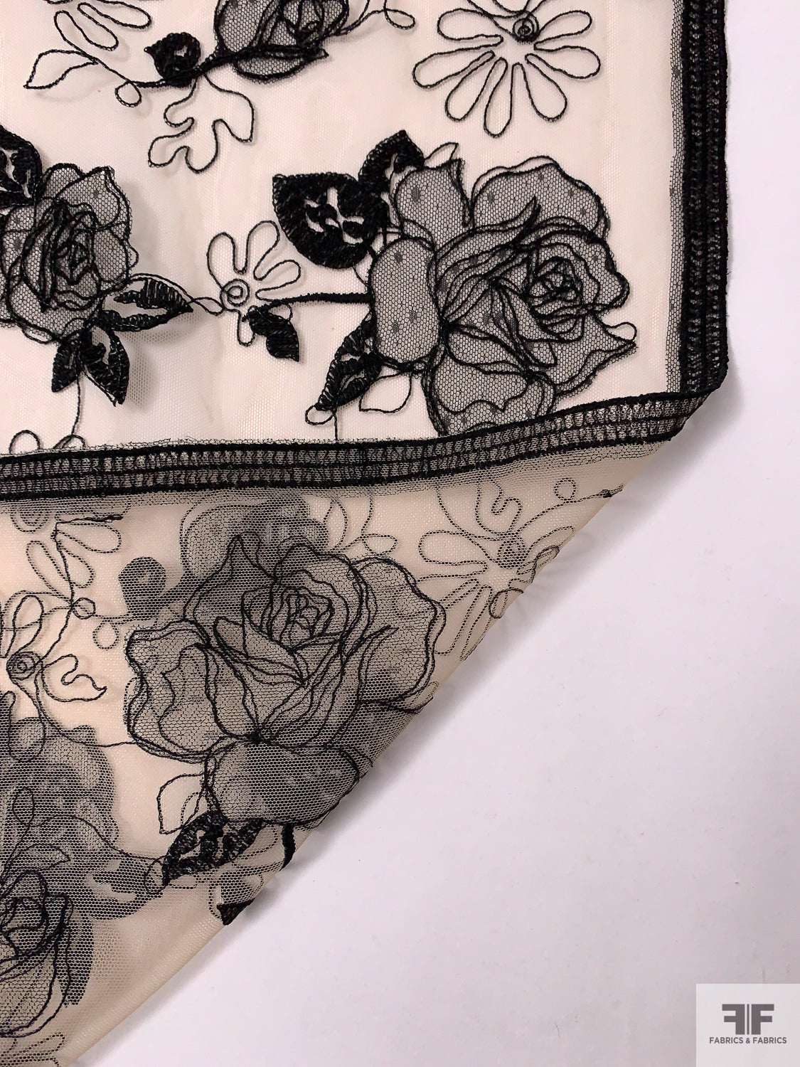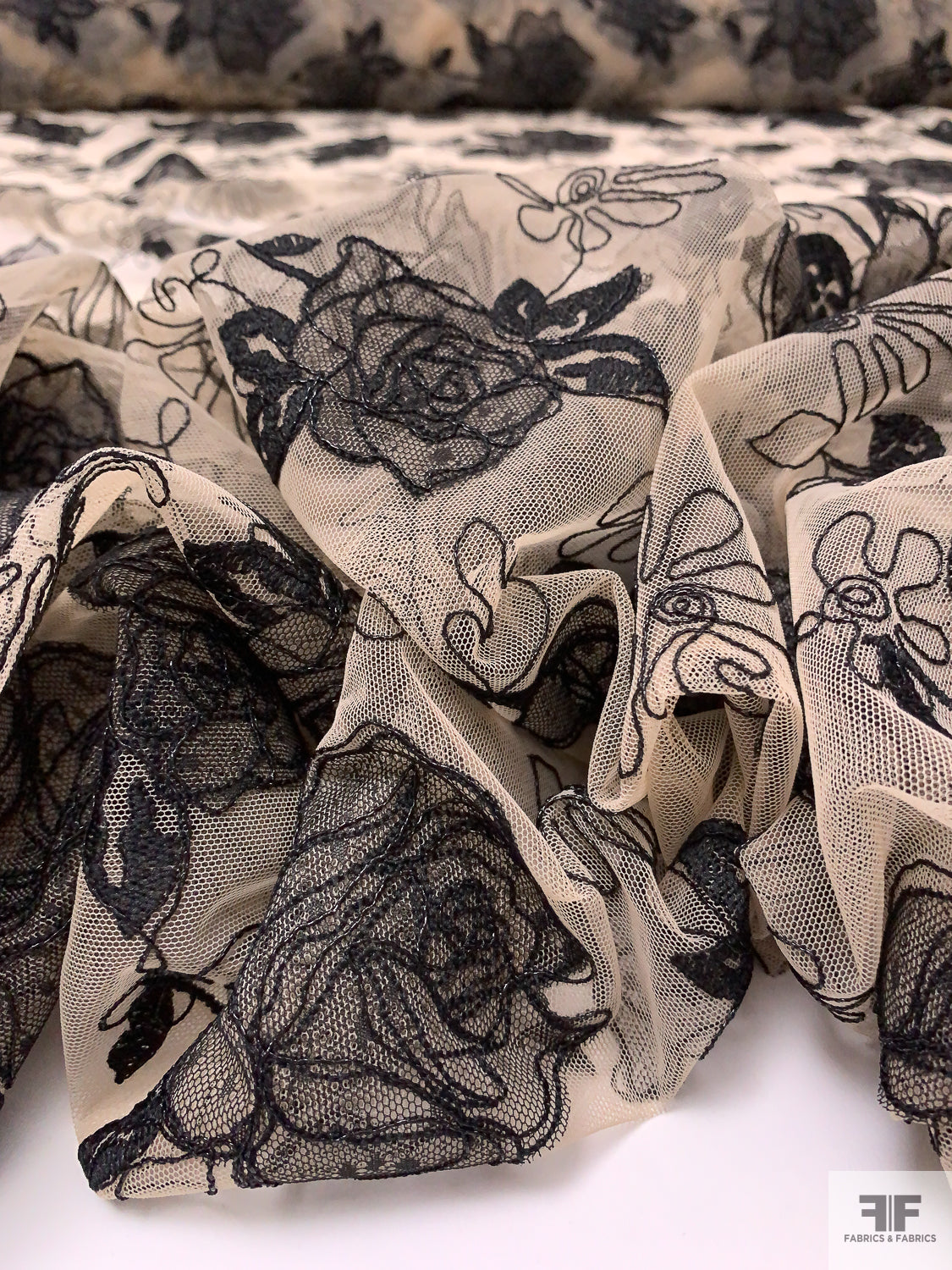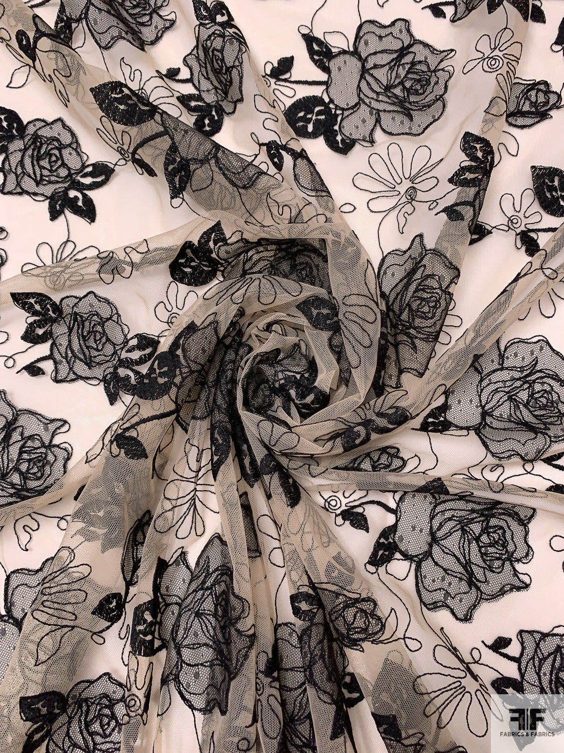 Floral Embroidered Soft Tulle with Metallic Cording - Nude / Black
