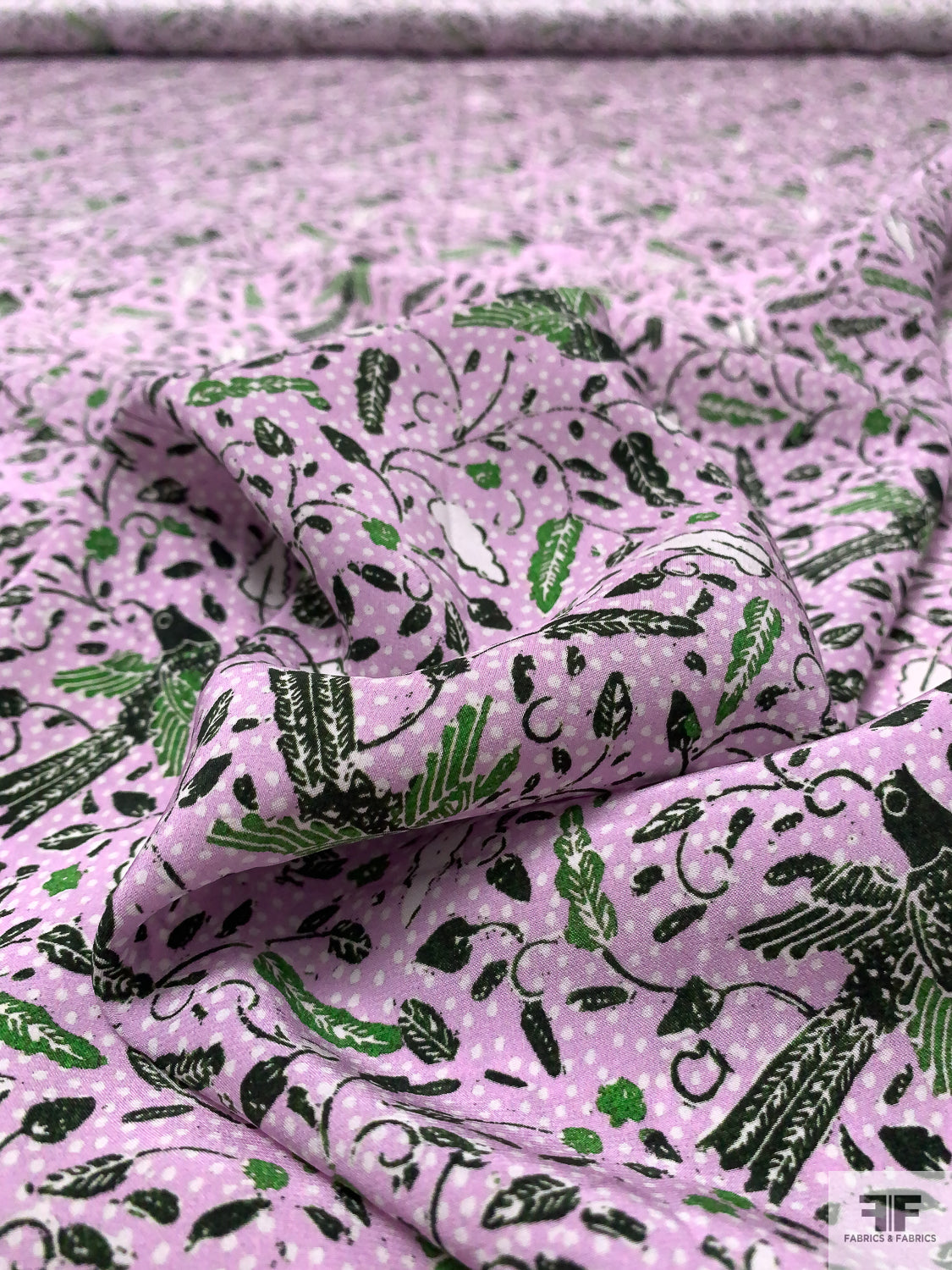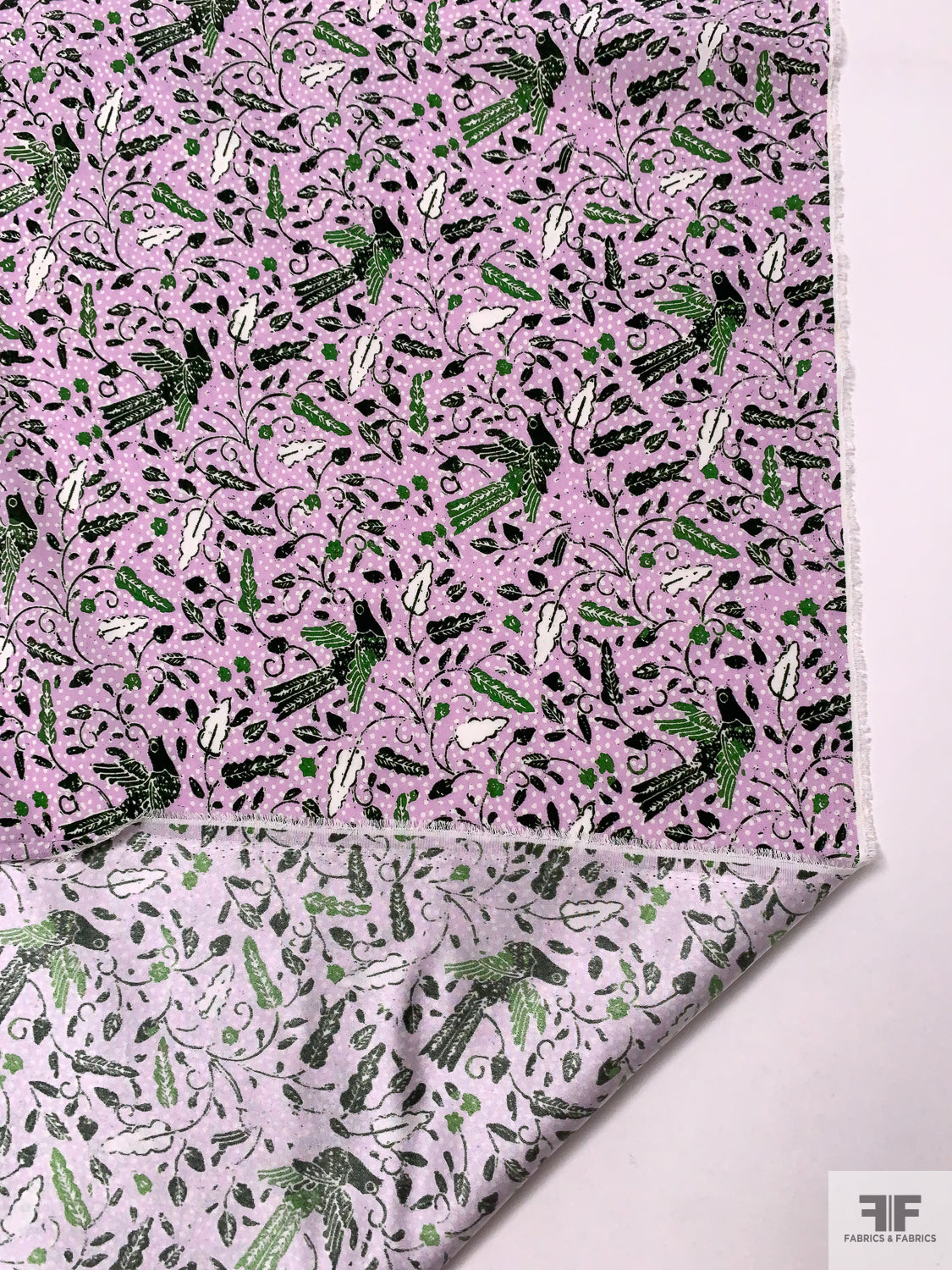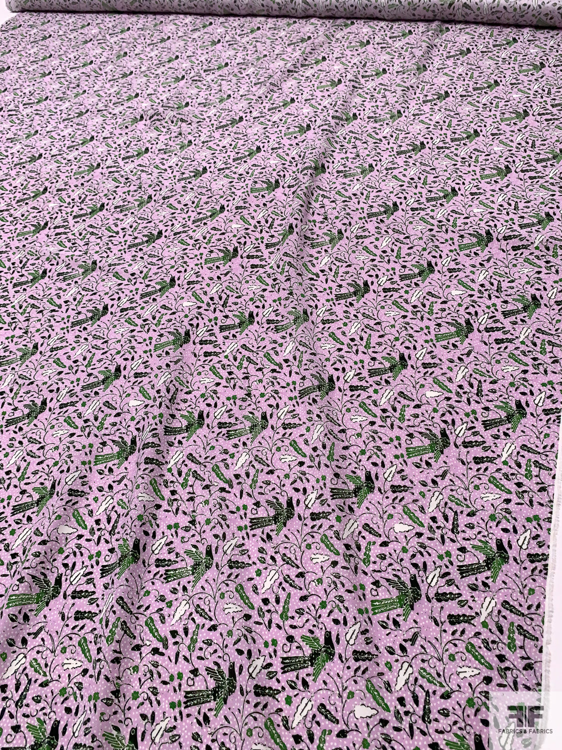 Birds and Ditsy Leaf Matte-Side Printed Silk Charmeuse - Light Lilac / Green / White / Black