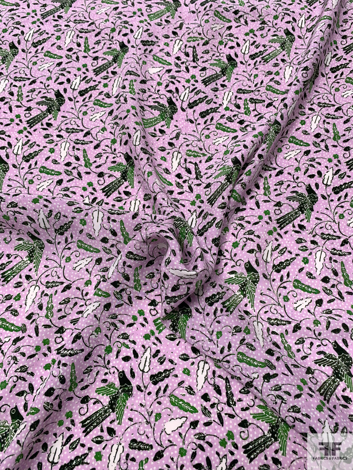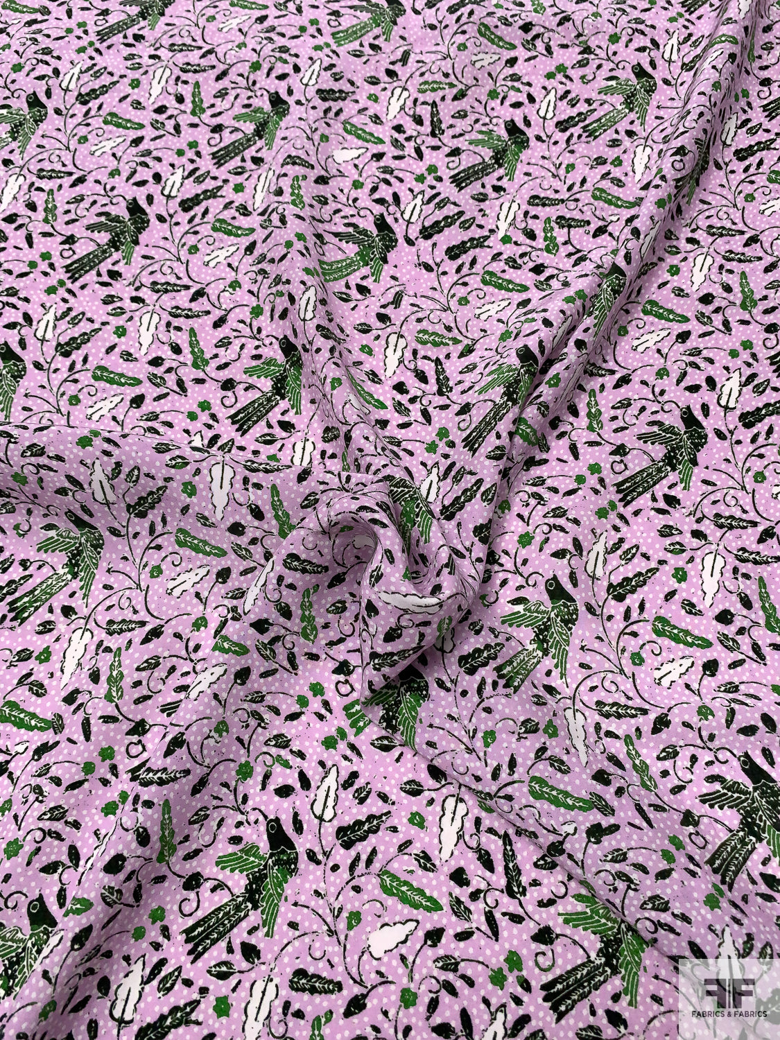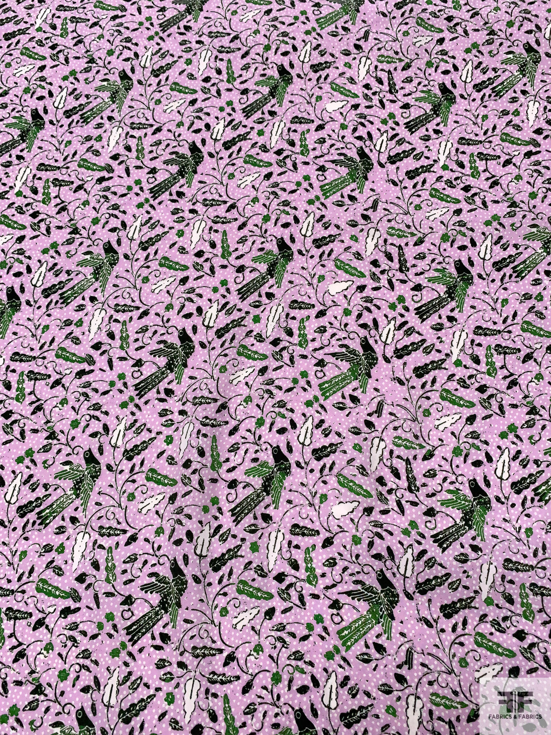 Birds and Ditsy Leaf Matte-Side Printed Silk Charmeuse - Light Lilac / Green / White / Black