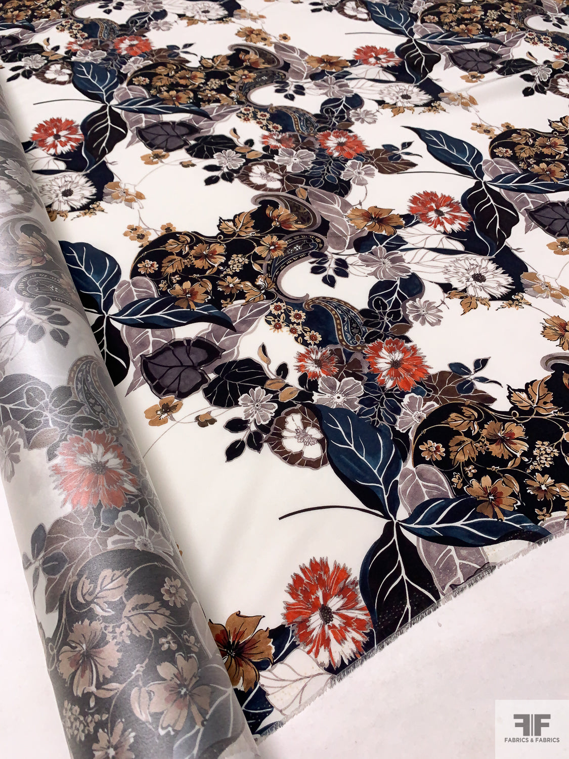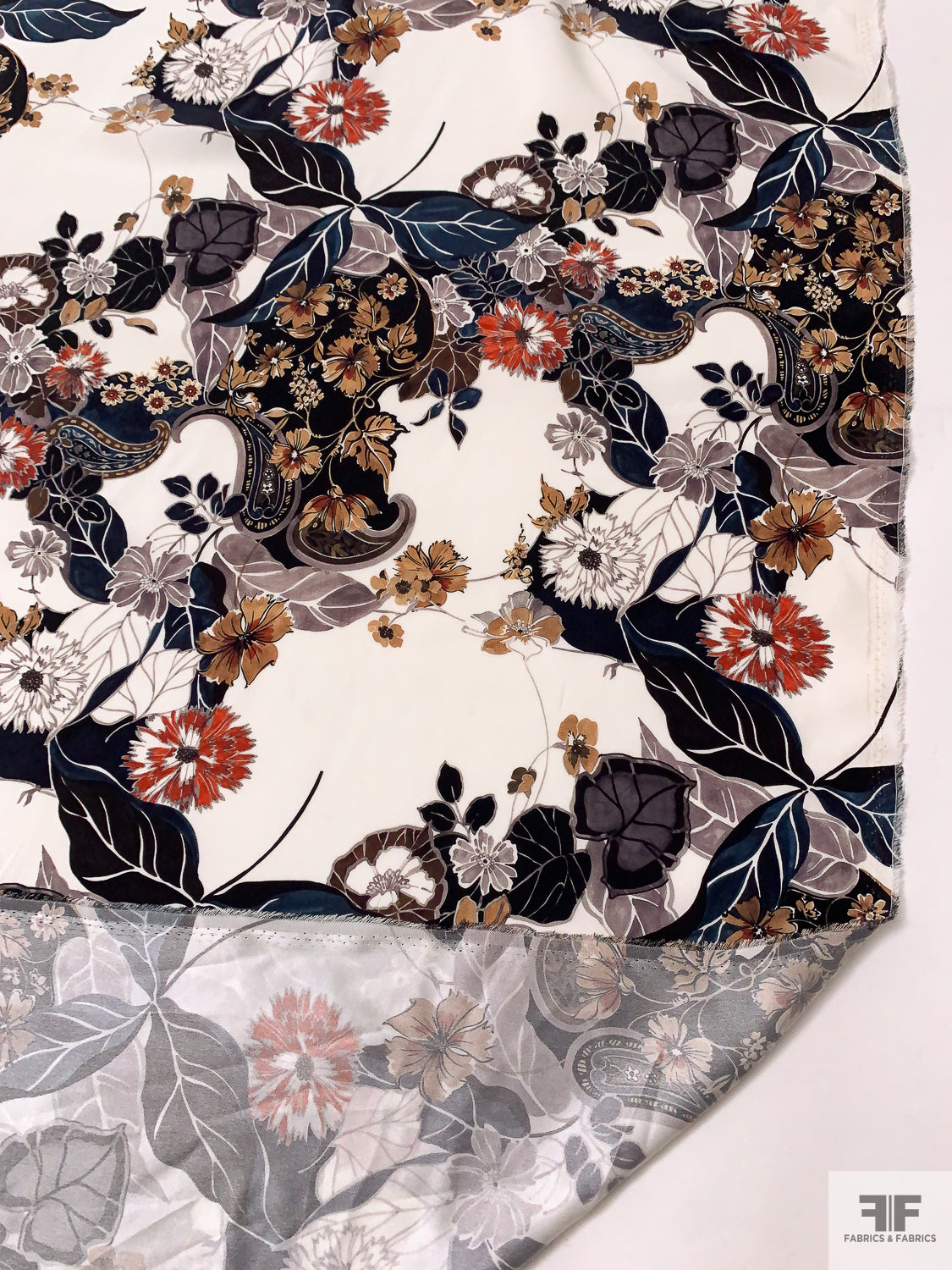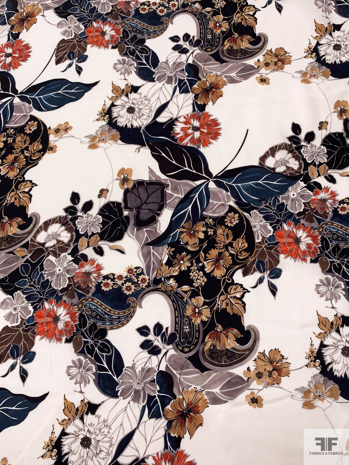 Exotic Paisley Floral Matte-Side Printed Silk Charmeuse - Ivory / Black / MIdnight Teal / Smokey Orange