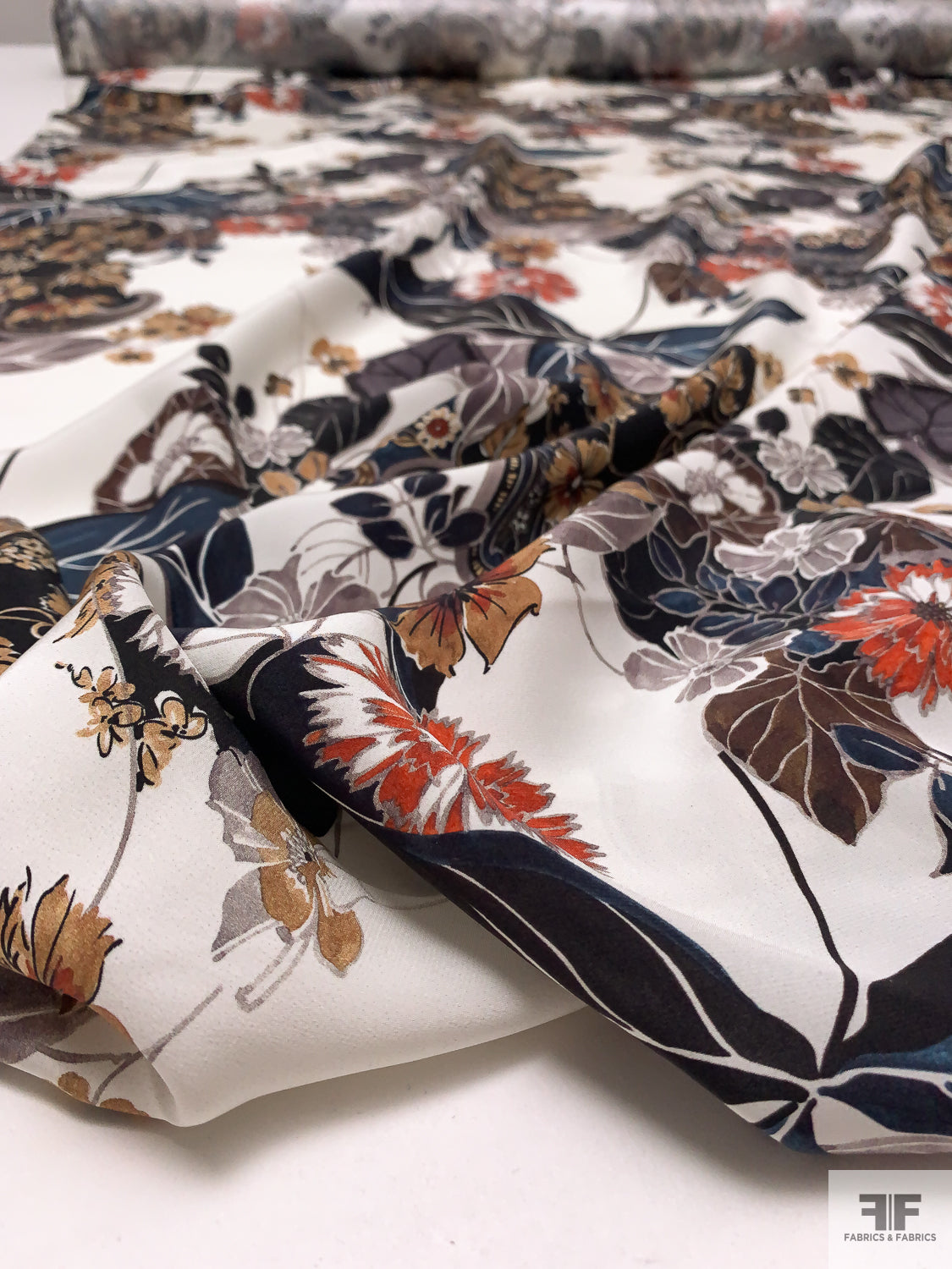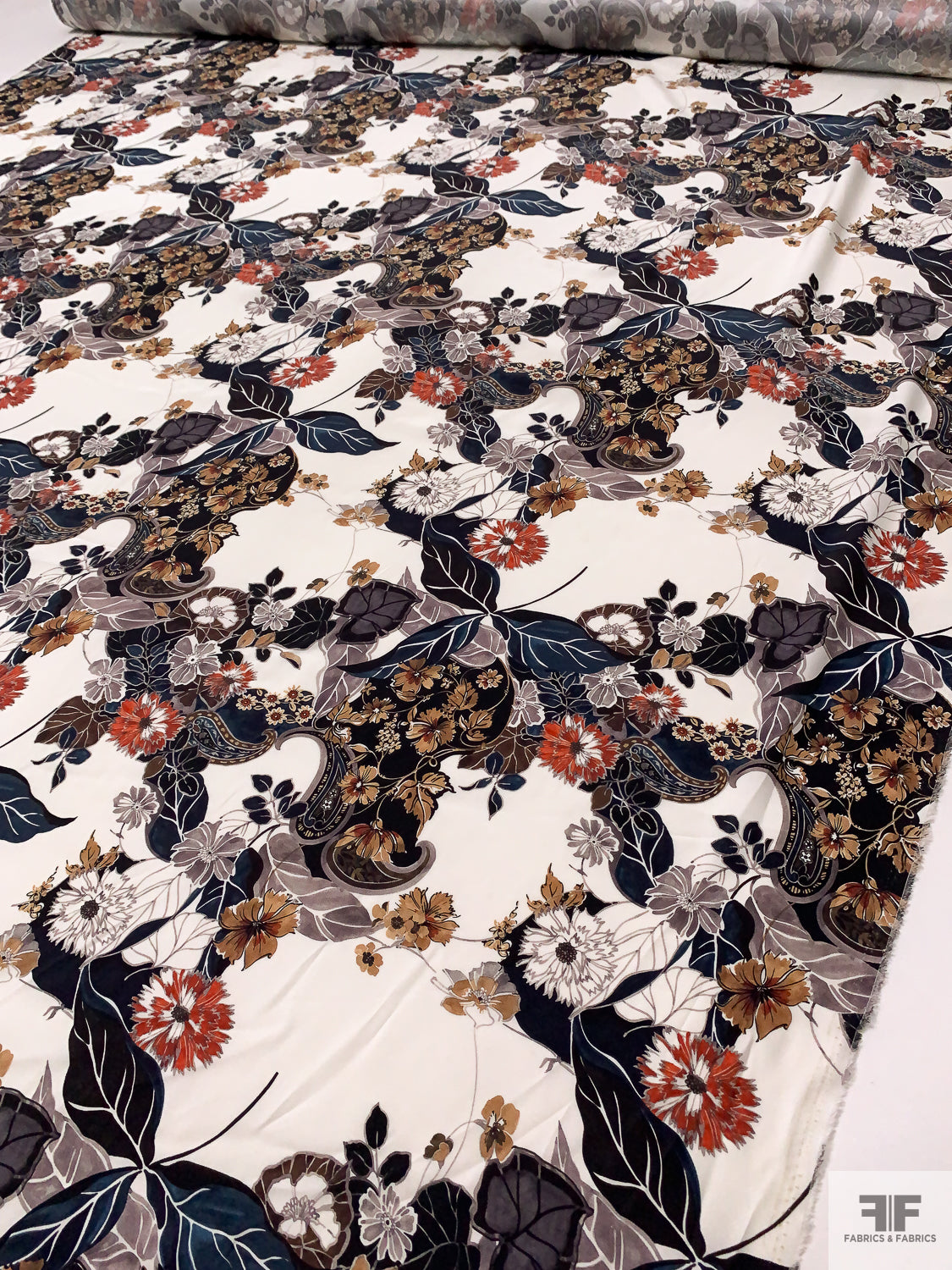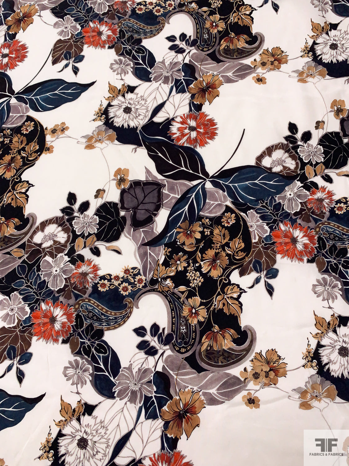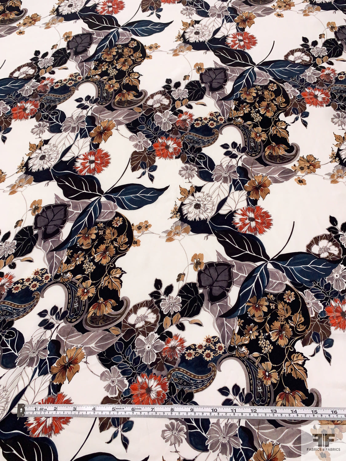 Exotic Paisley Floral Matte-Side Printed Silk Charmeuse - Ivory / Black / MIdnight Teal / Smokey Orange