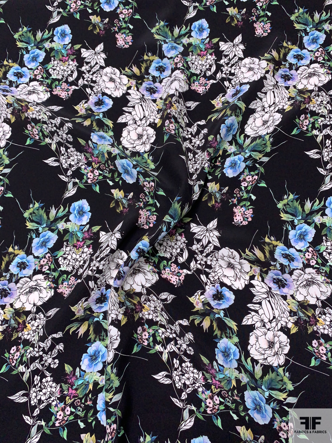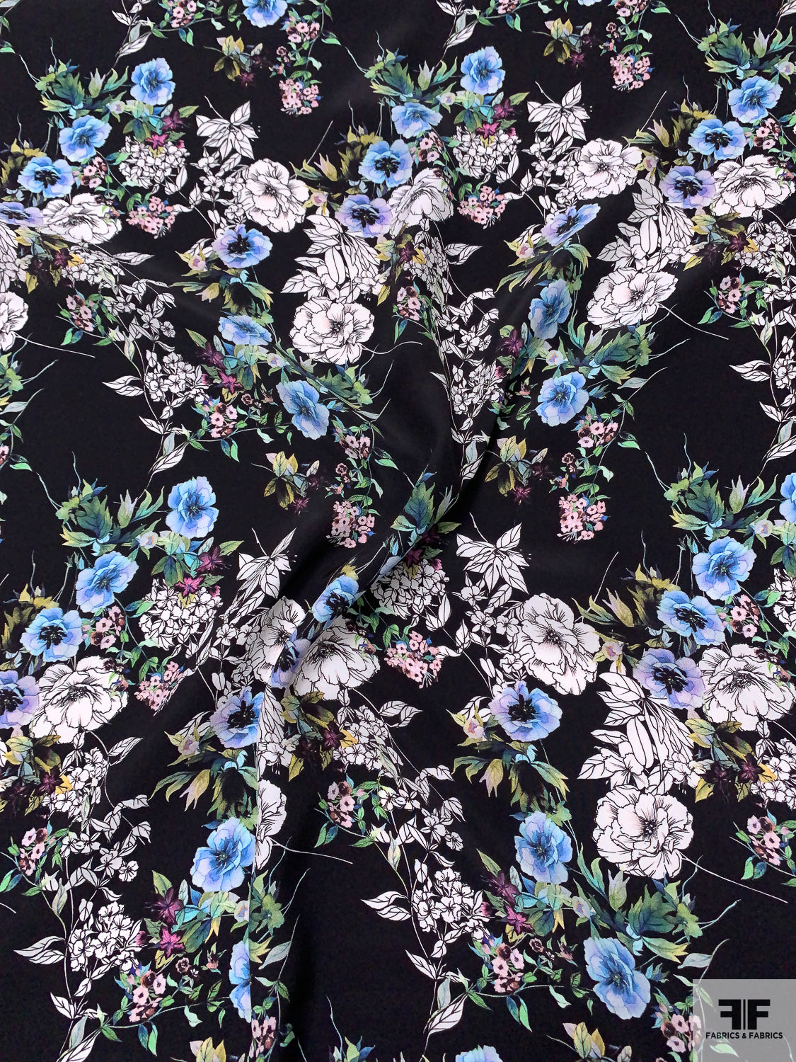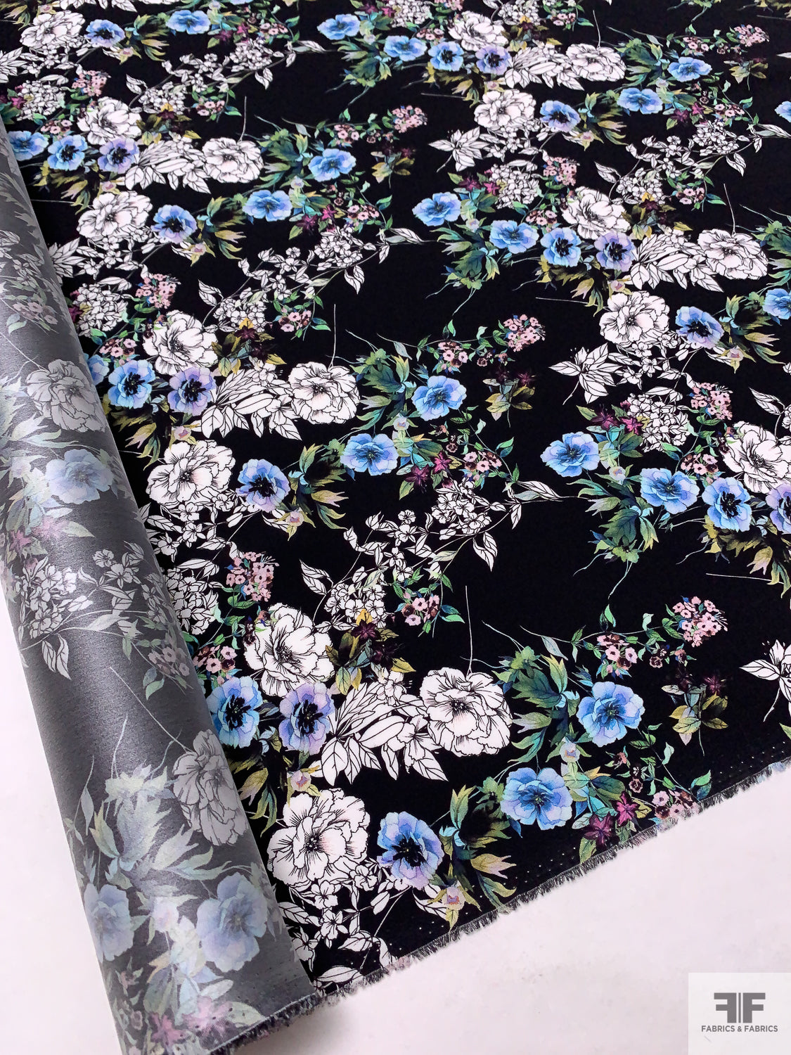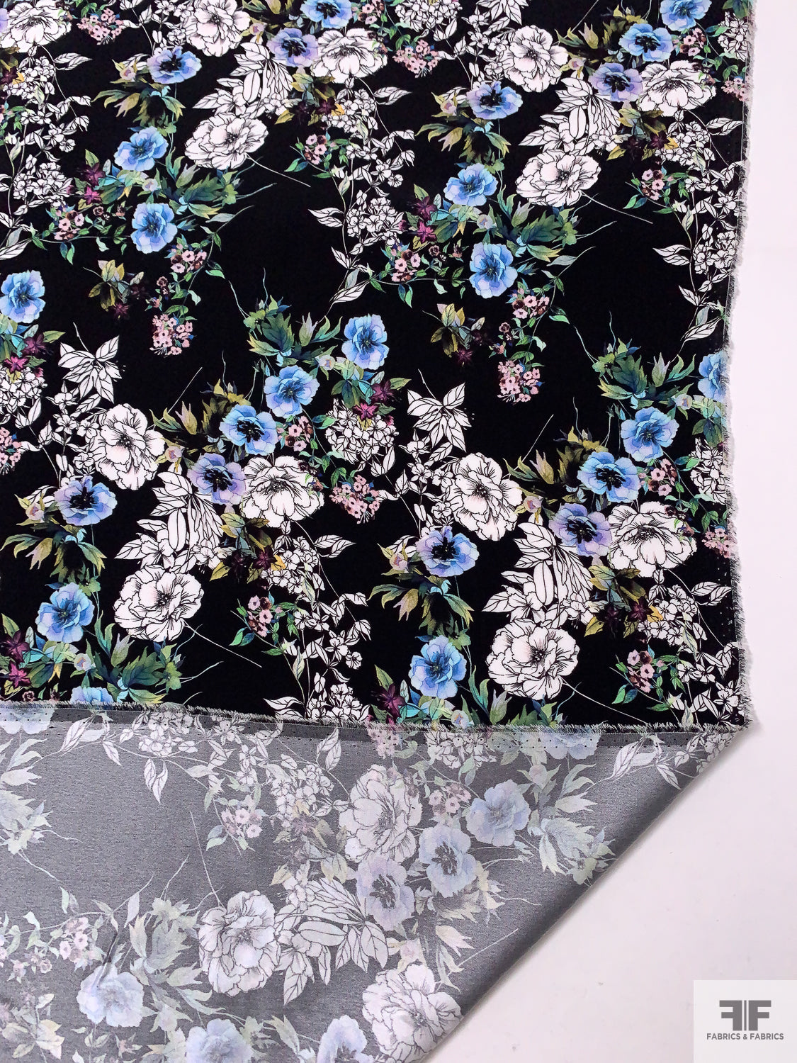 Floral Matte-Side Printed Silk Charmeuse - Periwinkle / Blue / Greens / Black / White