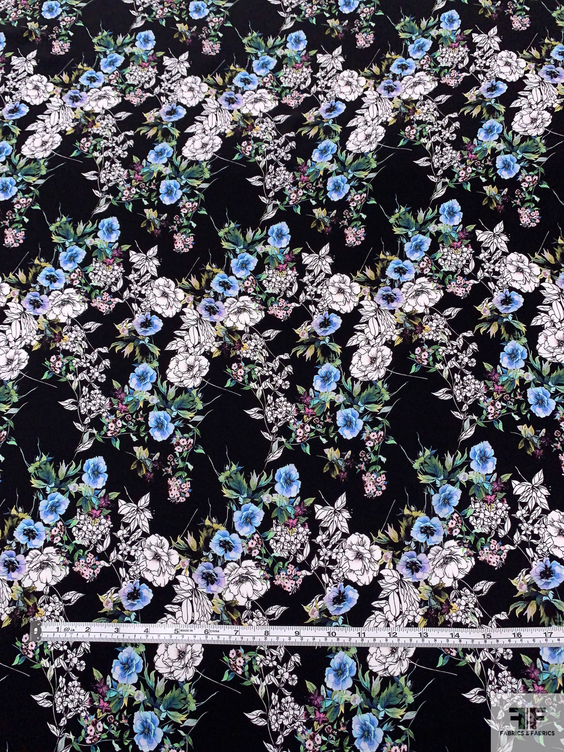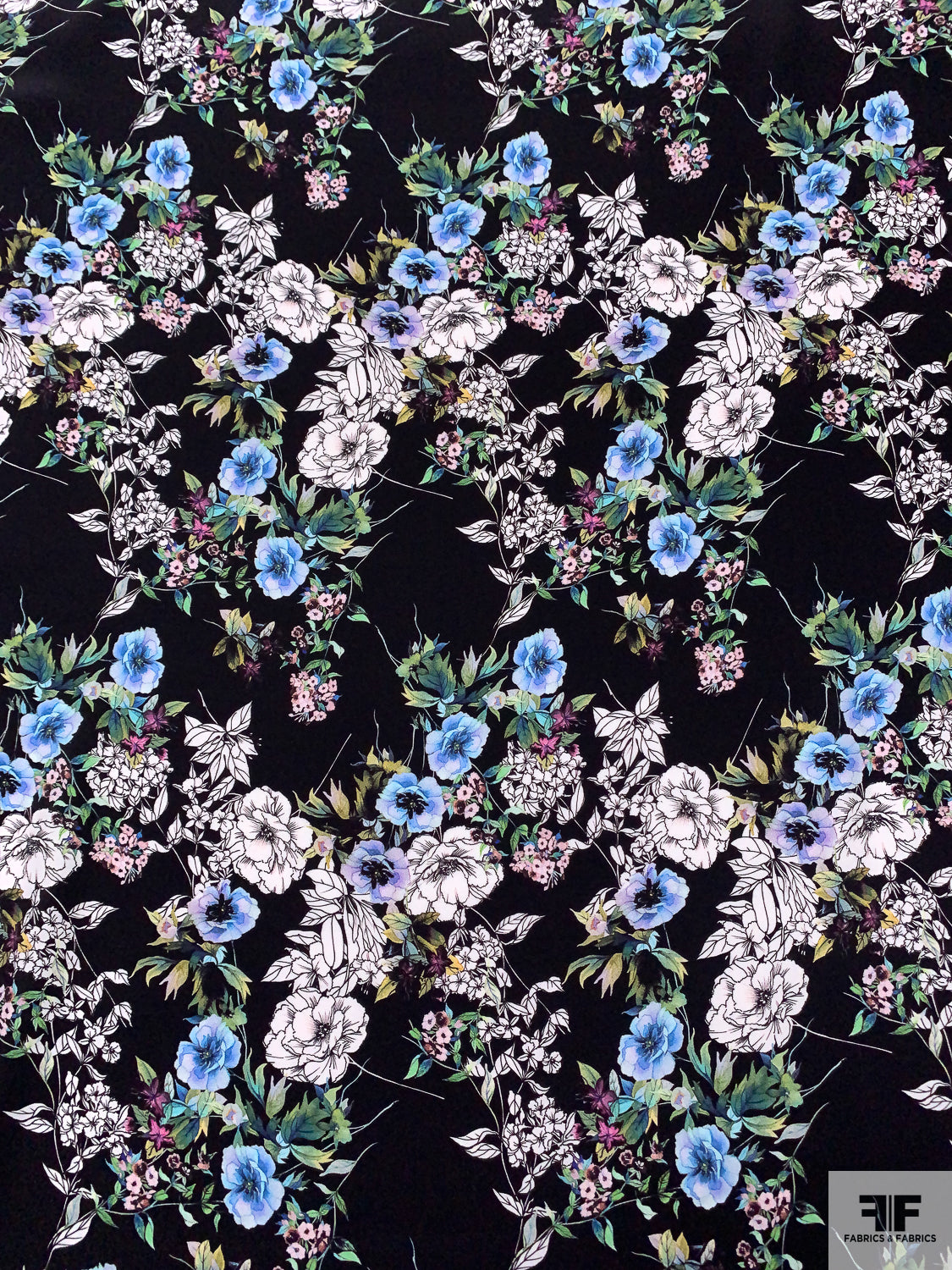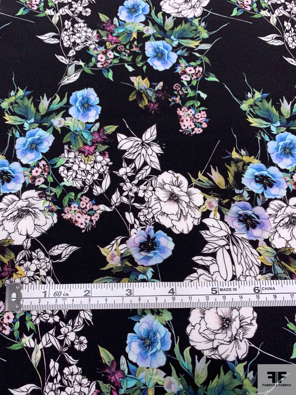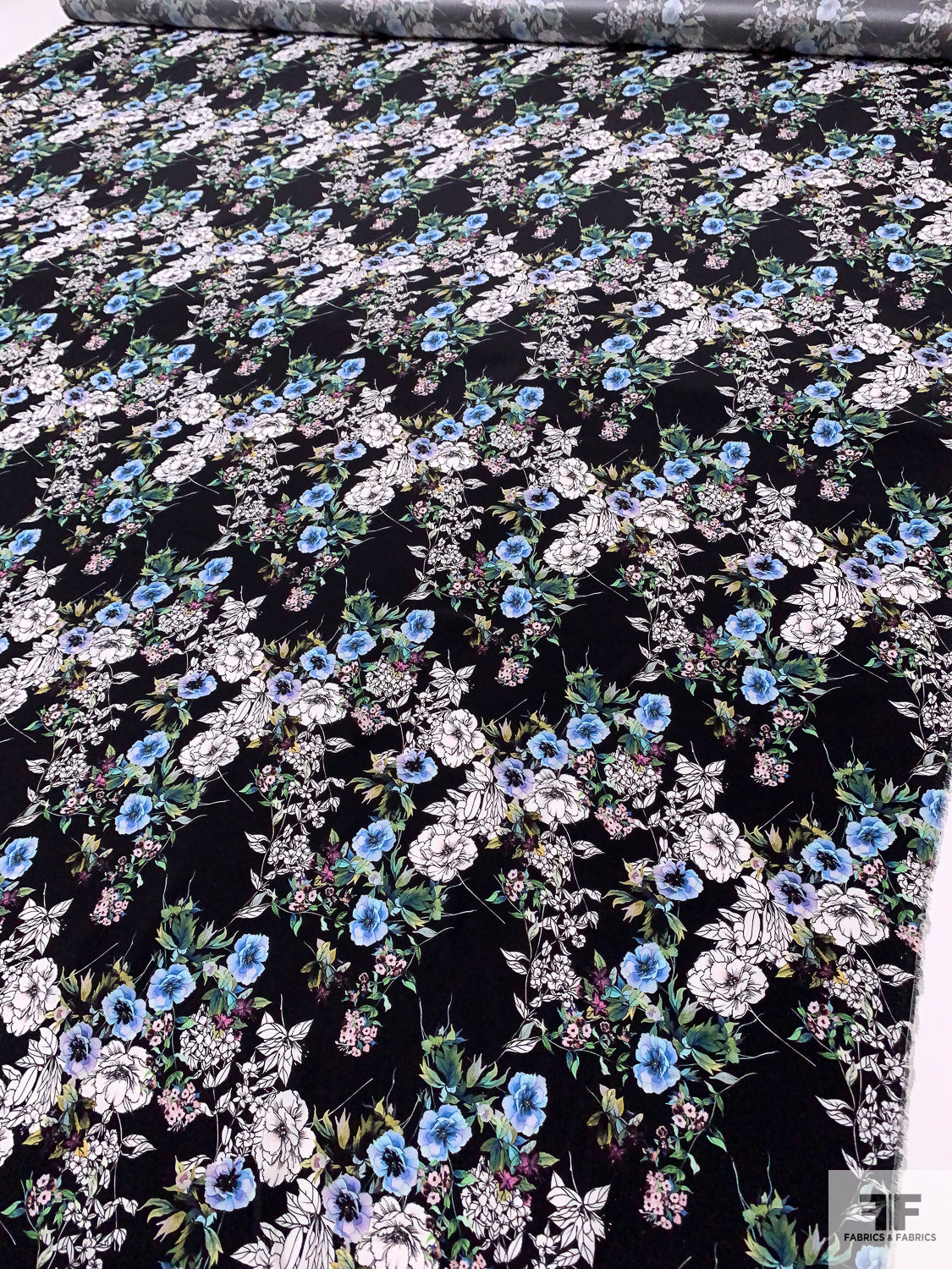 Floral Matte-Side Printed Silk Charmeuse - Periwinkle / Blue / Greens / Black / White
