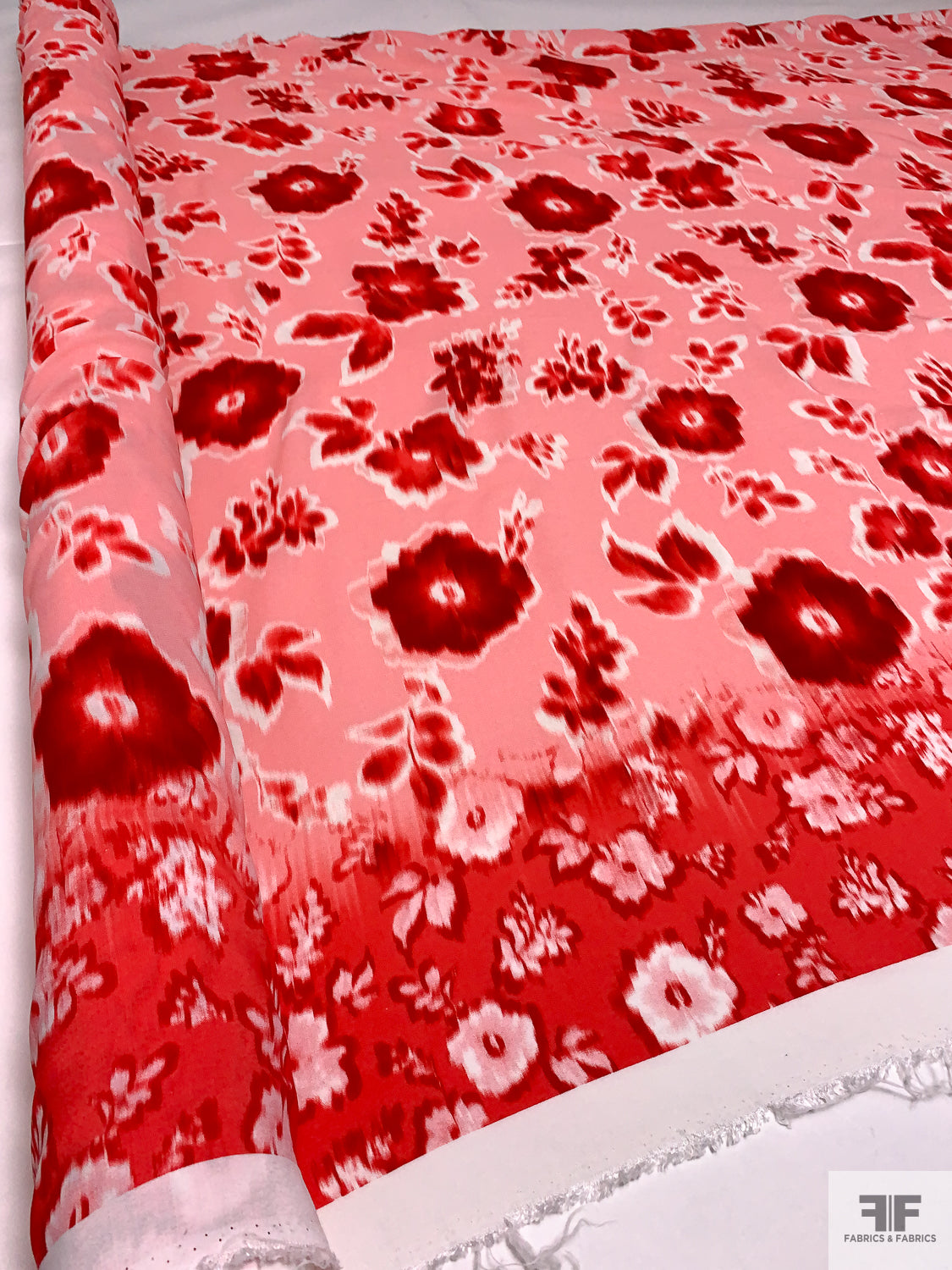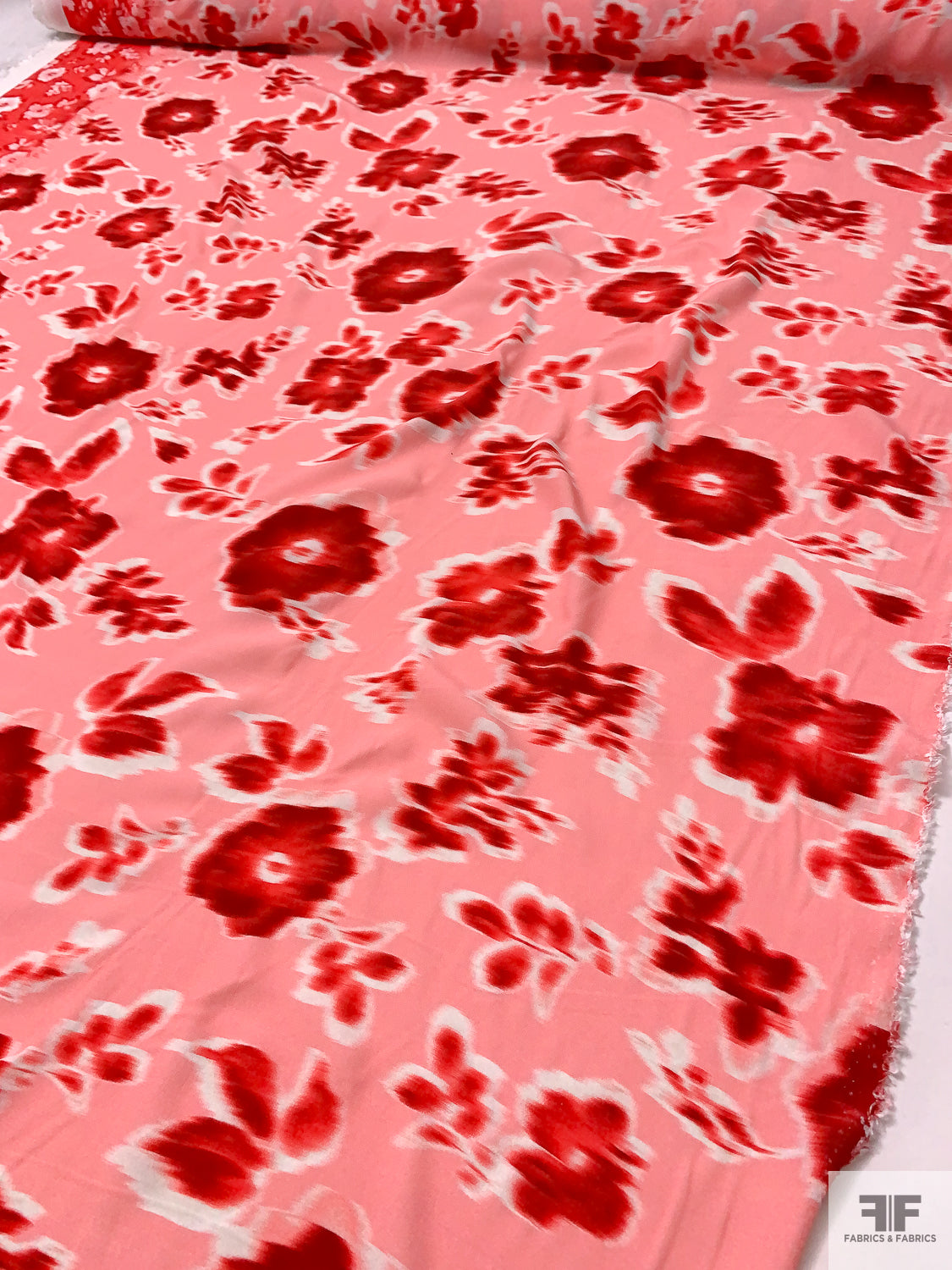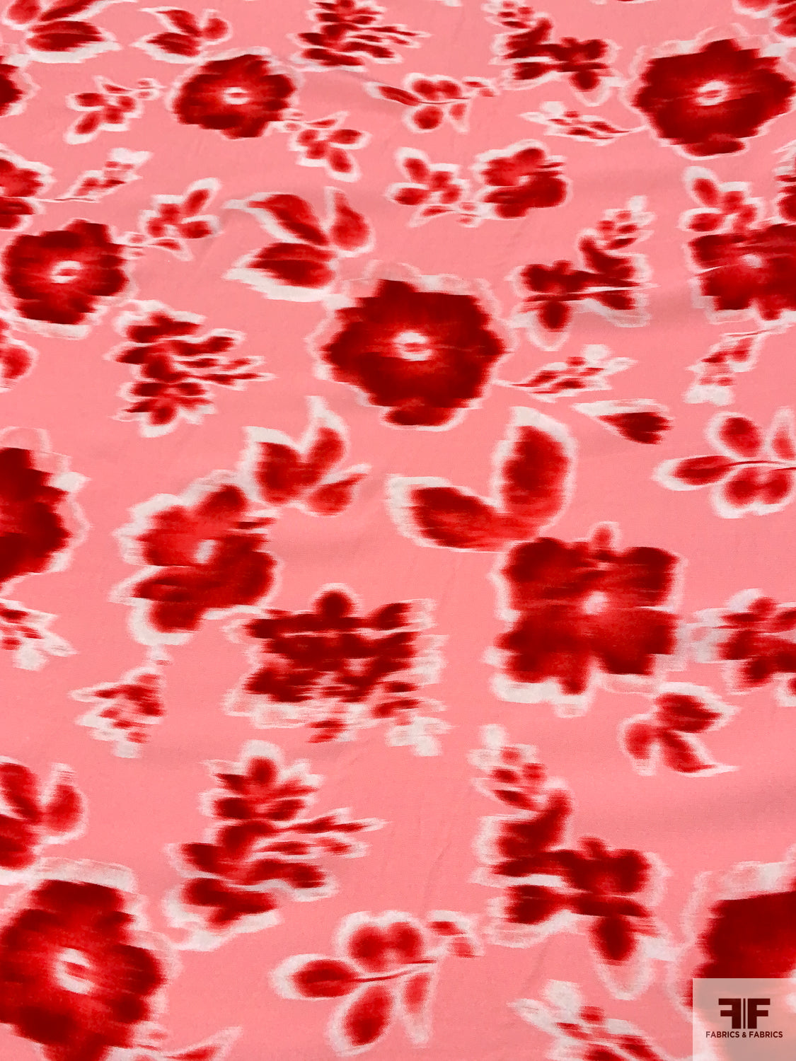 Hazy Floral and Border Printed Viscose Crepon - Pink / Reds / Off-White