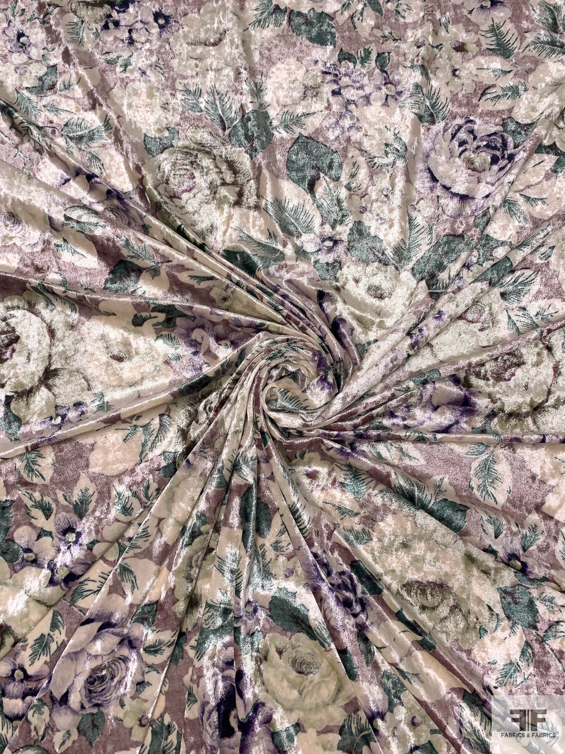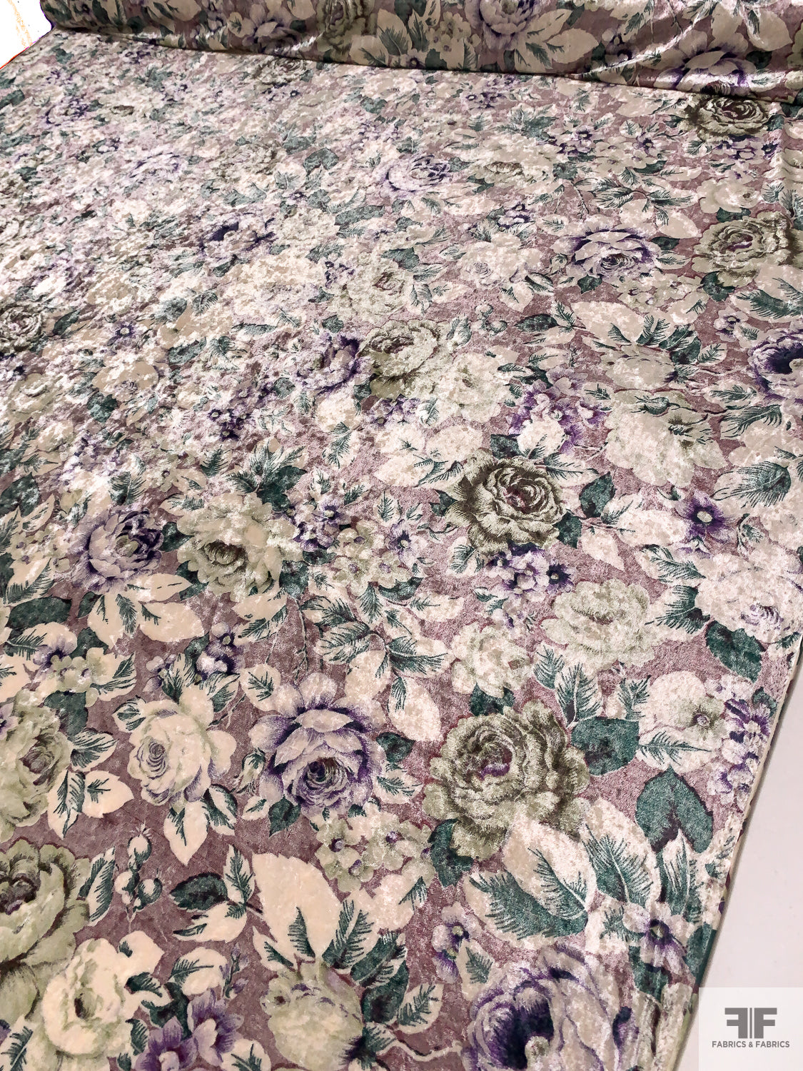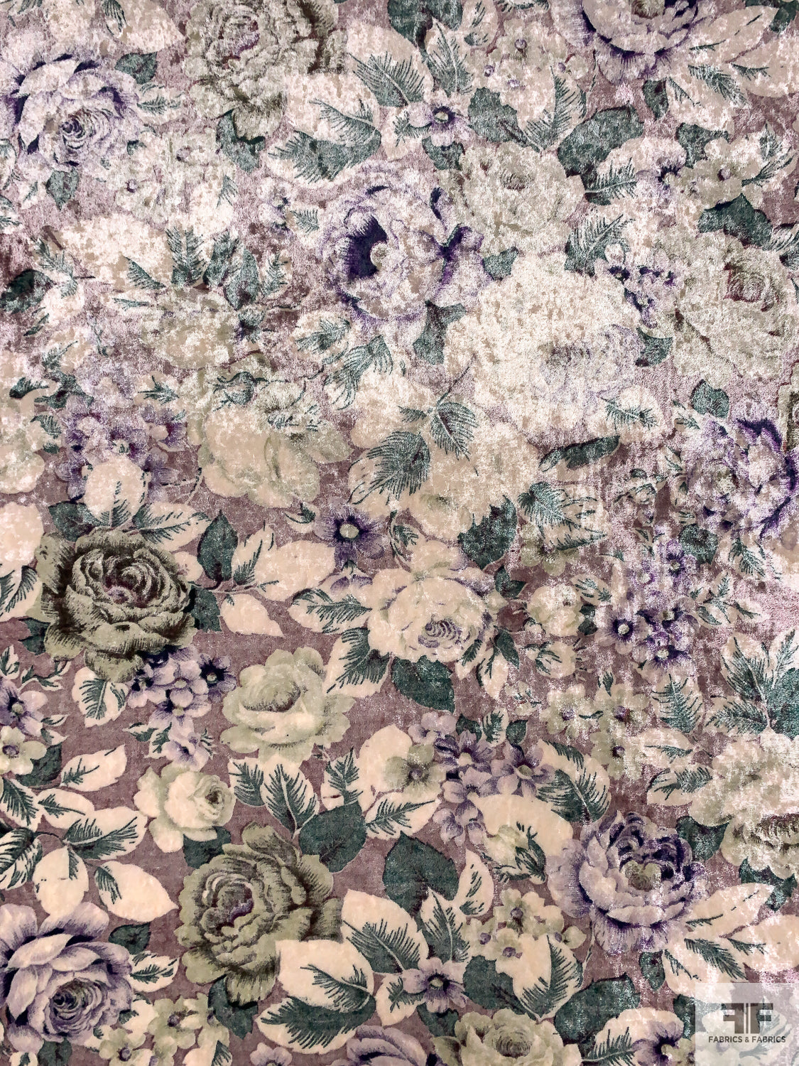 Italian Floral Printed Stretch Panné Velour - Purples / Evergreen / Off-White