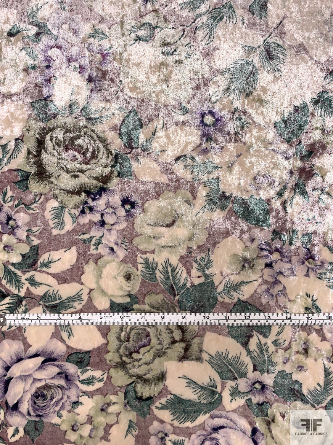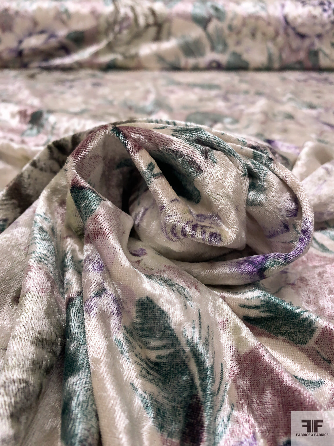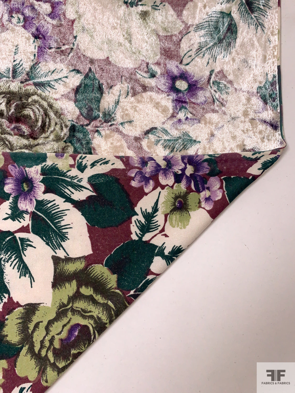 Italian Floral Printed Stretch Panné Velour - Purples / Evergreen / Off-White