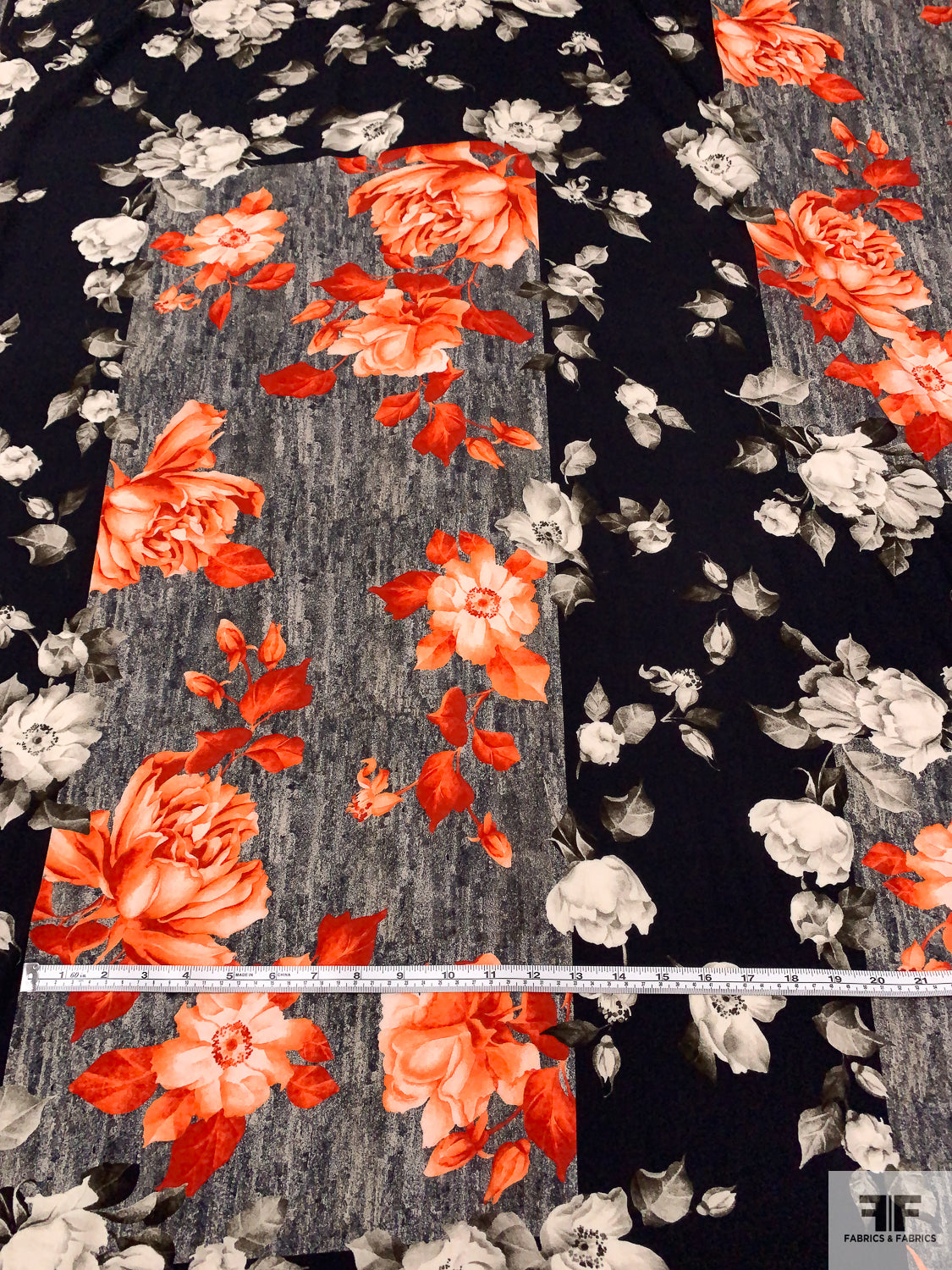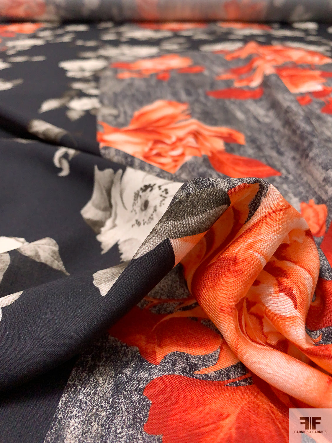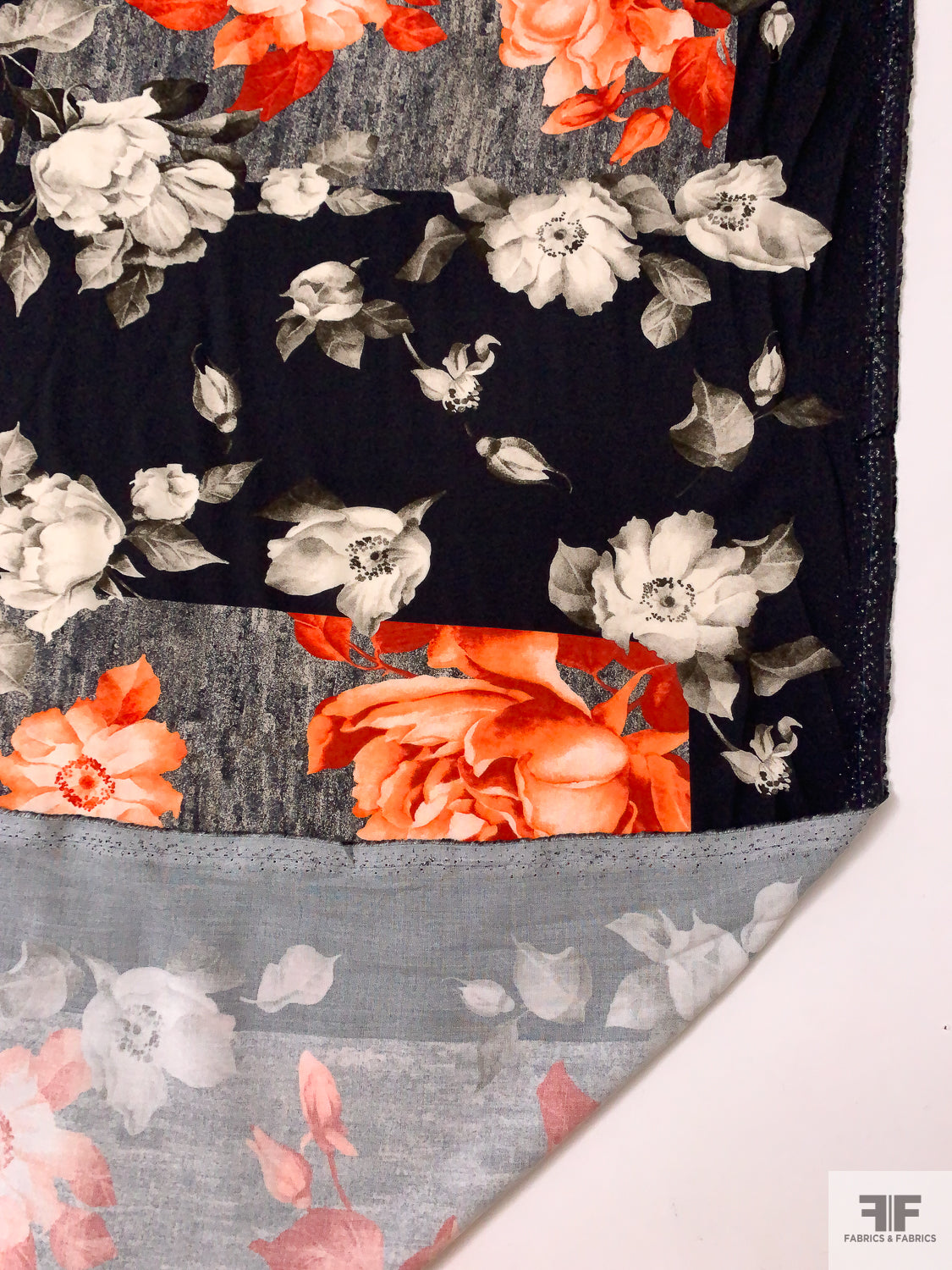 Italian Romantic Floral and Geometric Printed Viscose Challis - Coral-Orange / Black / Smokey Taupe / Grey