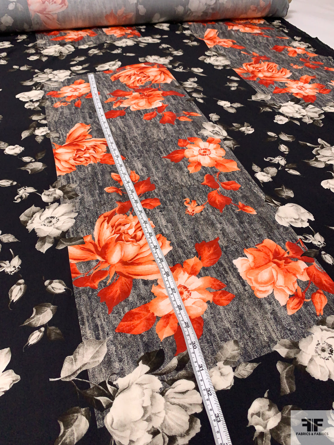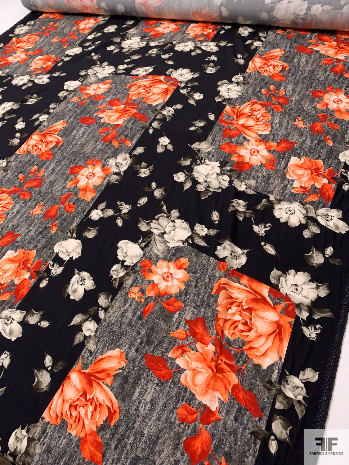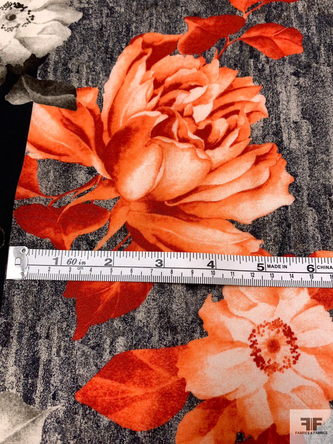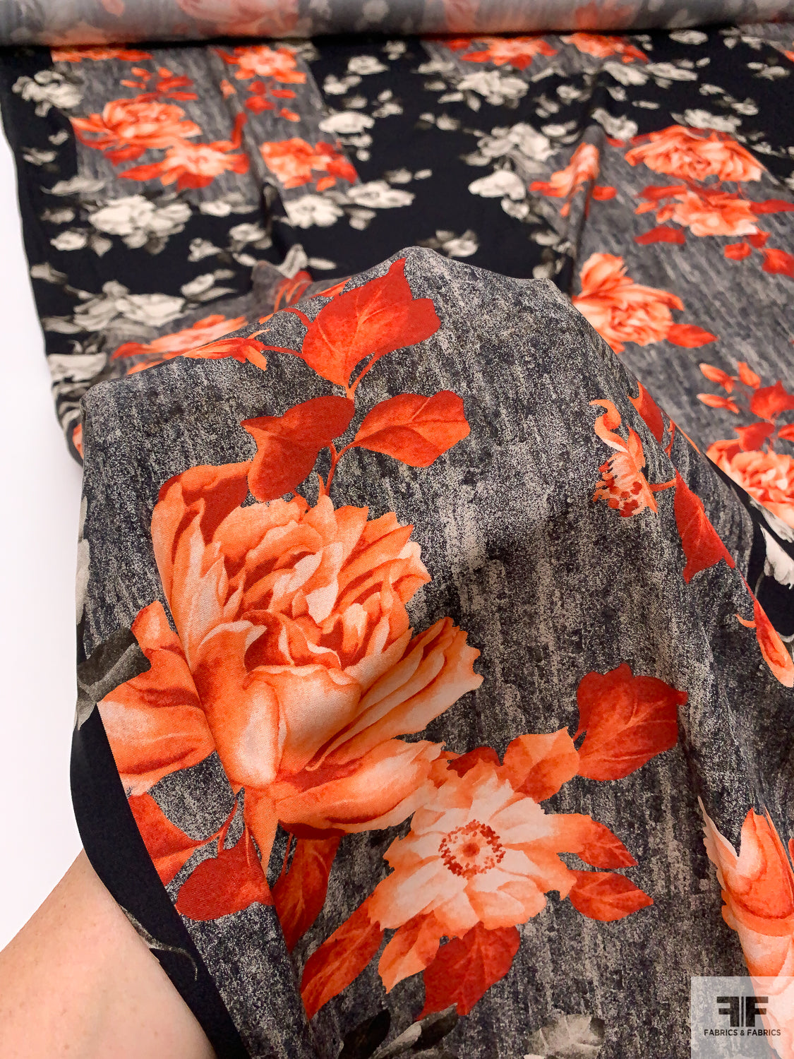 Italian Romantic Floral and Geometric Printed Viscose Challis - Coral-Orange / Black / Smokey Taupe / Grey