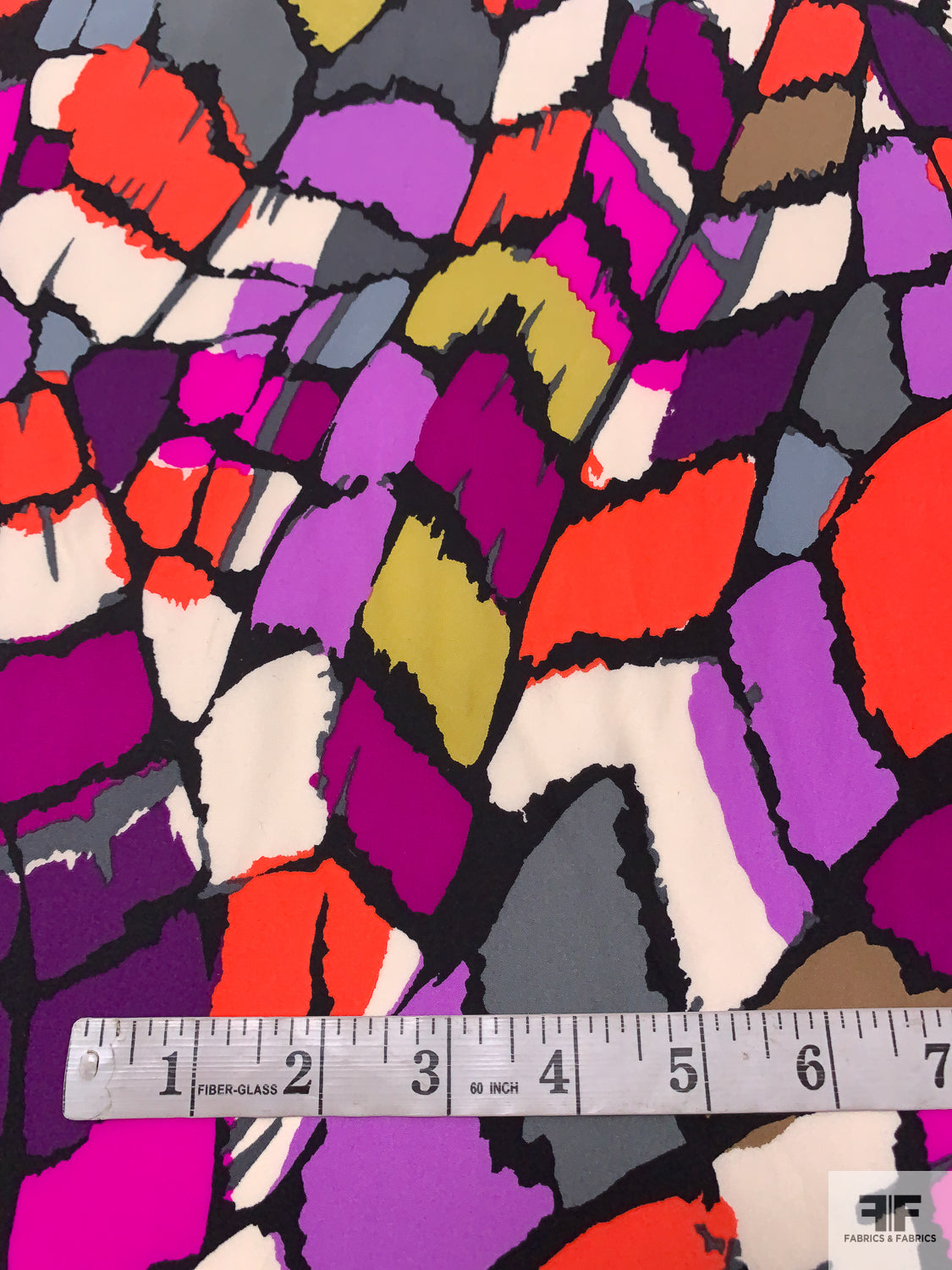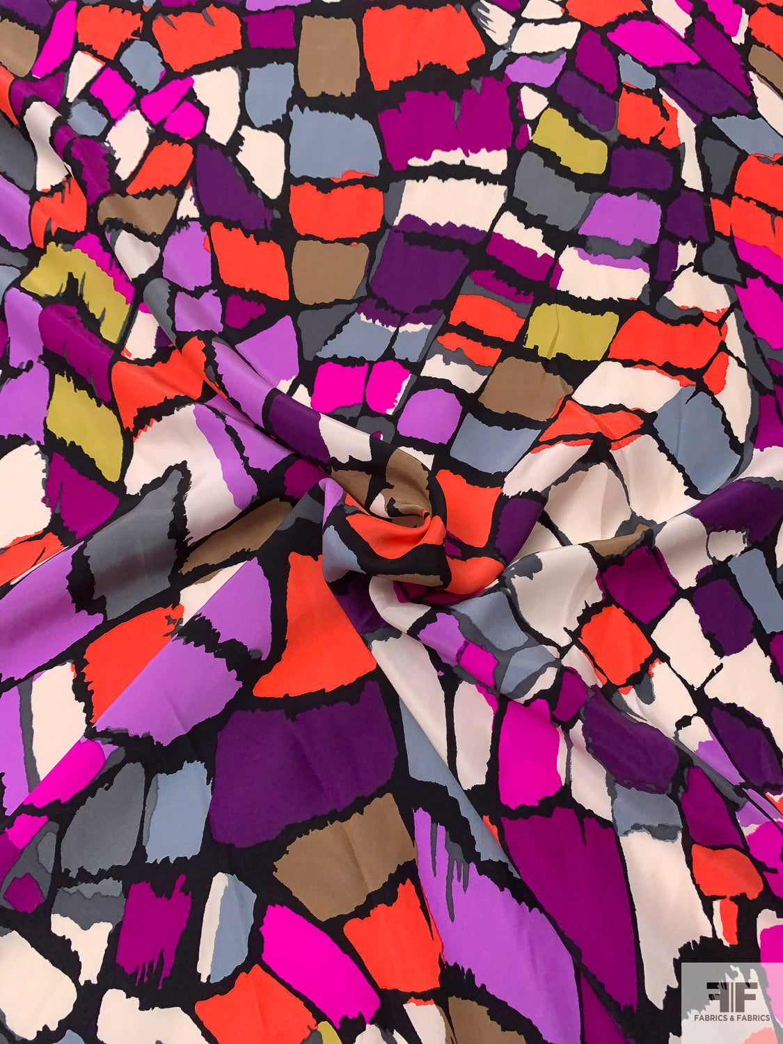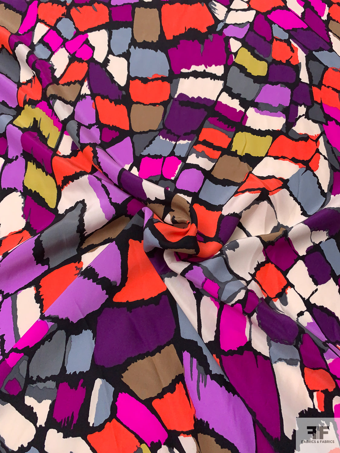 Abstract Mosaic Matte-Side Printed Silk Charmeuse - Neon Coral / Purples / Dusty Chartreuse / Off-White