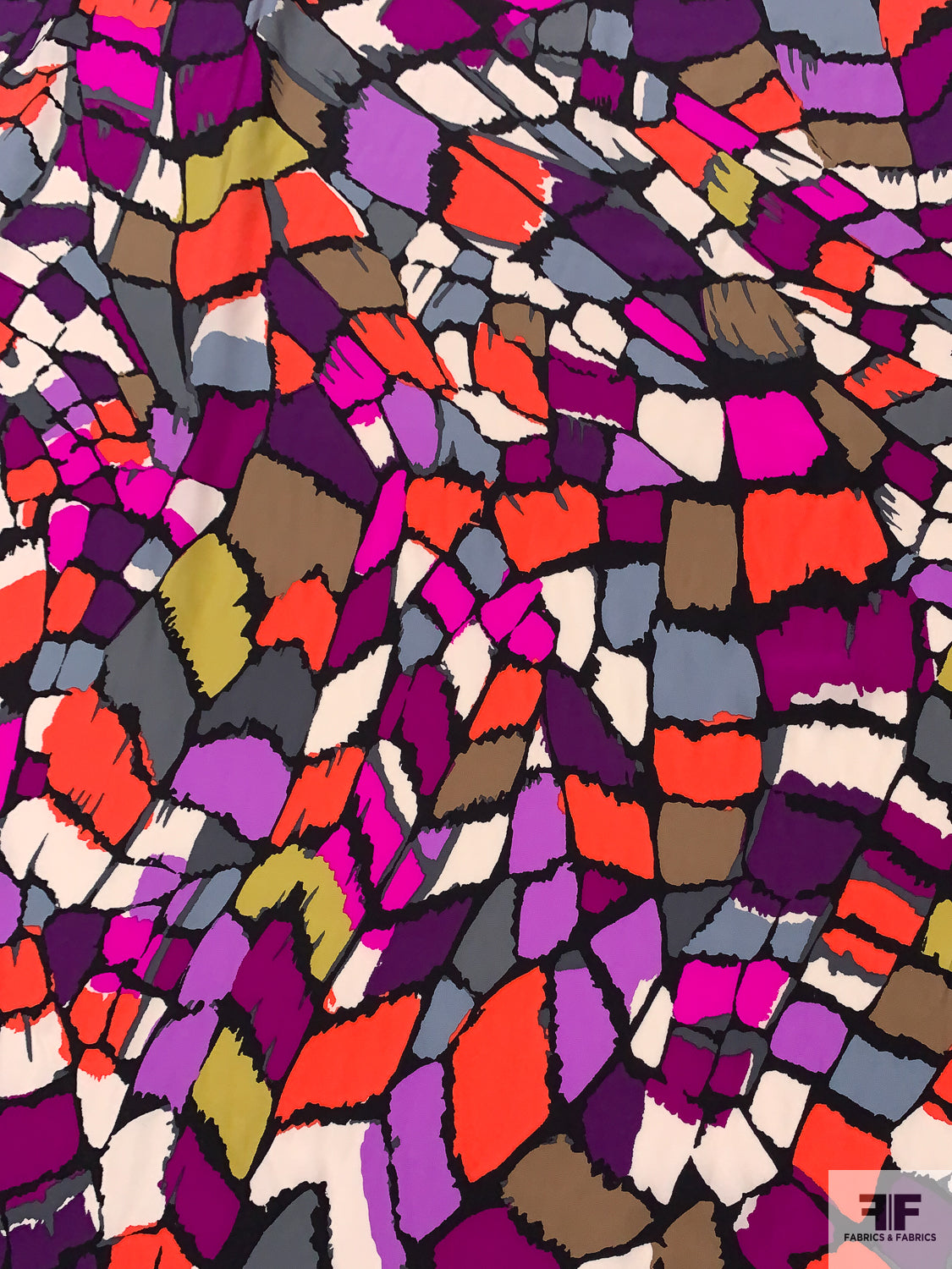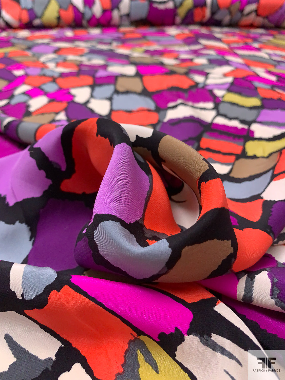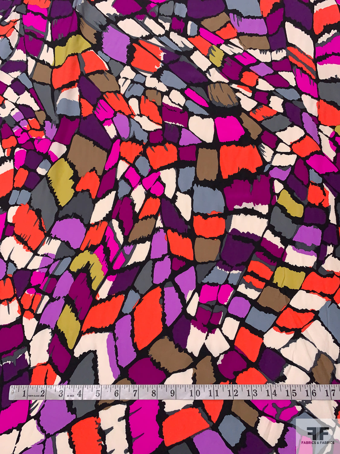 Abstract Mosaic Matte-Side Printed Silk Charmeuse - Neon Coral / Purples / Dusty Chartreuse / Off-White