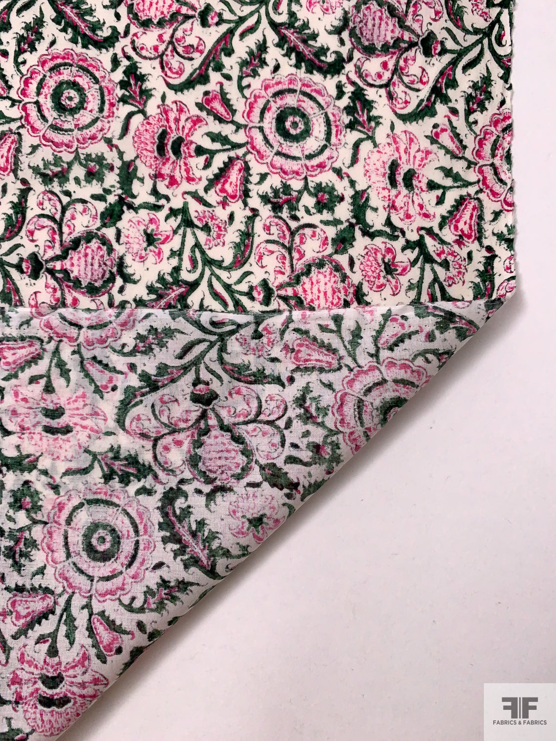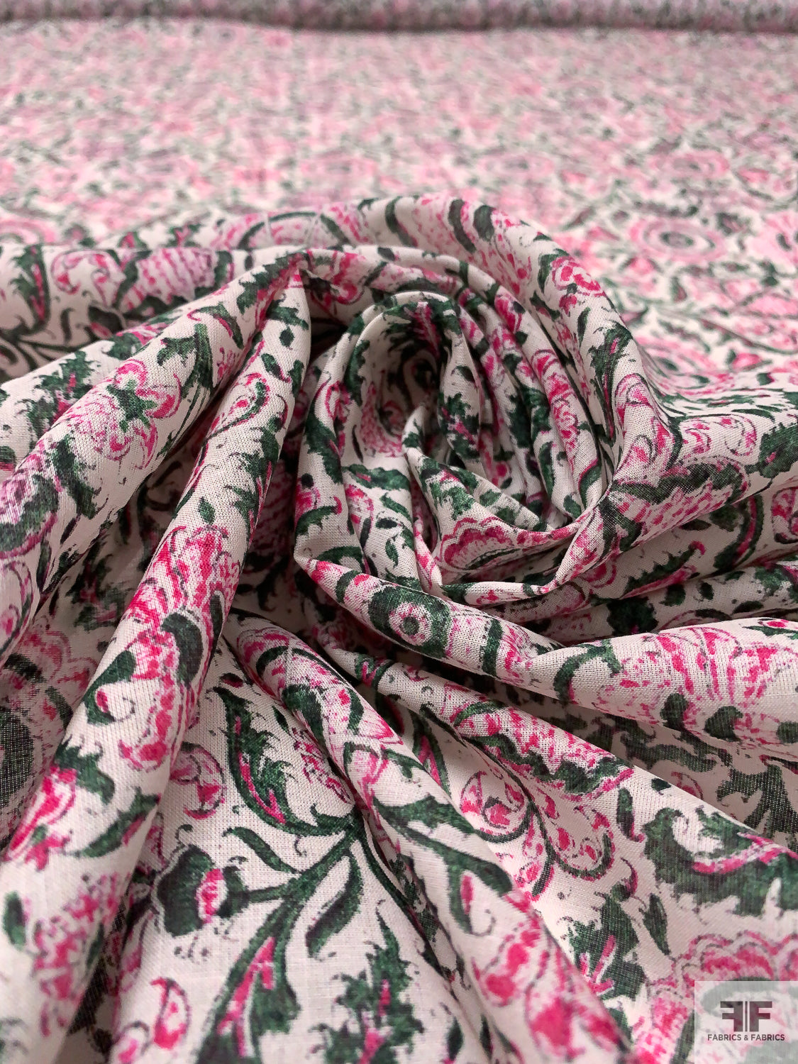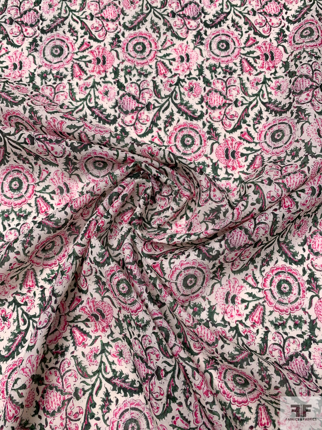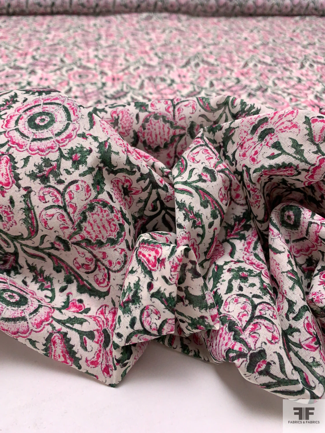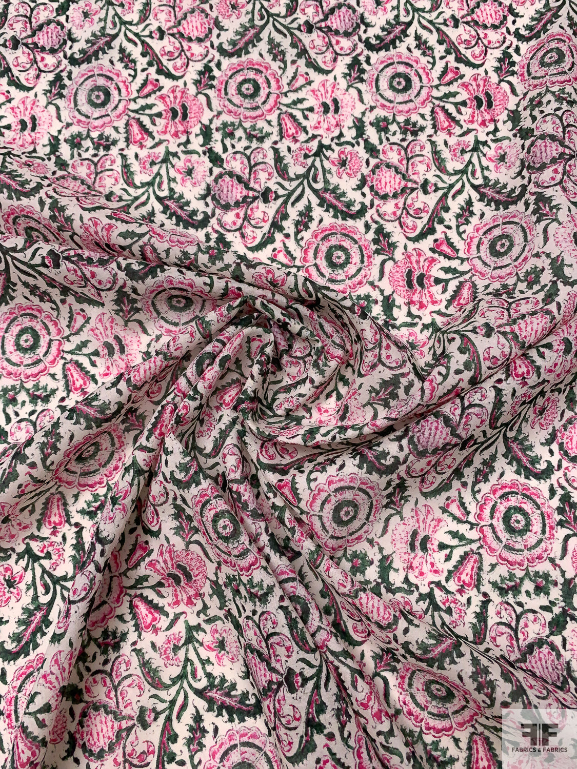 Floral Discs and Paisley Leaf Printed Cotton Voile - Hot Pink / Dark Green / White