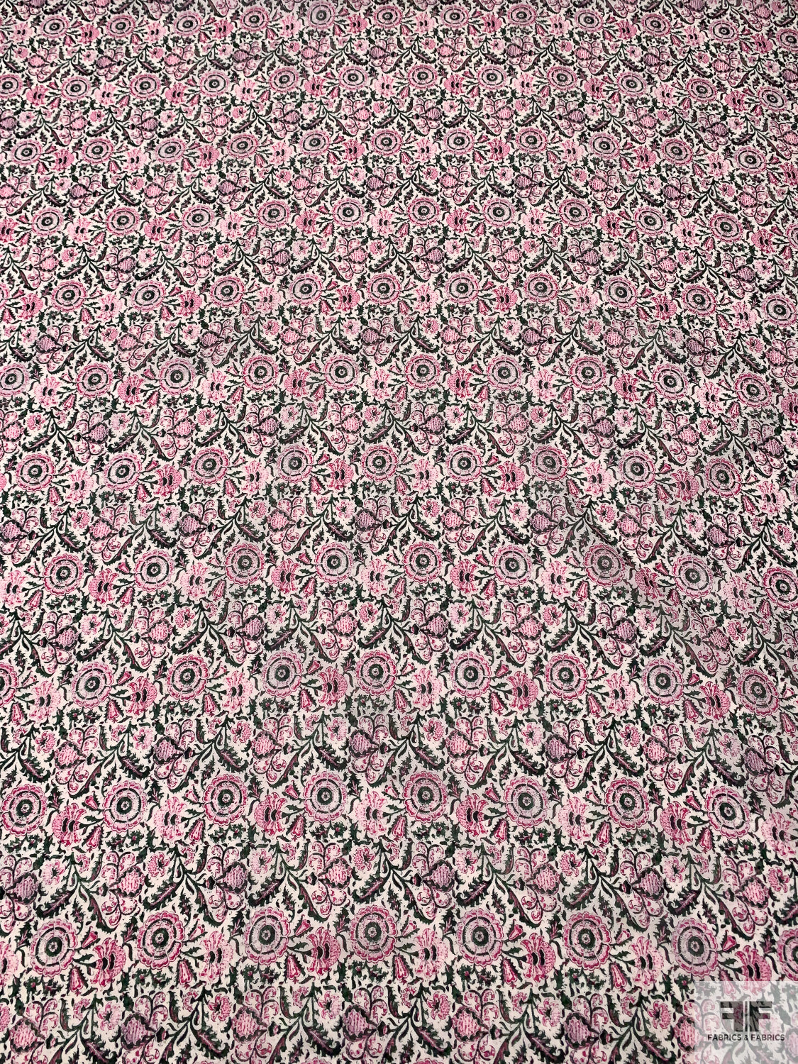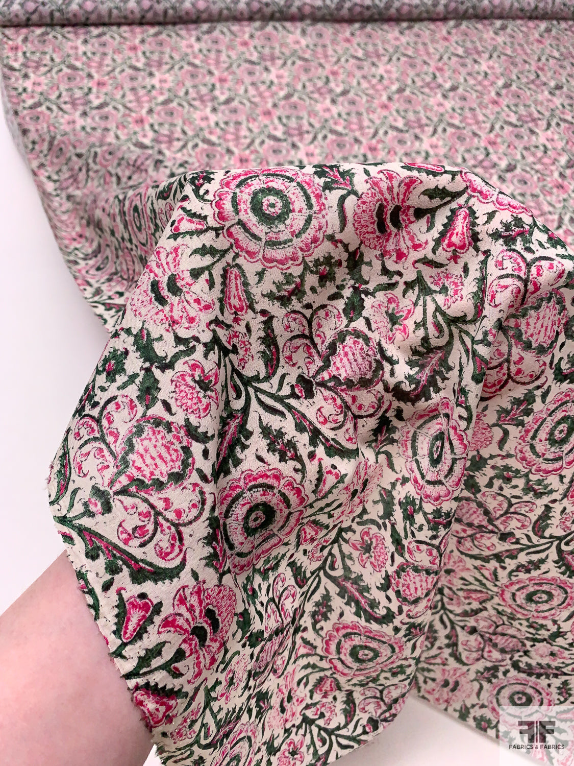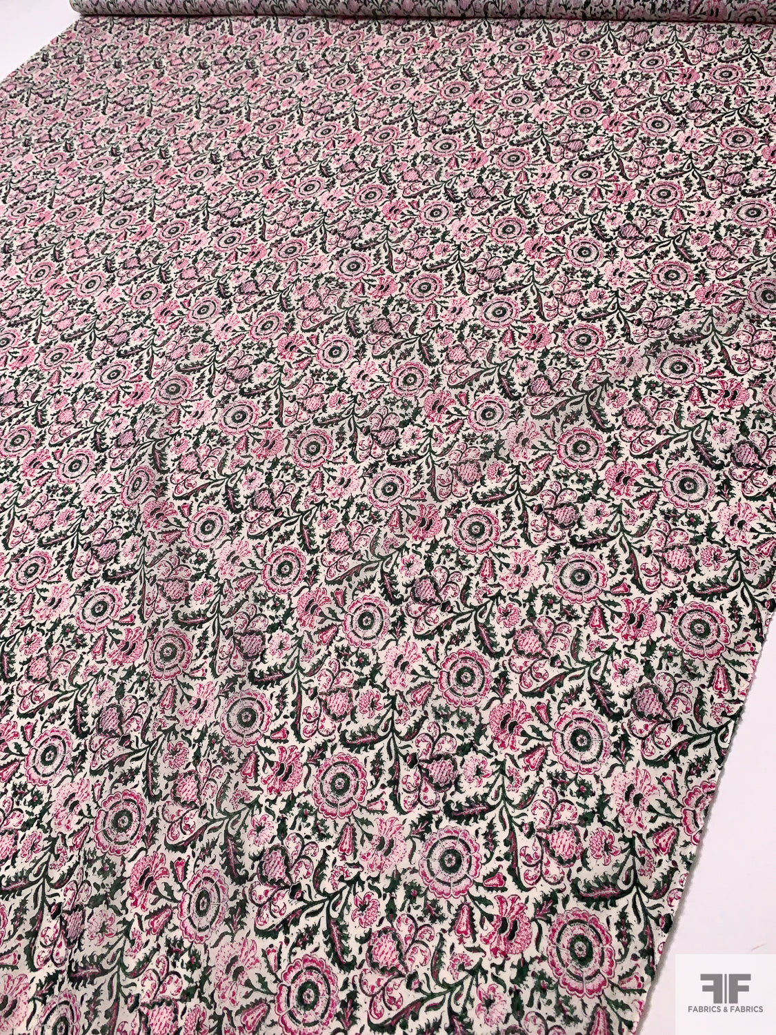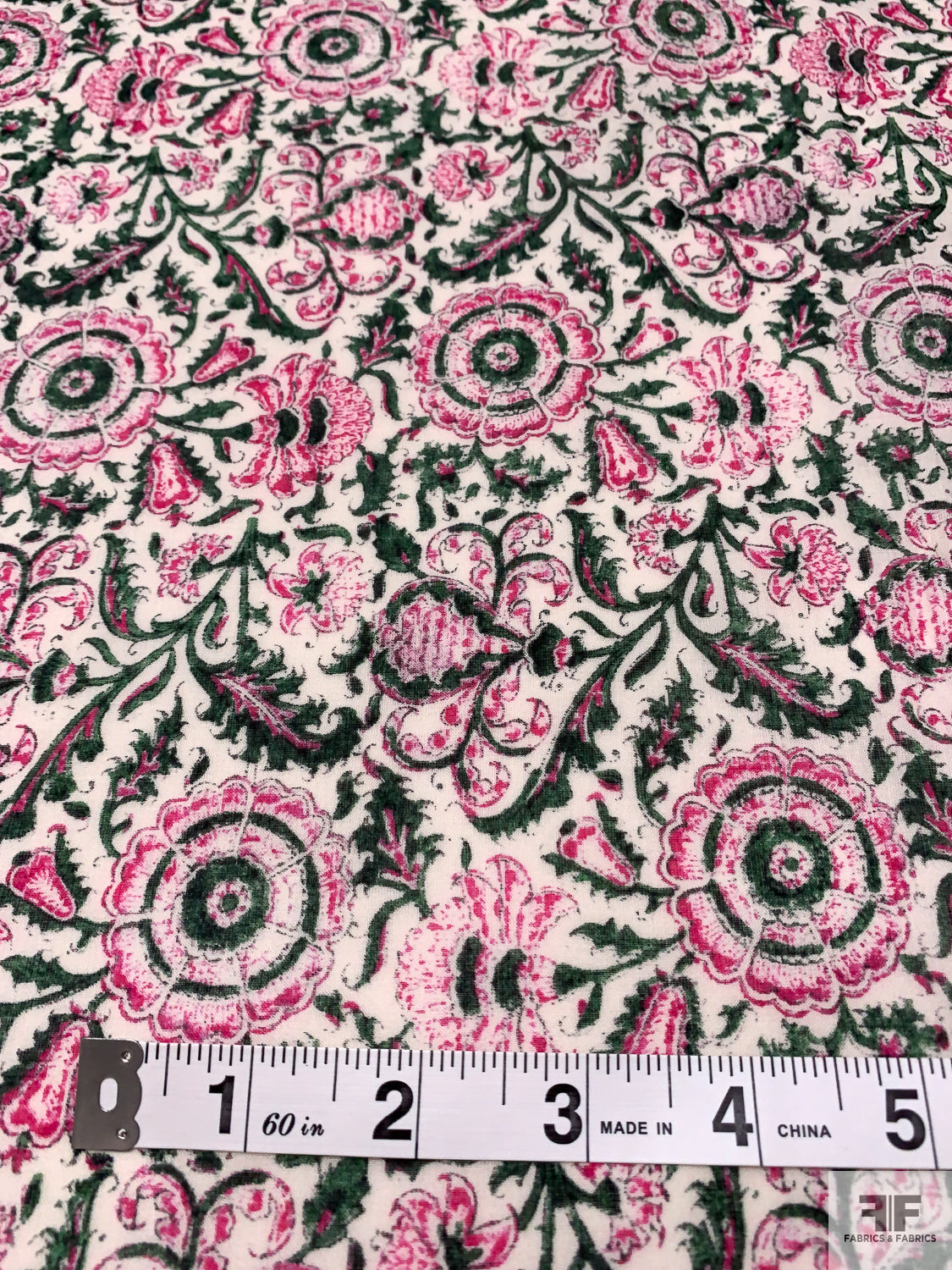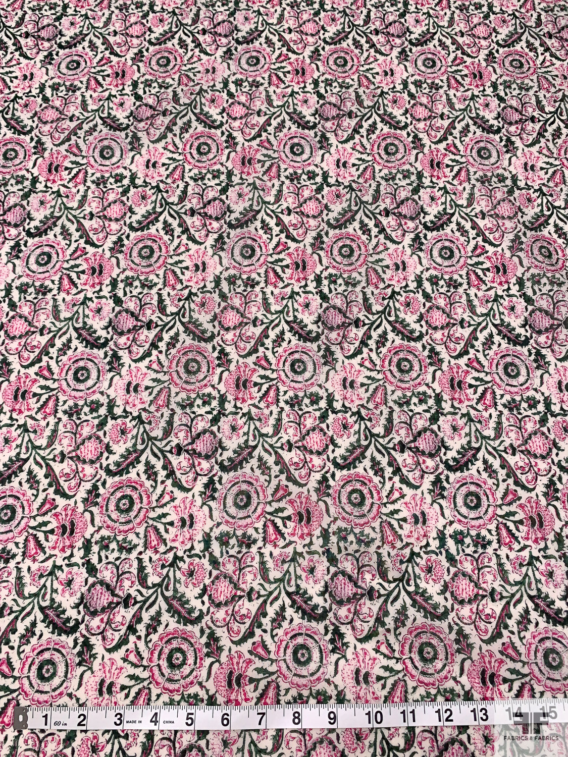 Floral Discs and Paisley Leaf Printed Cotton Voile - Hot Pink / Dark Green / White