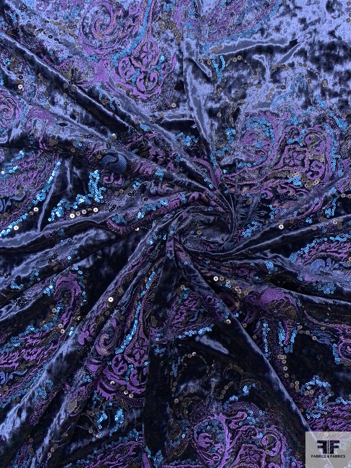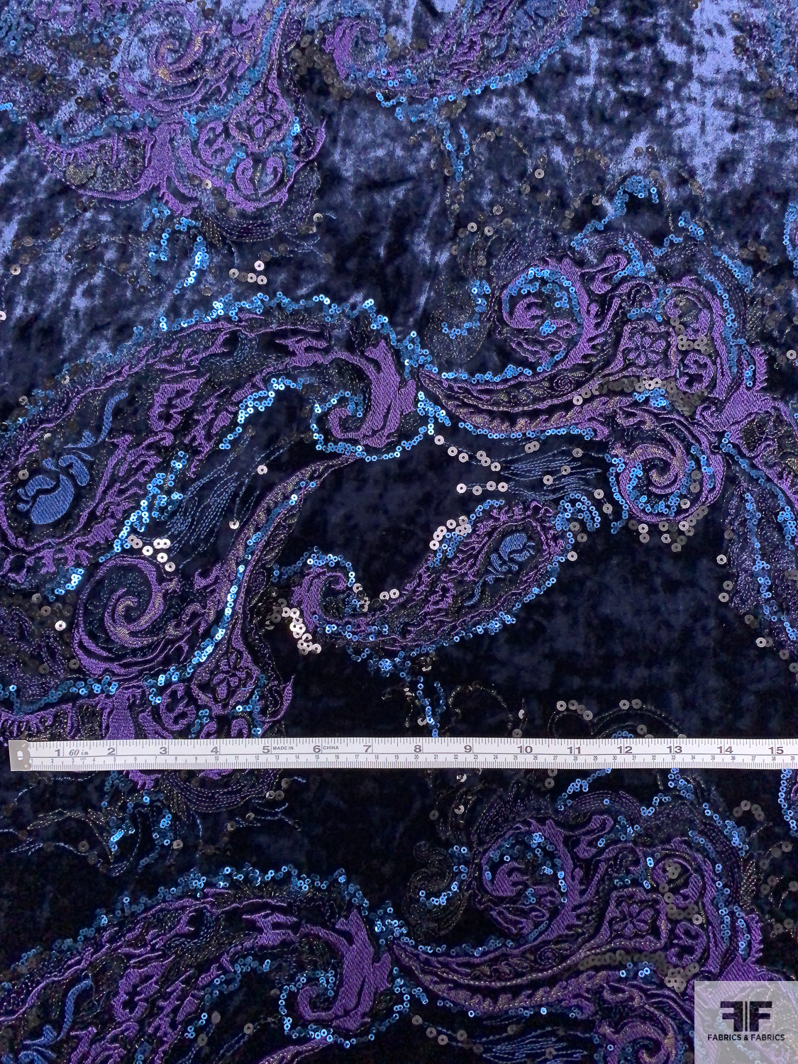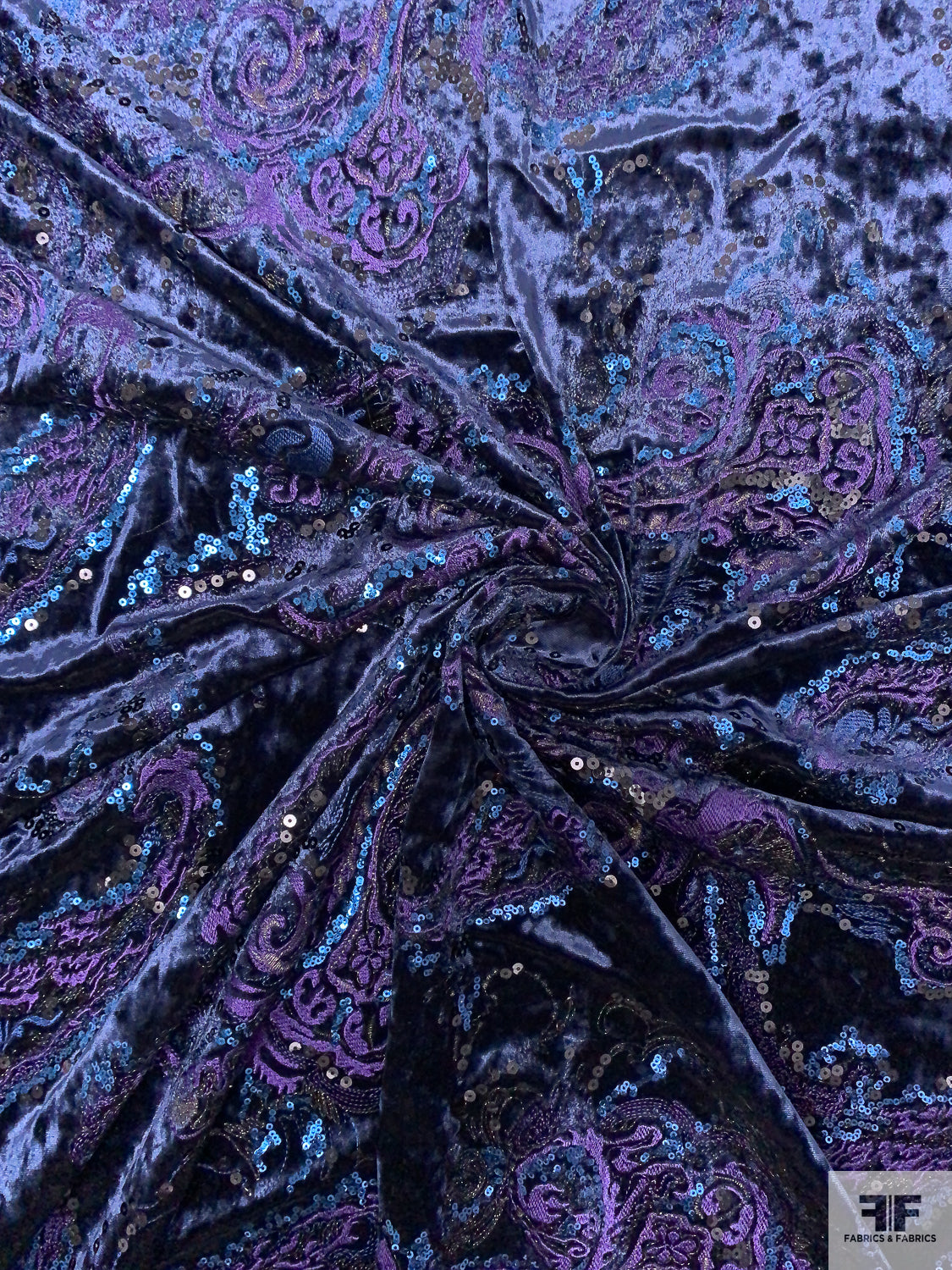 Paisley Embroidered Stretch Crushed Velvet with Sequins - Navy / Purple