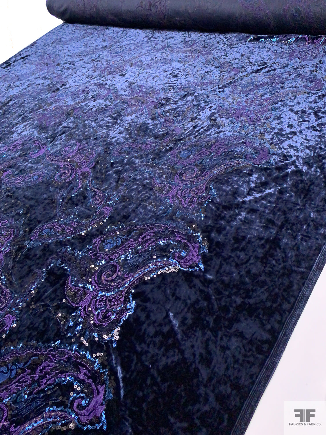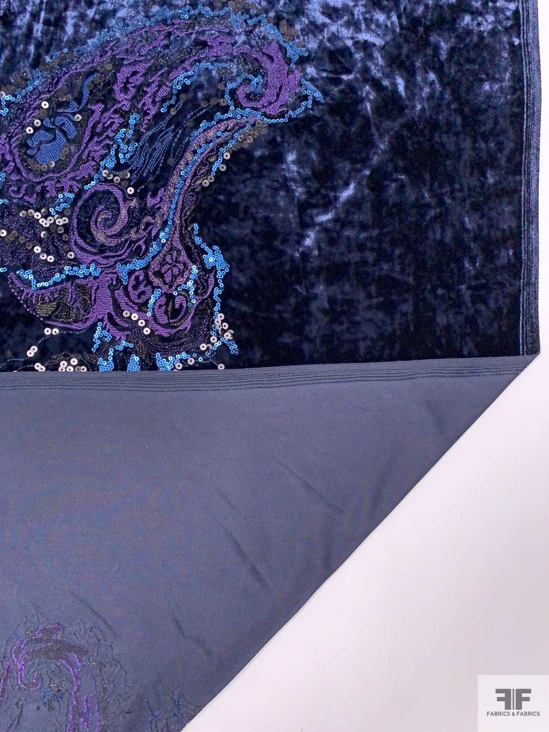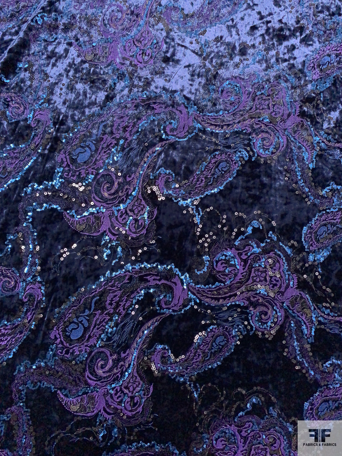 Paisley Embroidered Stretch Crushed Velvet with Sequins - Navy / Purple