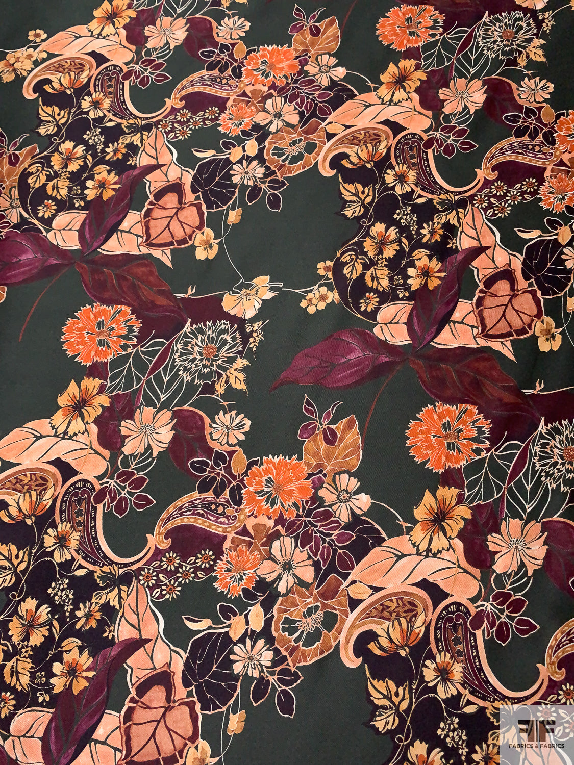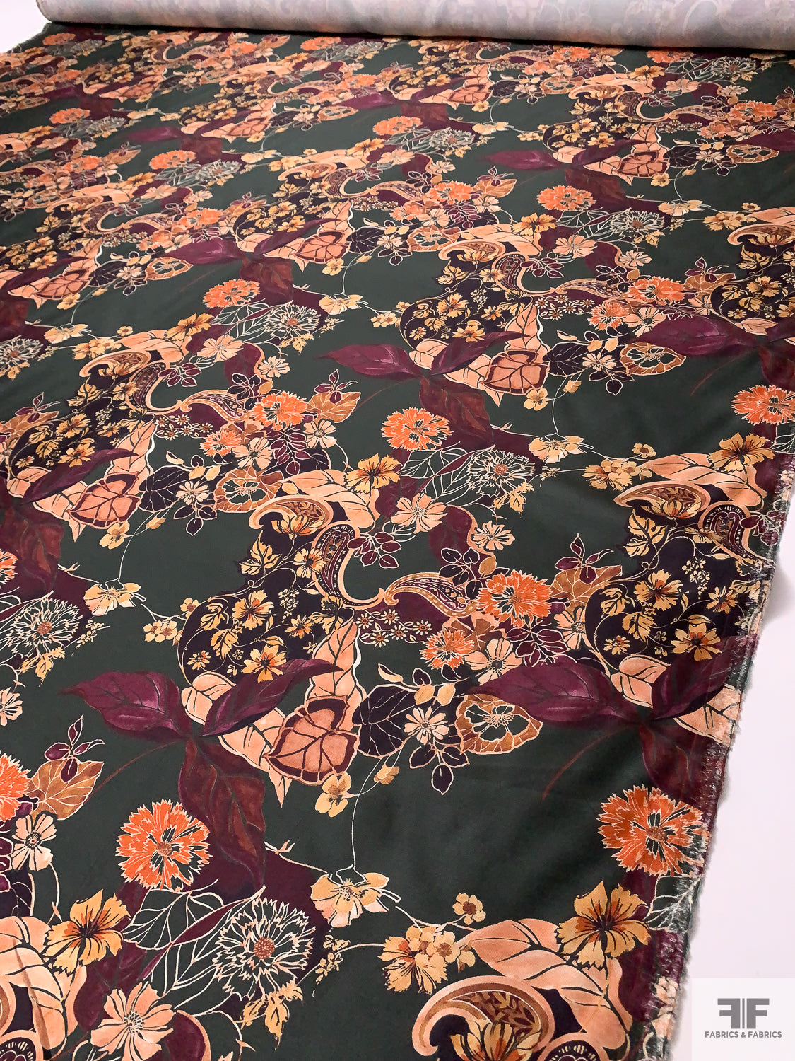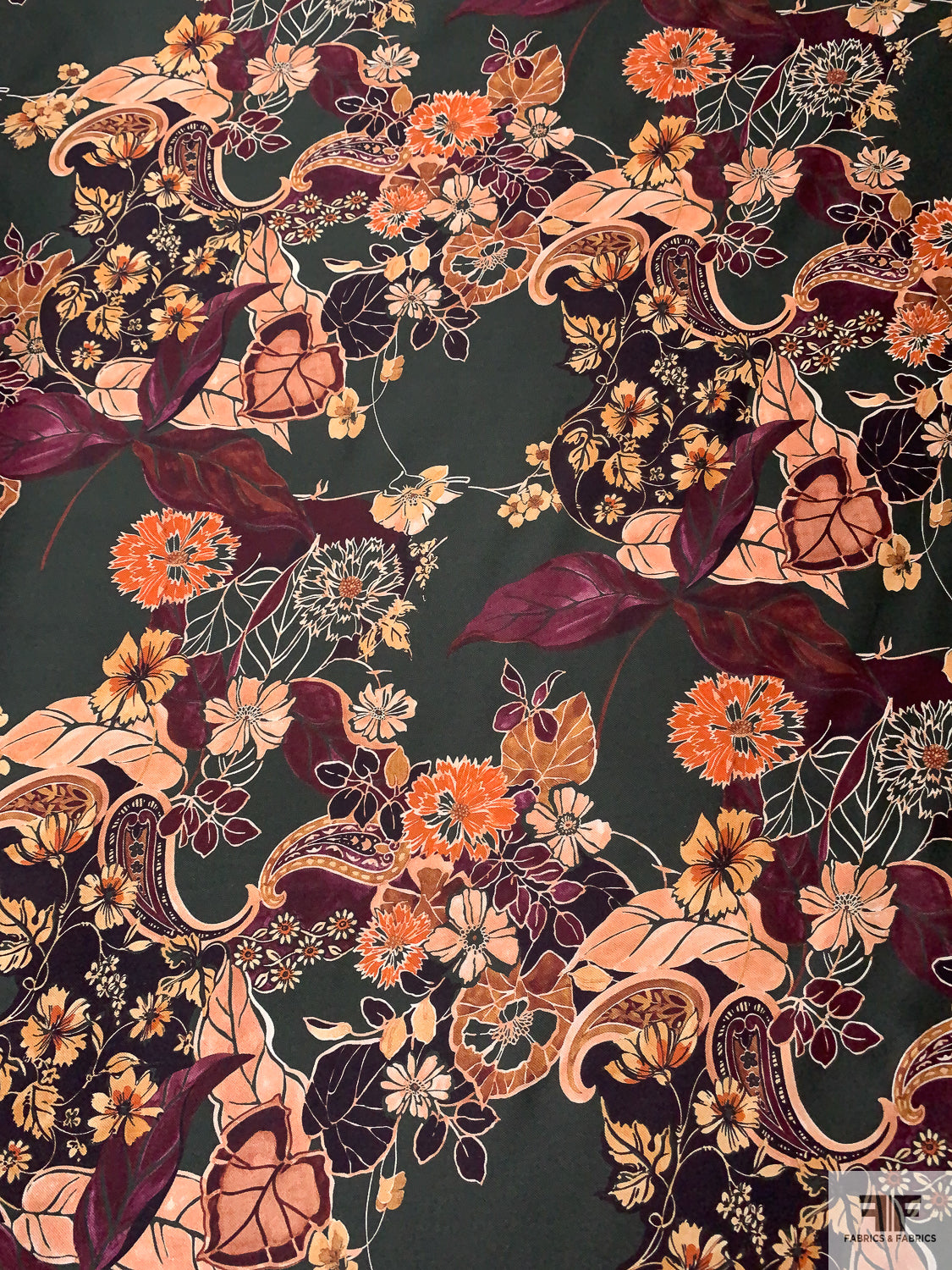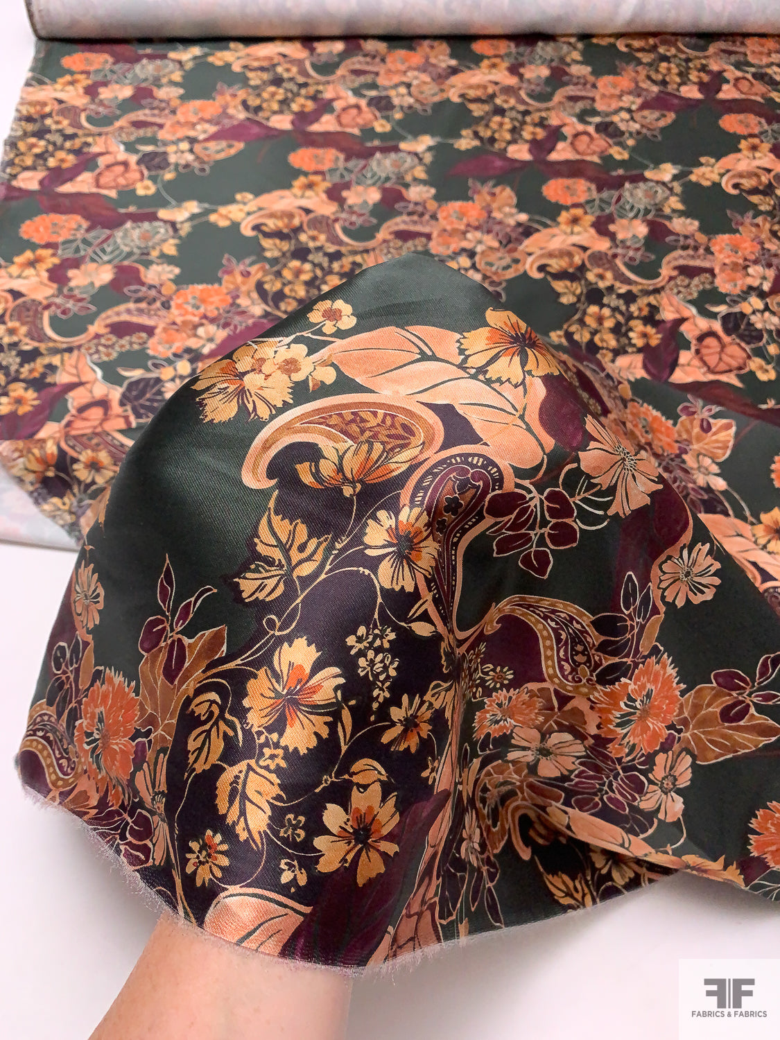 Exotic Paisley Floral Printed Silk-Cotton Mikado - Deep Hunter Green / Smoky Peach / Wine Purple