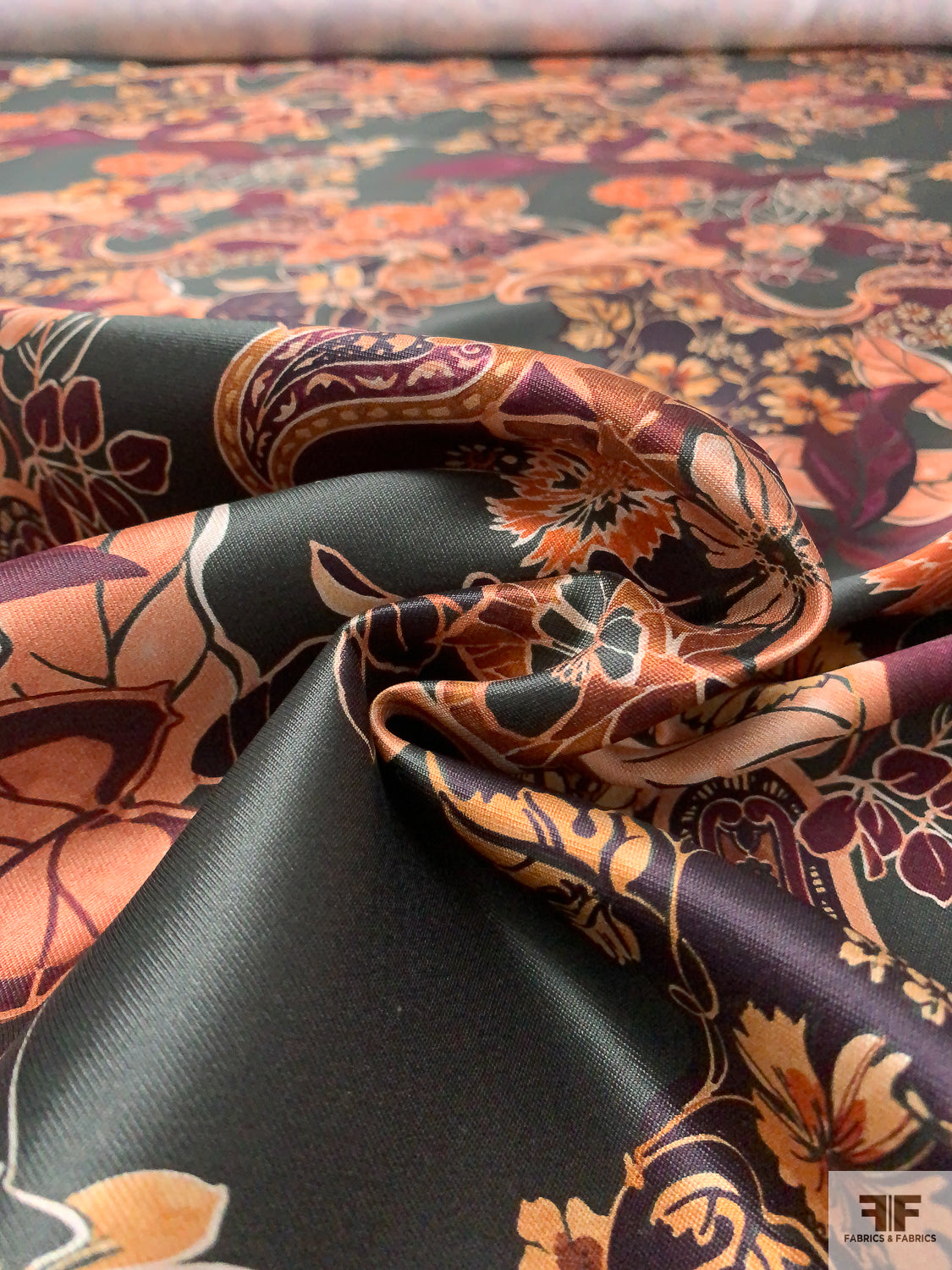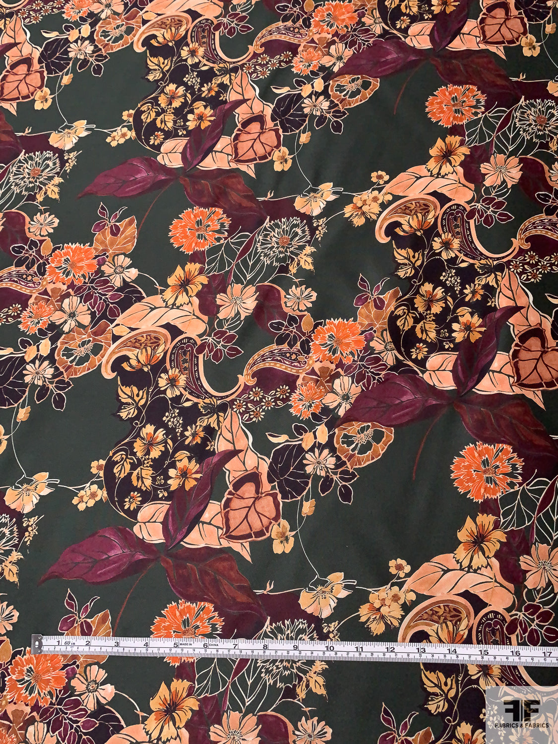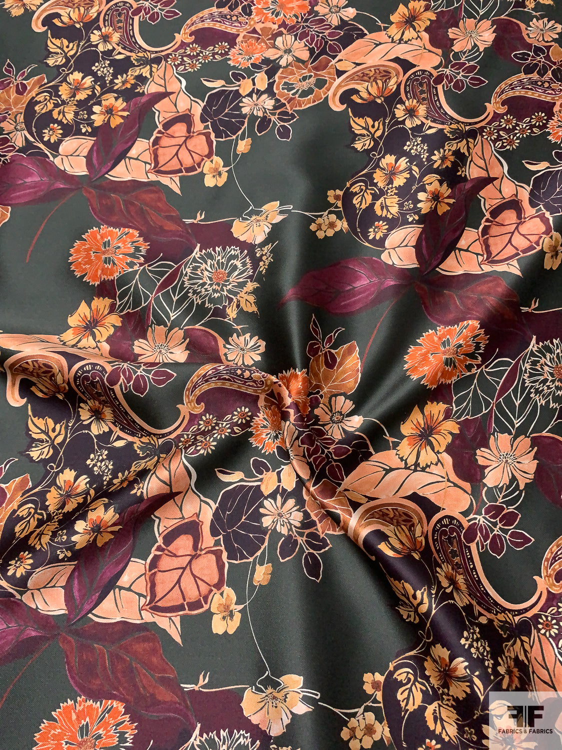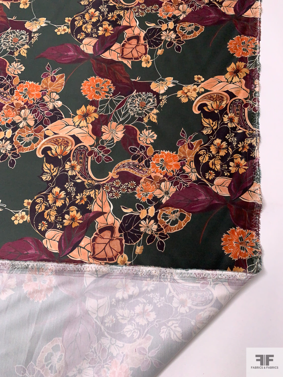 Exotic Paisley Floral Printed Silk-Cotton Mikado - Deep Hunter Green / Smoky Peach / Wine Purple