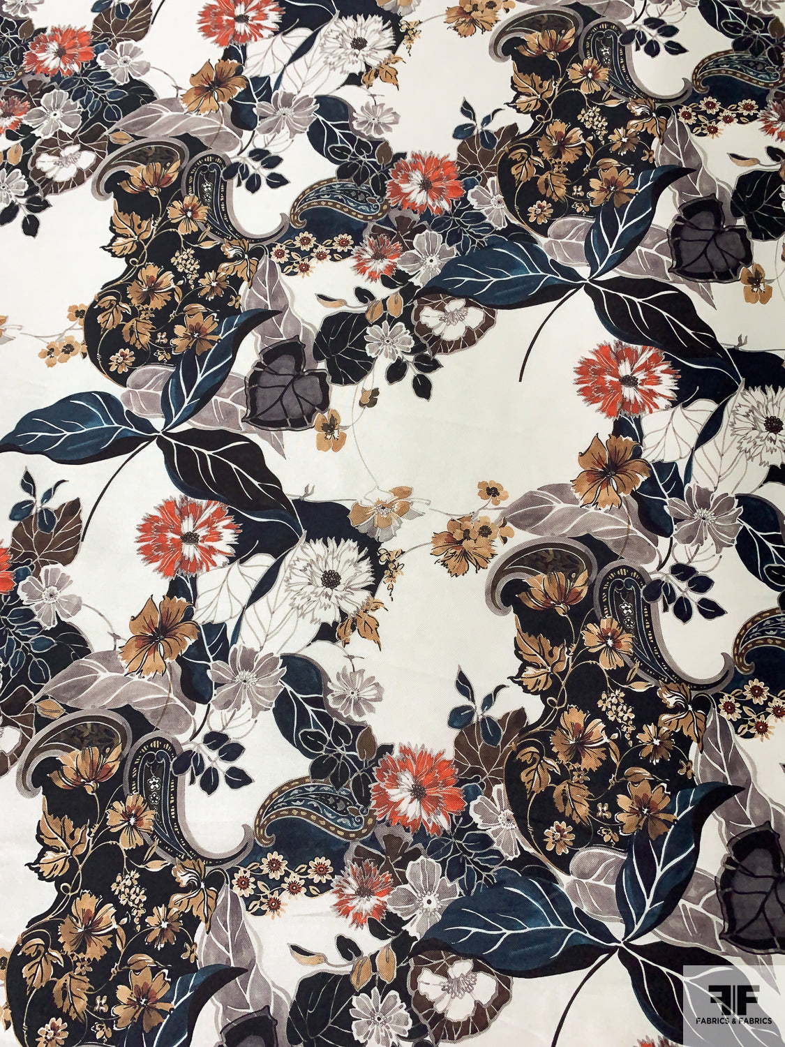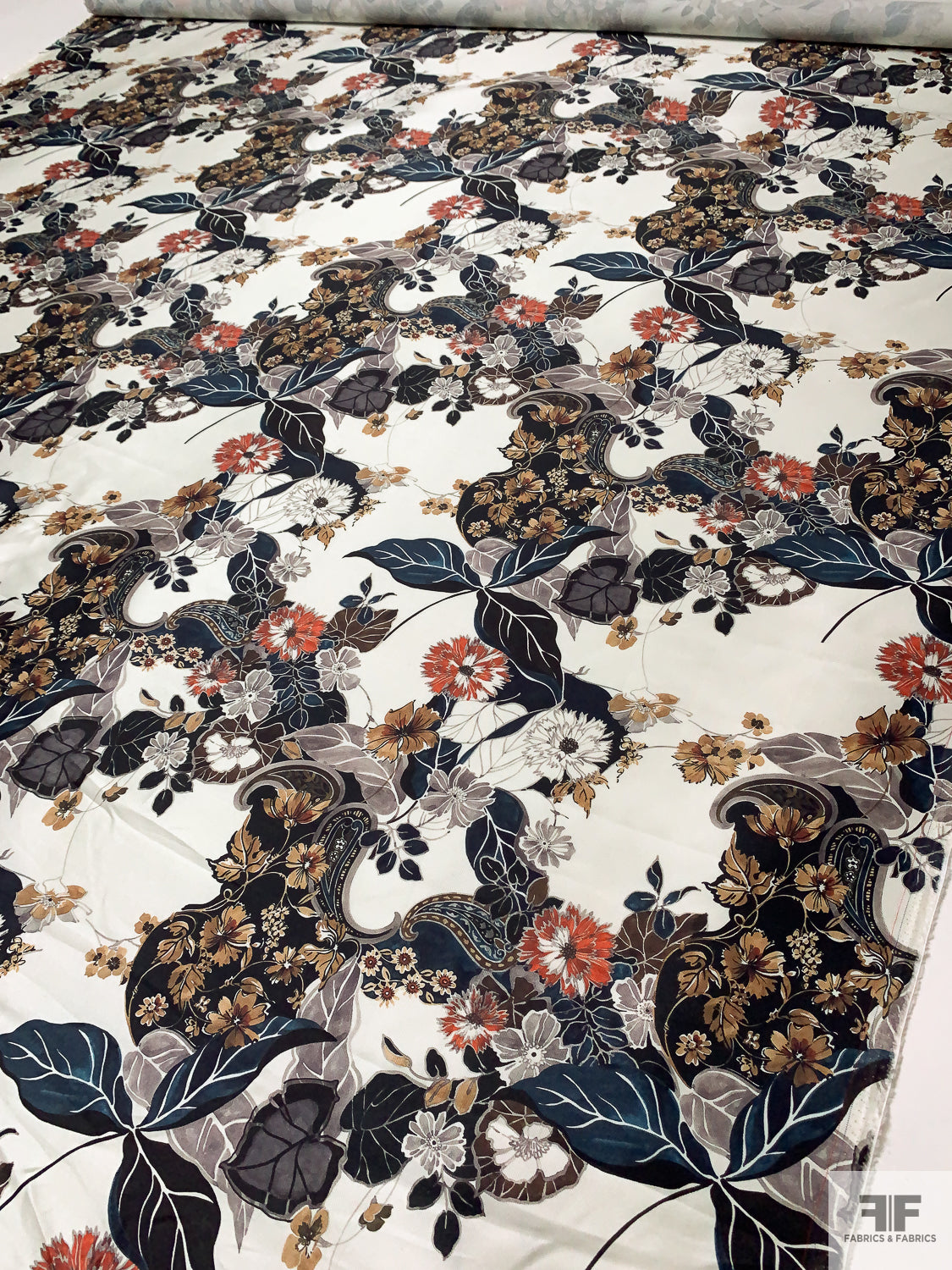 Exotic Paisley Floral Printed Silk-Cotton Mikado - Ivory / Black / MIdnight Teal / Smokey Orange