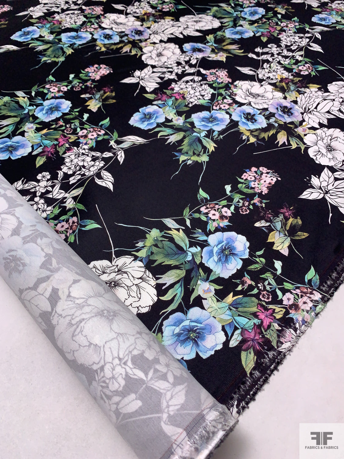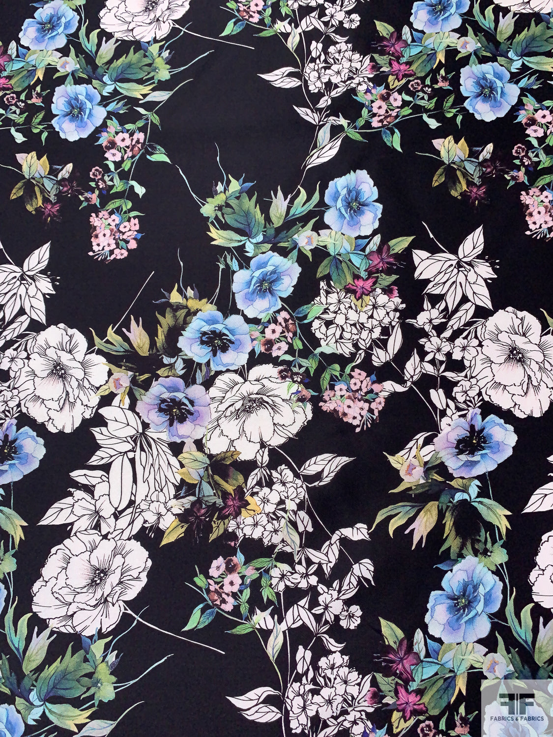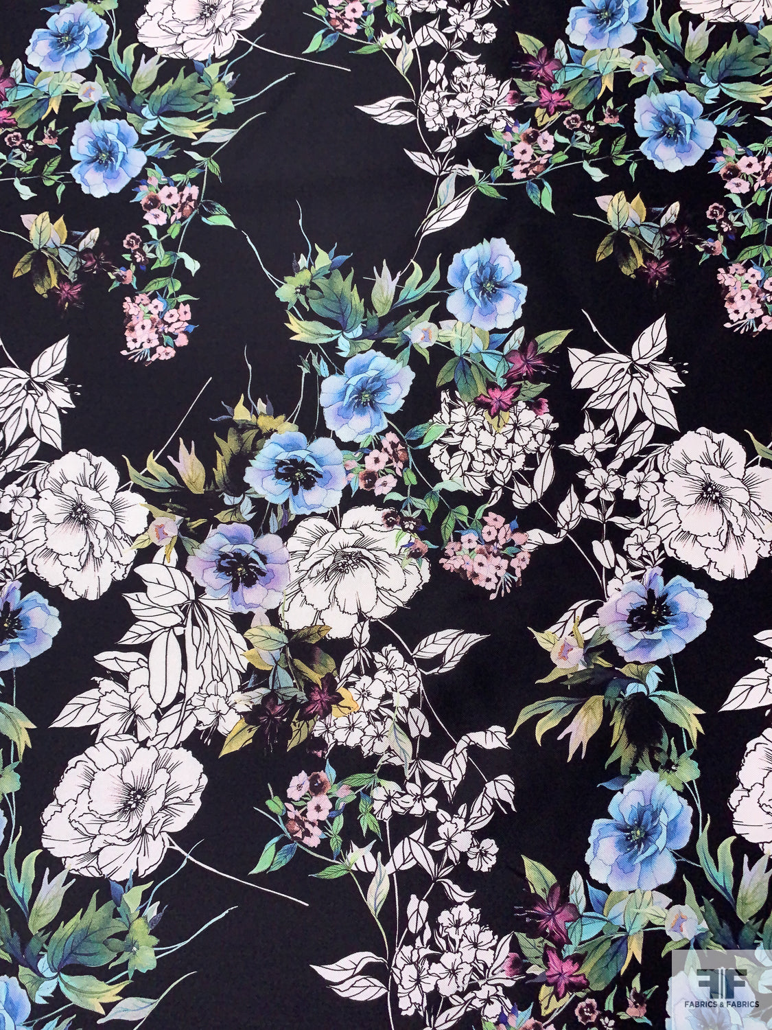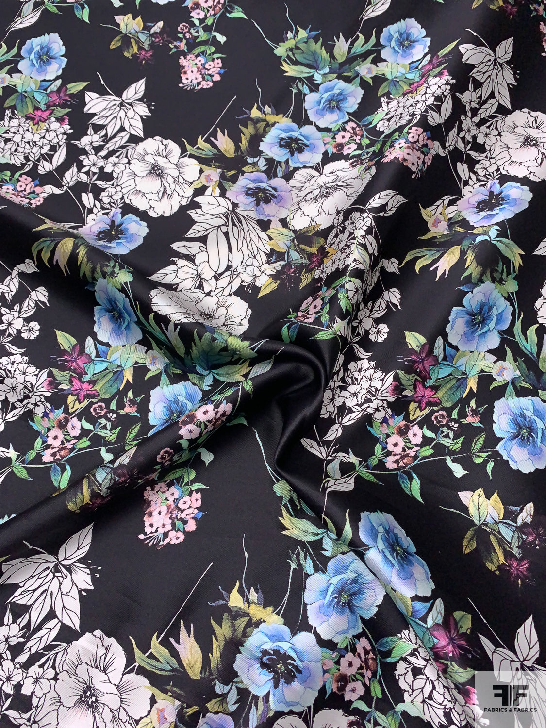 Floral Printed Silk-Cotton Mikado - Periwinkle / Blue / Greens / Black / White
