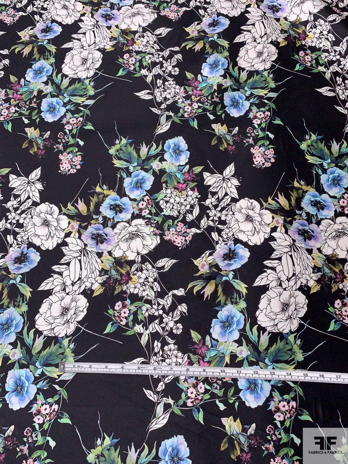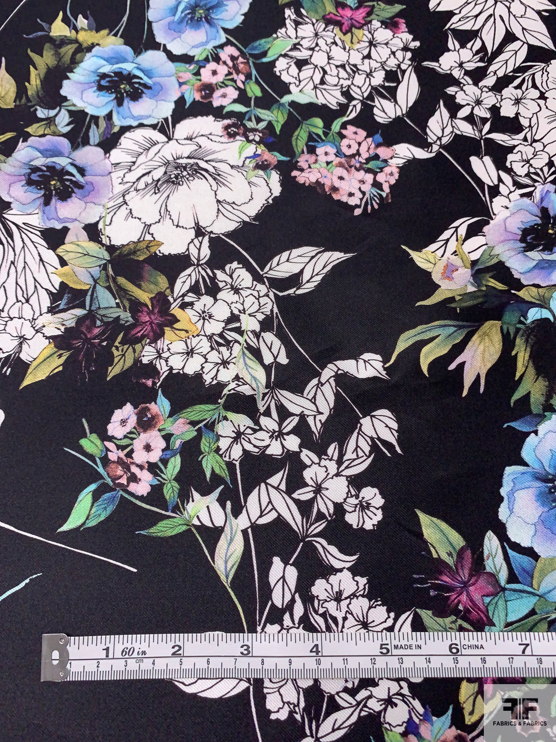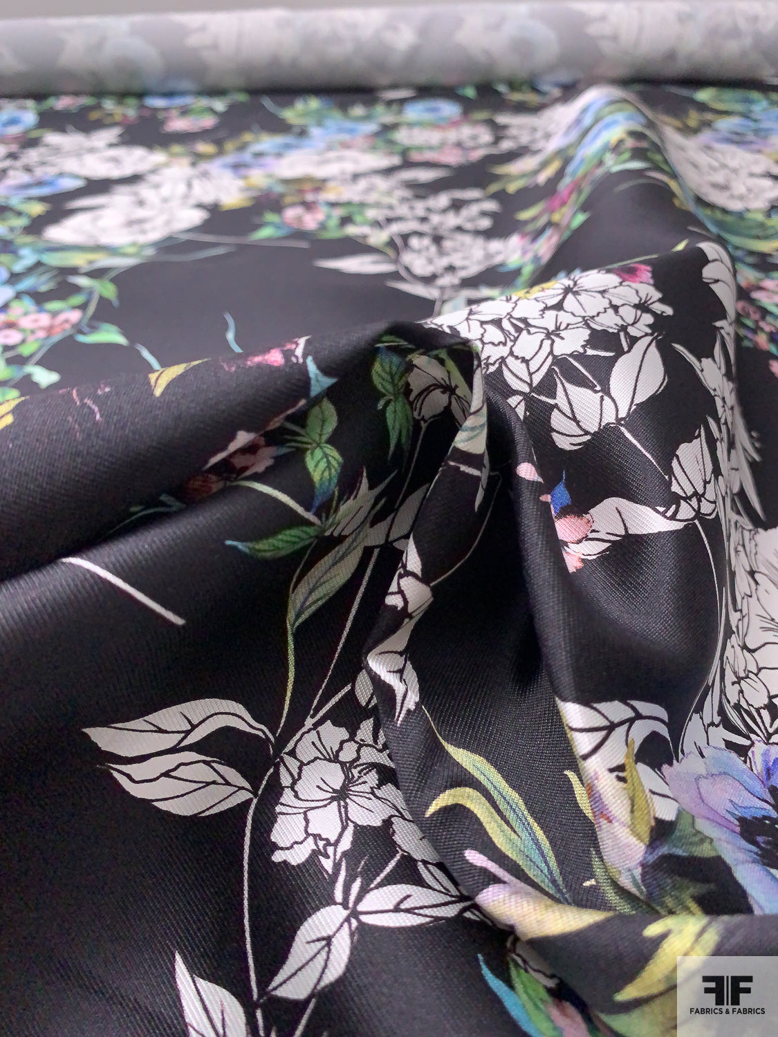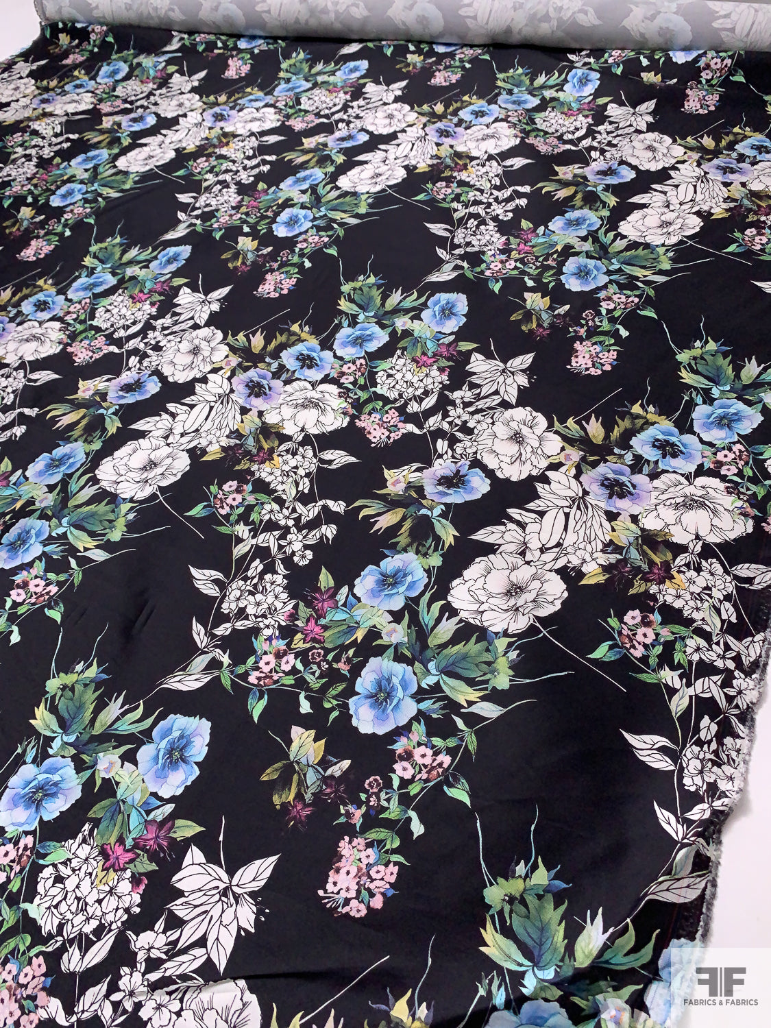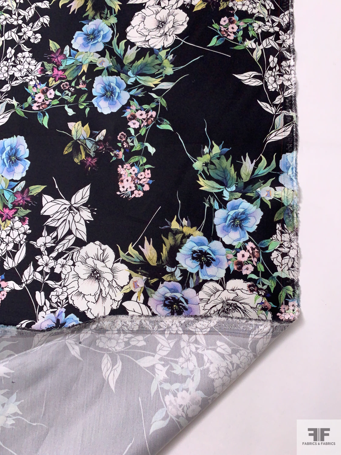 Floral Printed Silk-Cotton Mikado - Periwinkle / Blue / Greens / Black / White