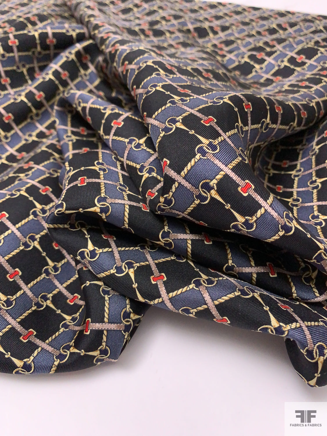 Equestrian Tack Printed Fine Silk Twill Pre-Cut Panel - Black / Dark Grey / Red / Pale Gold