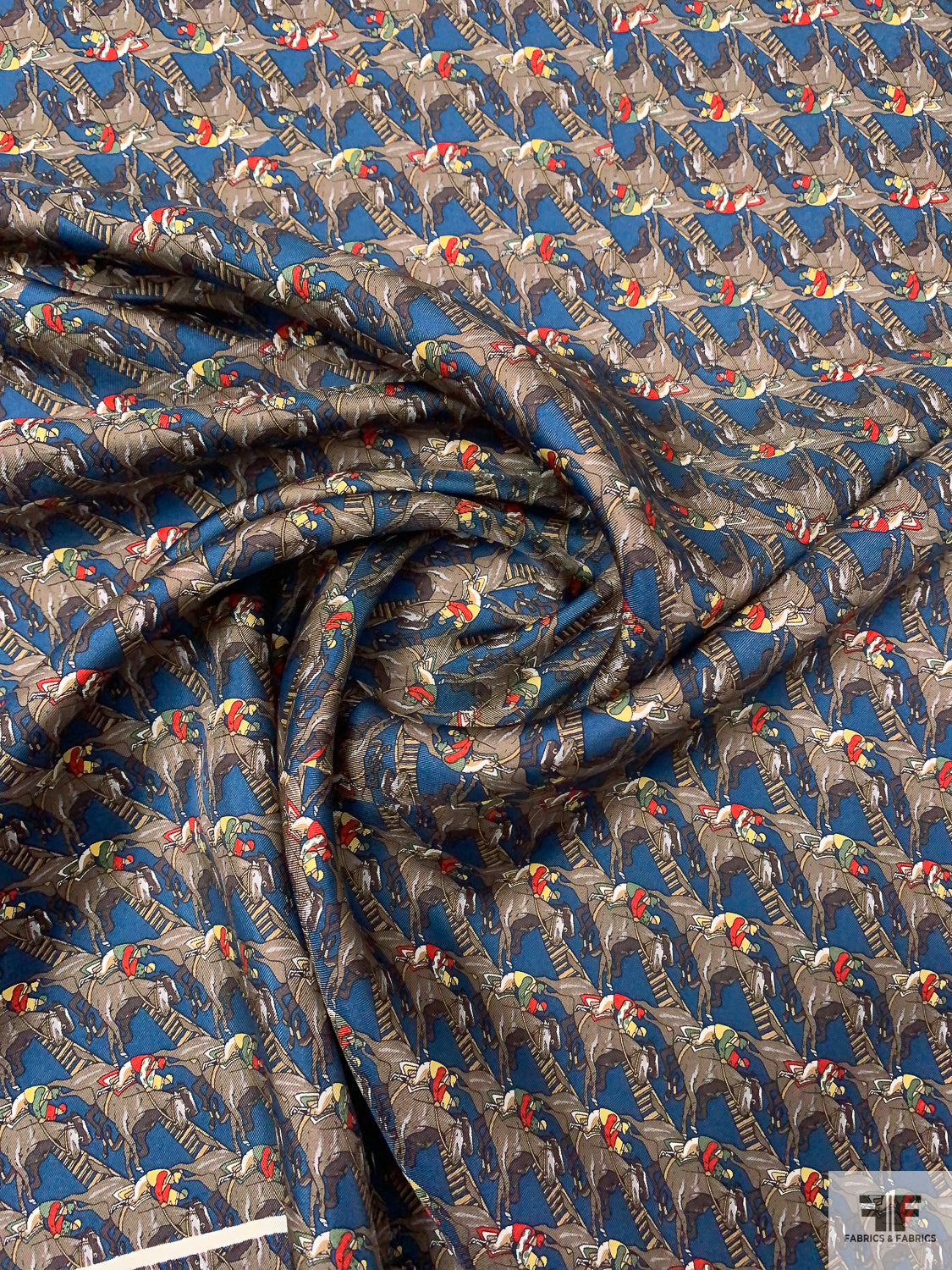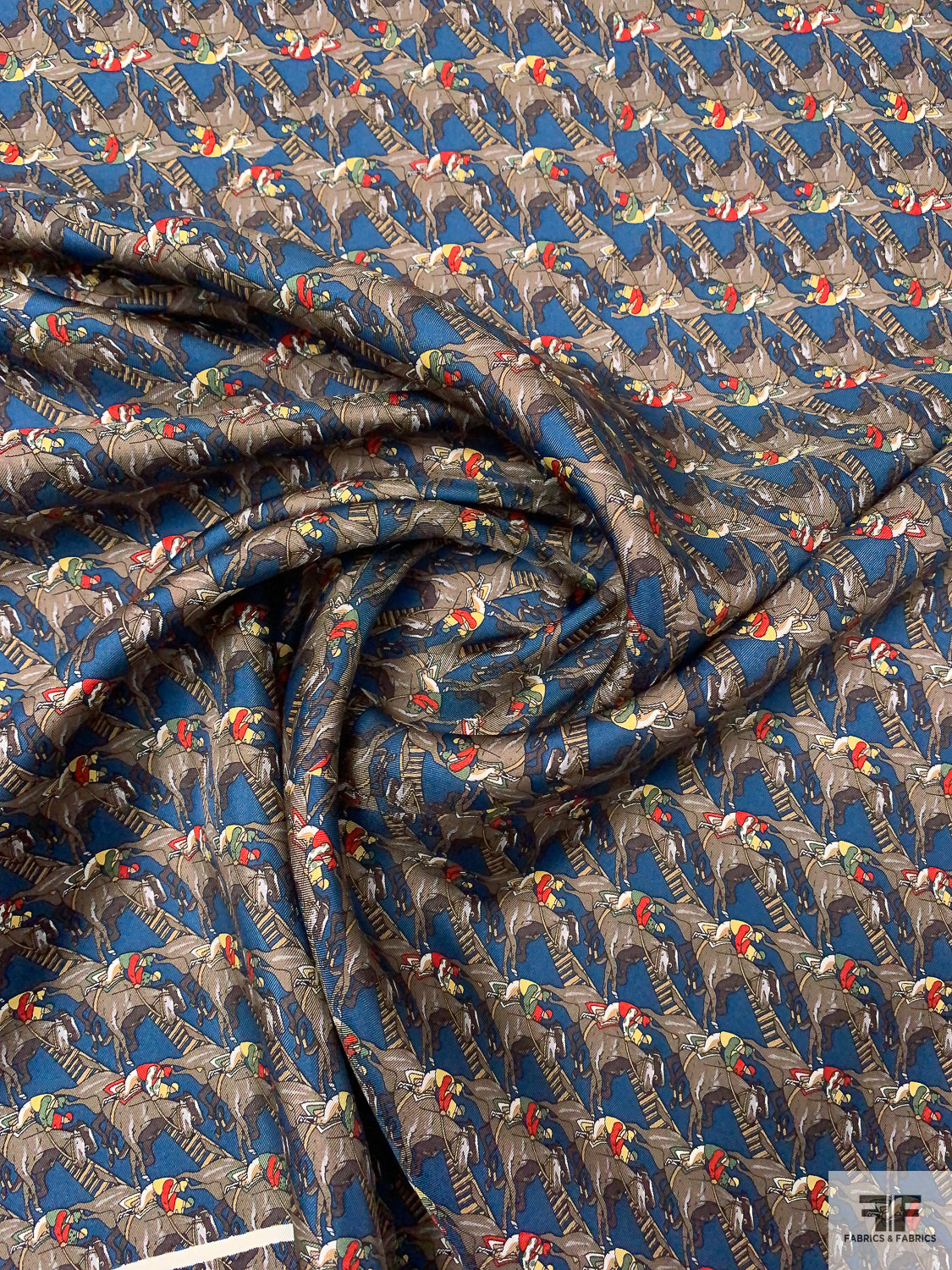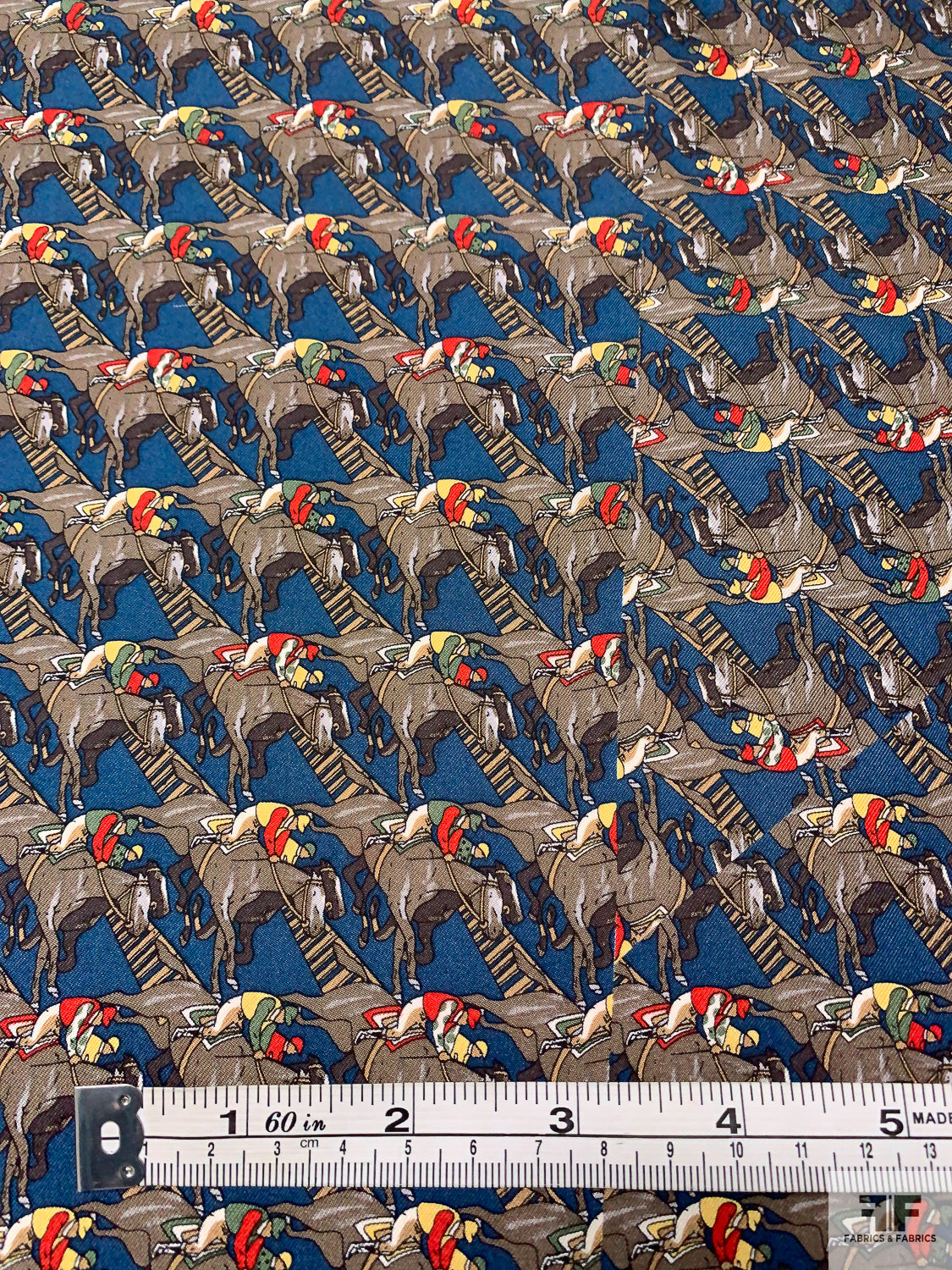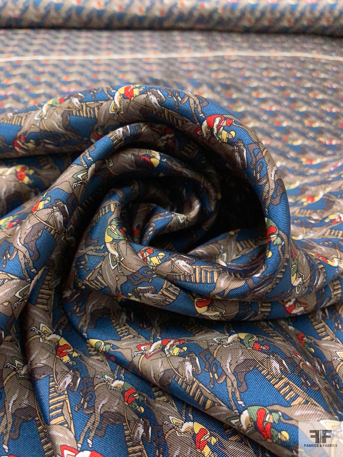 Equestrian Jockey Printed Fine Silk Twill Panel - Royal Blue / Warm Grey-Taupe / Red