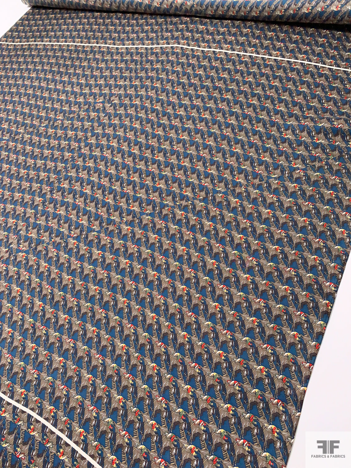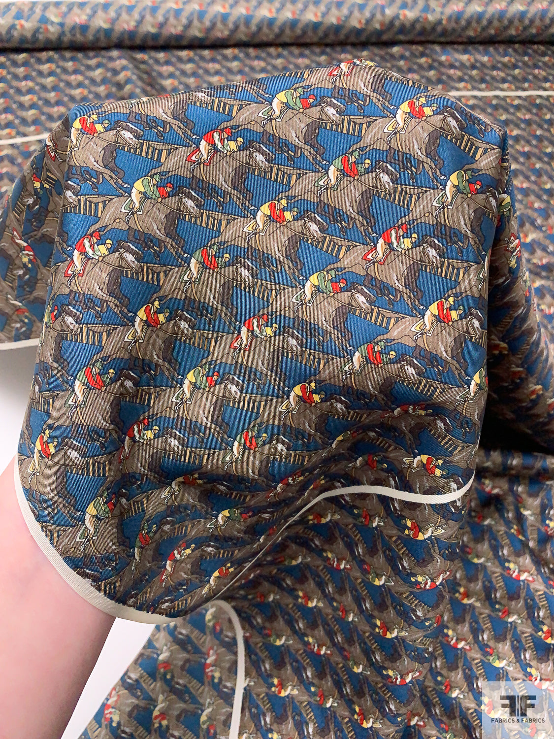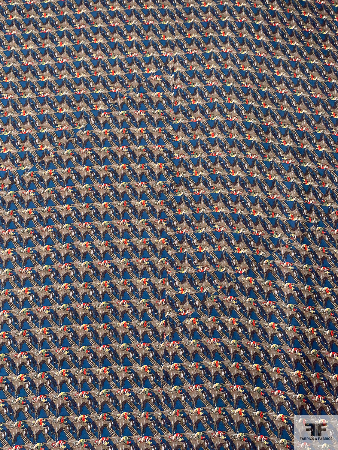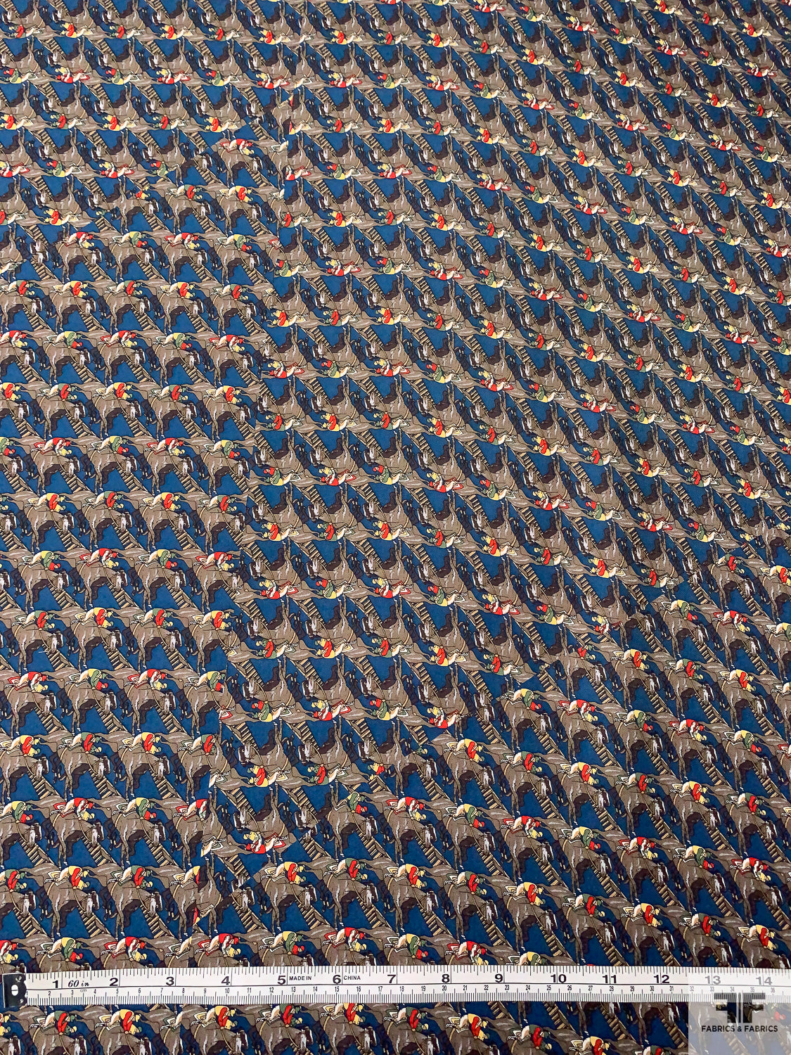 Equestrian Jockey Printed Fine Silk Twill Panel - Royal Blue / Warm Grey-Taupe / Red