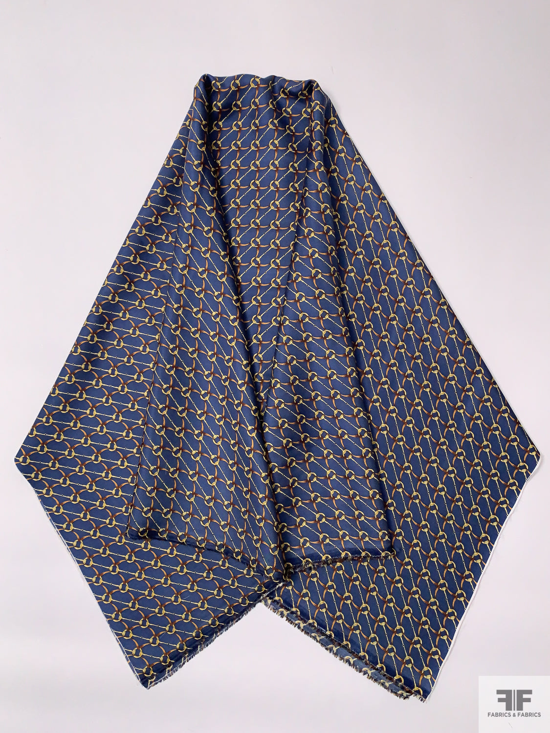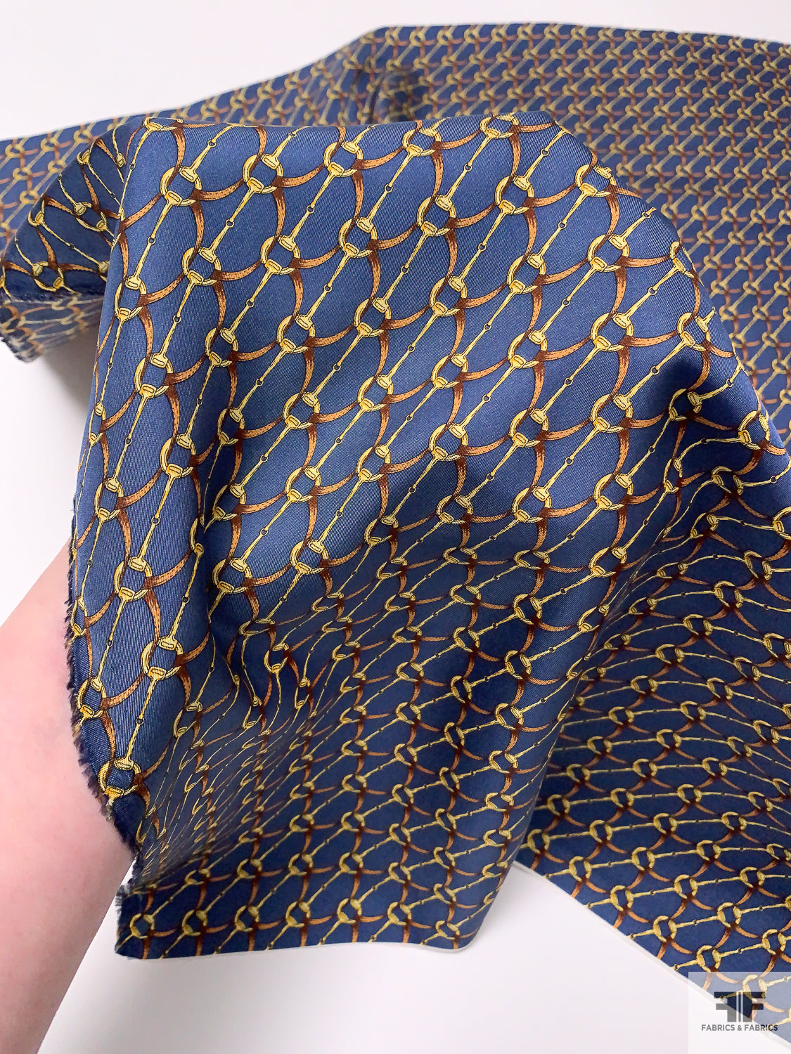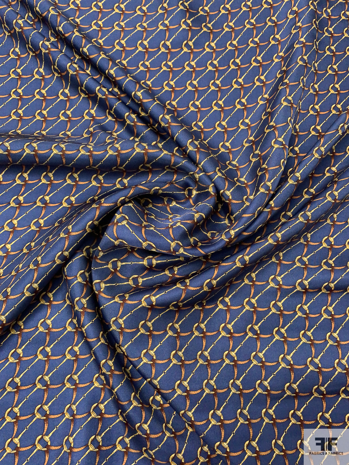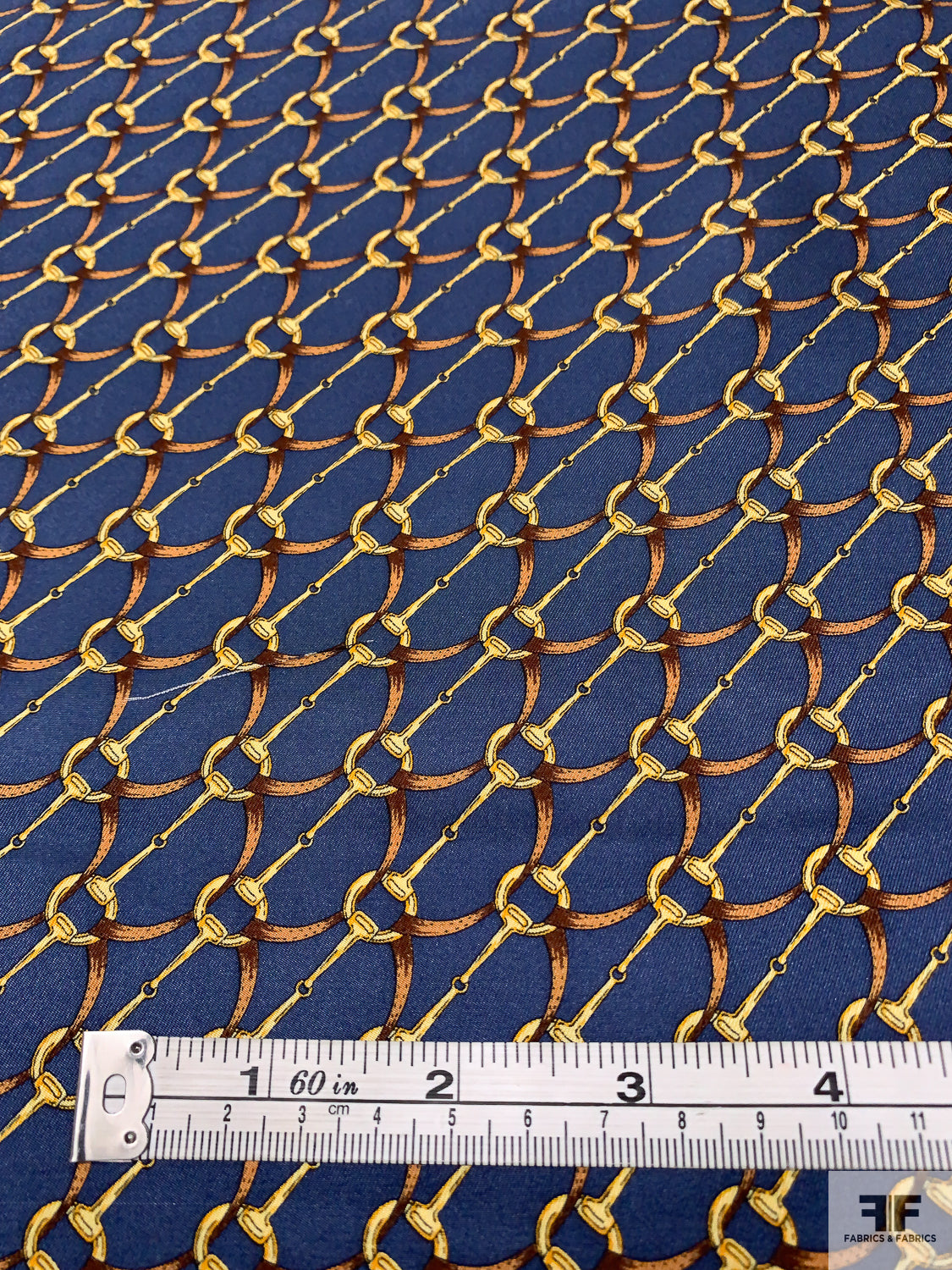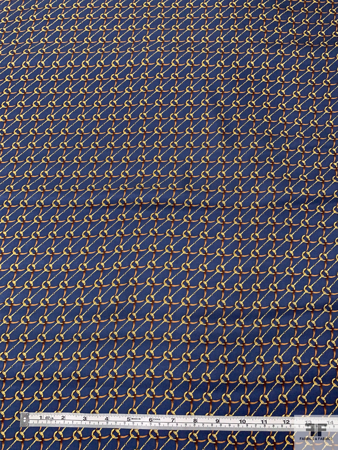Equestrian Tack Printed Fine Silk Twill Pre-Cut Panel - Steel Indigo / Brown / Gold