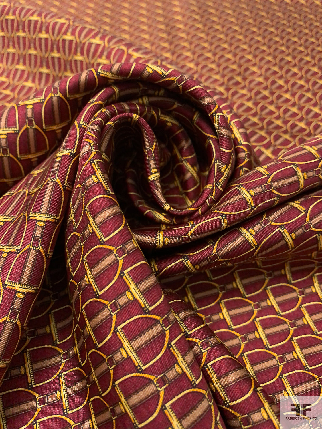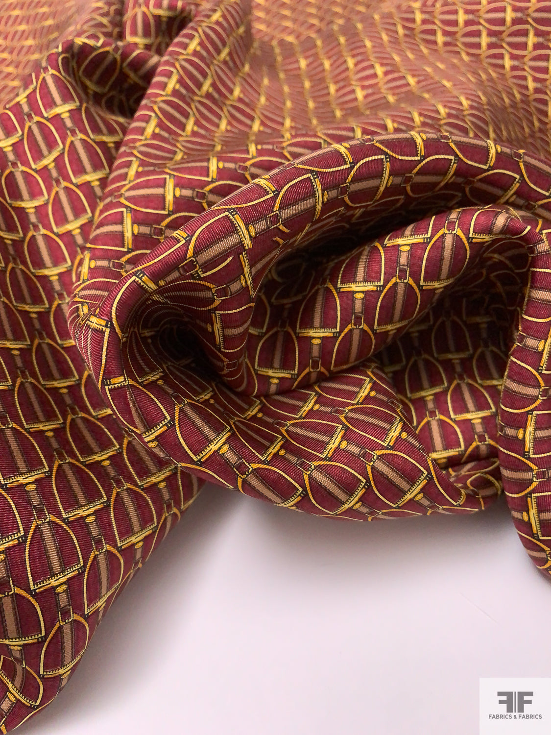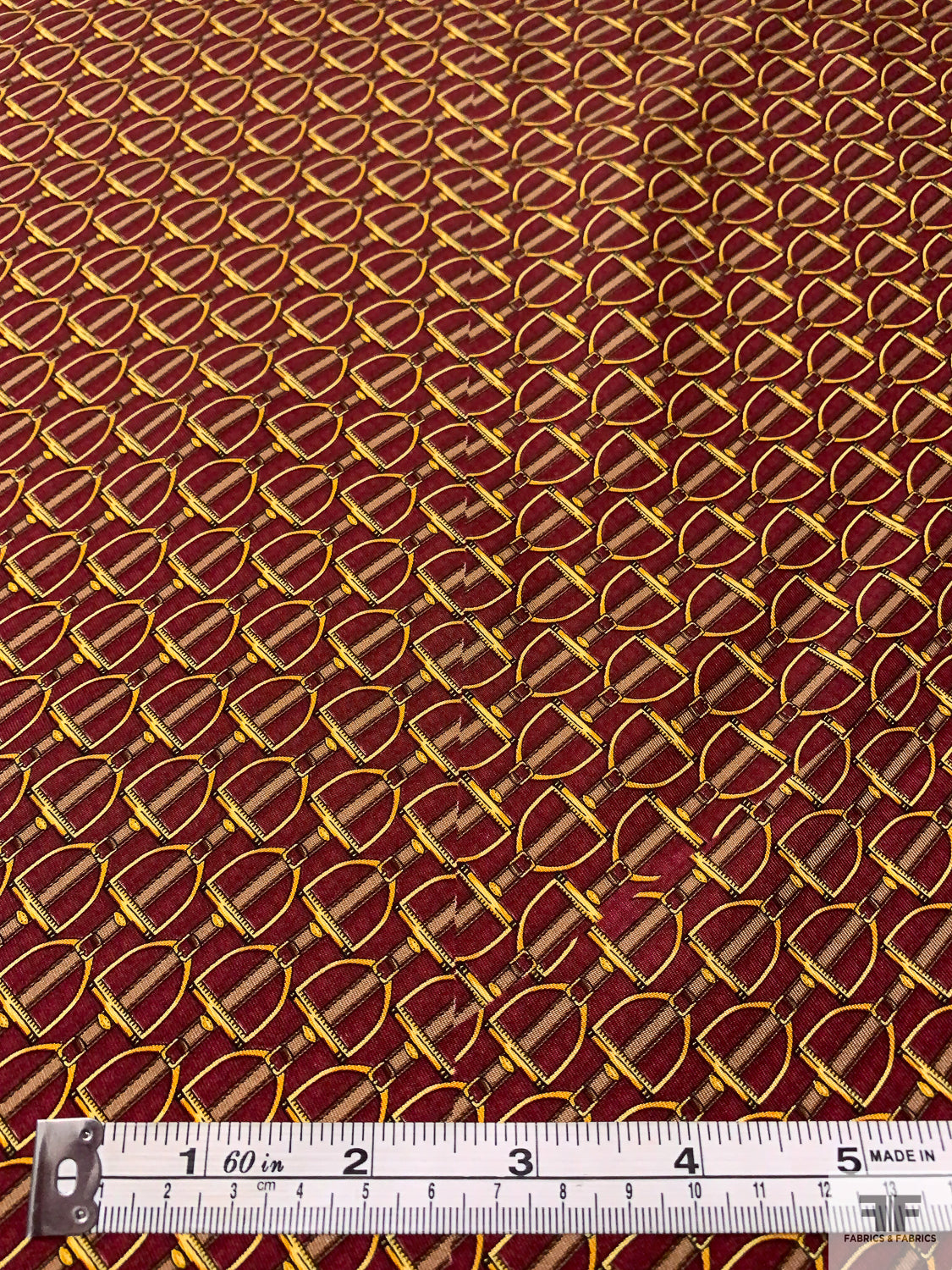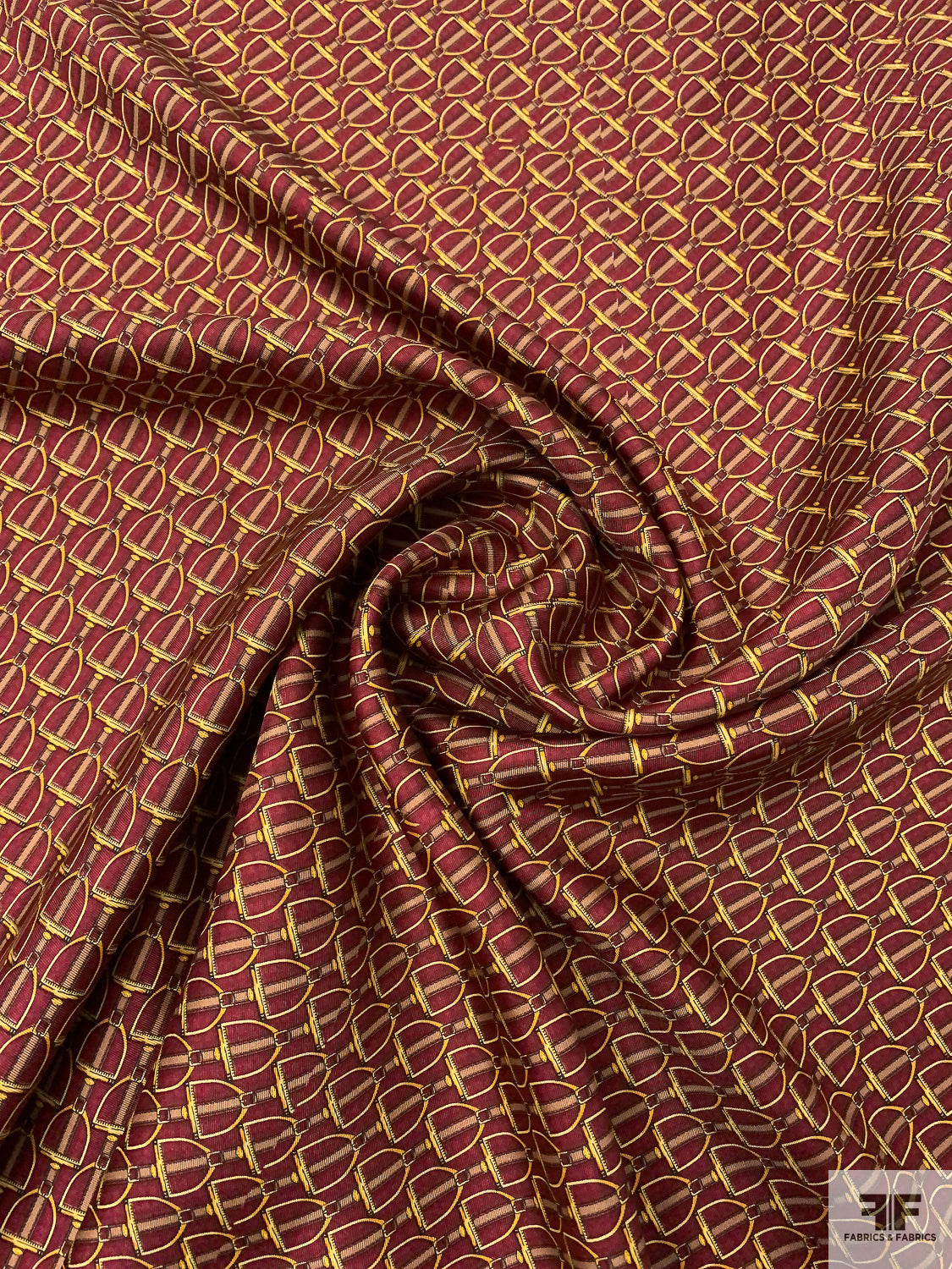 Equestrian Tack Printed Fine Silk Twill Pre-Cut Panel - Red / Yellow-Gold / Tan