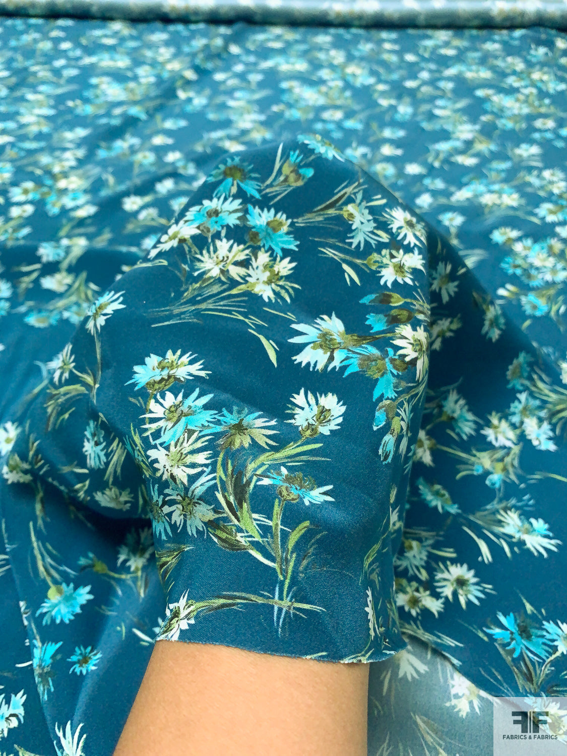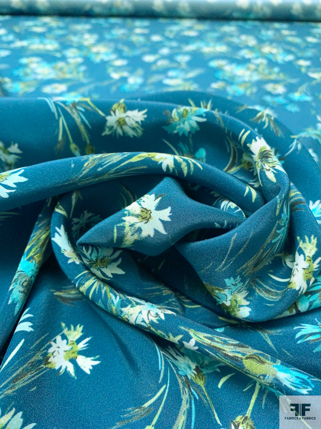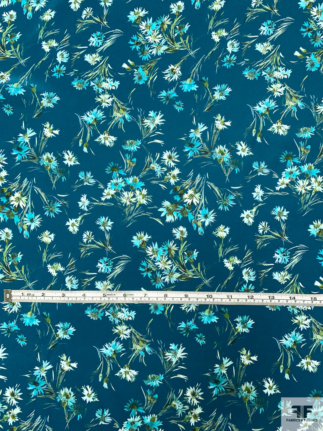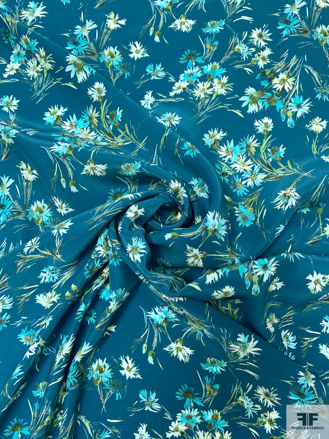 Floral Matte-Side Printed Silk Charmeuse - Teal Blue / Green / Off-White