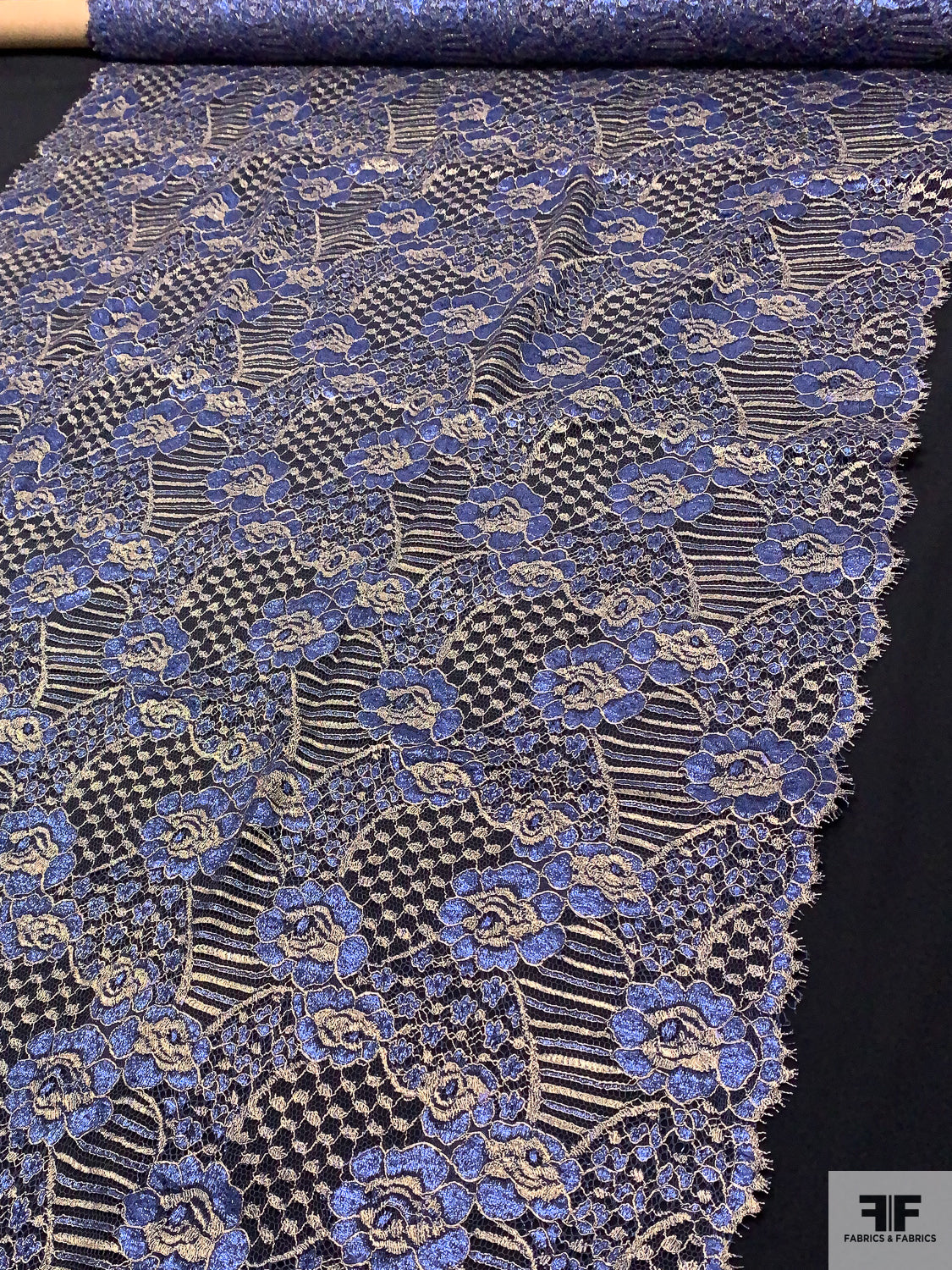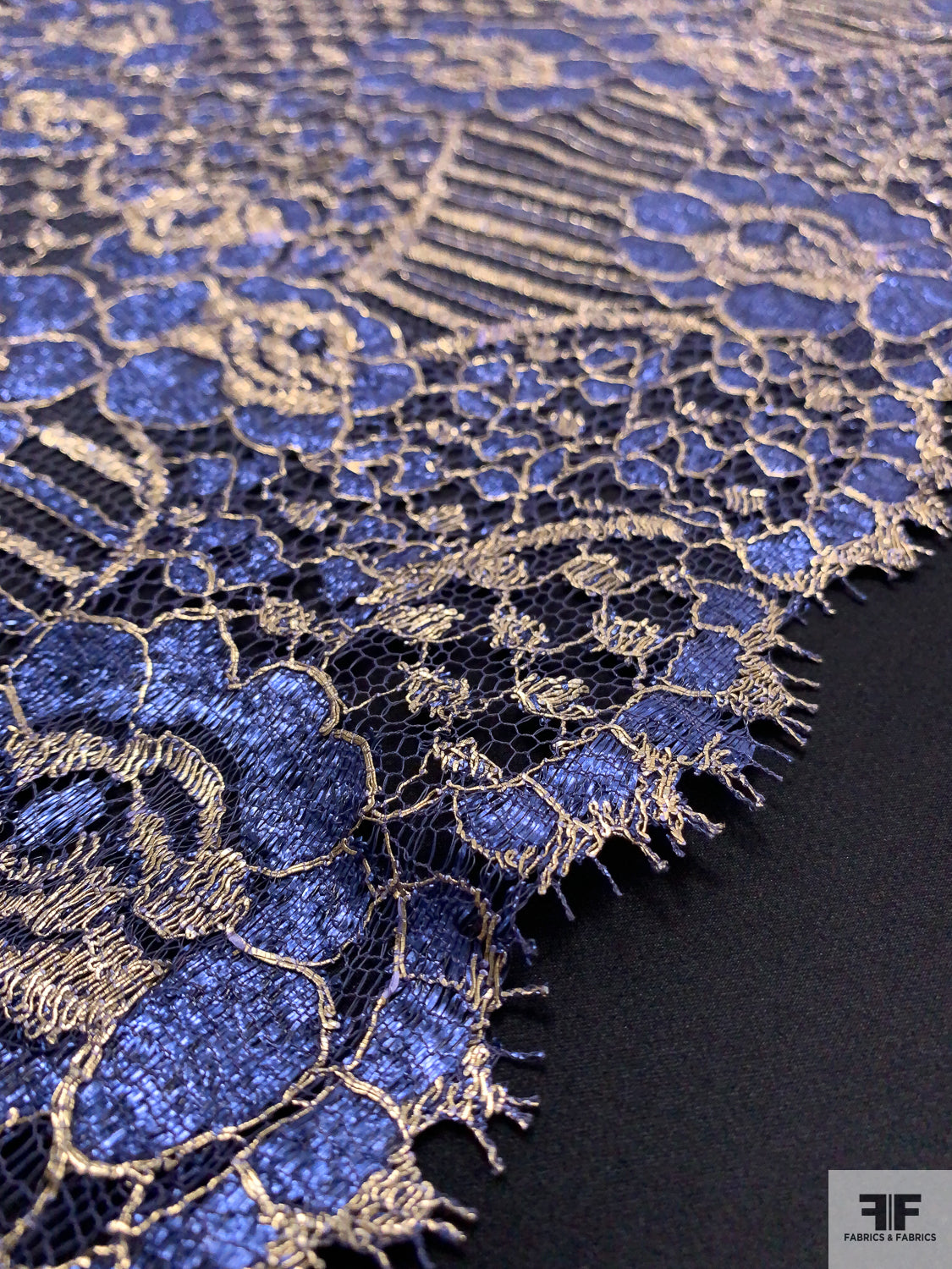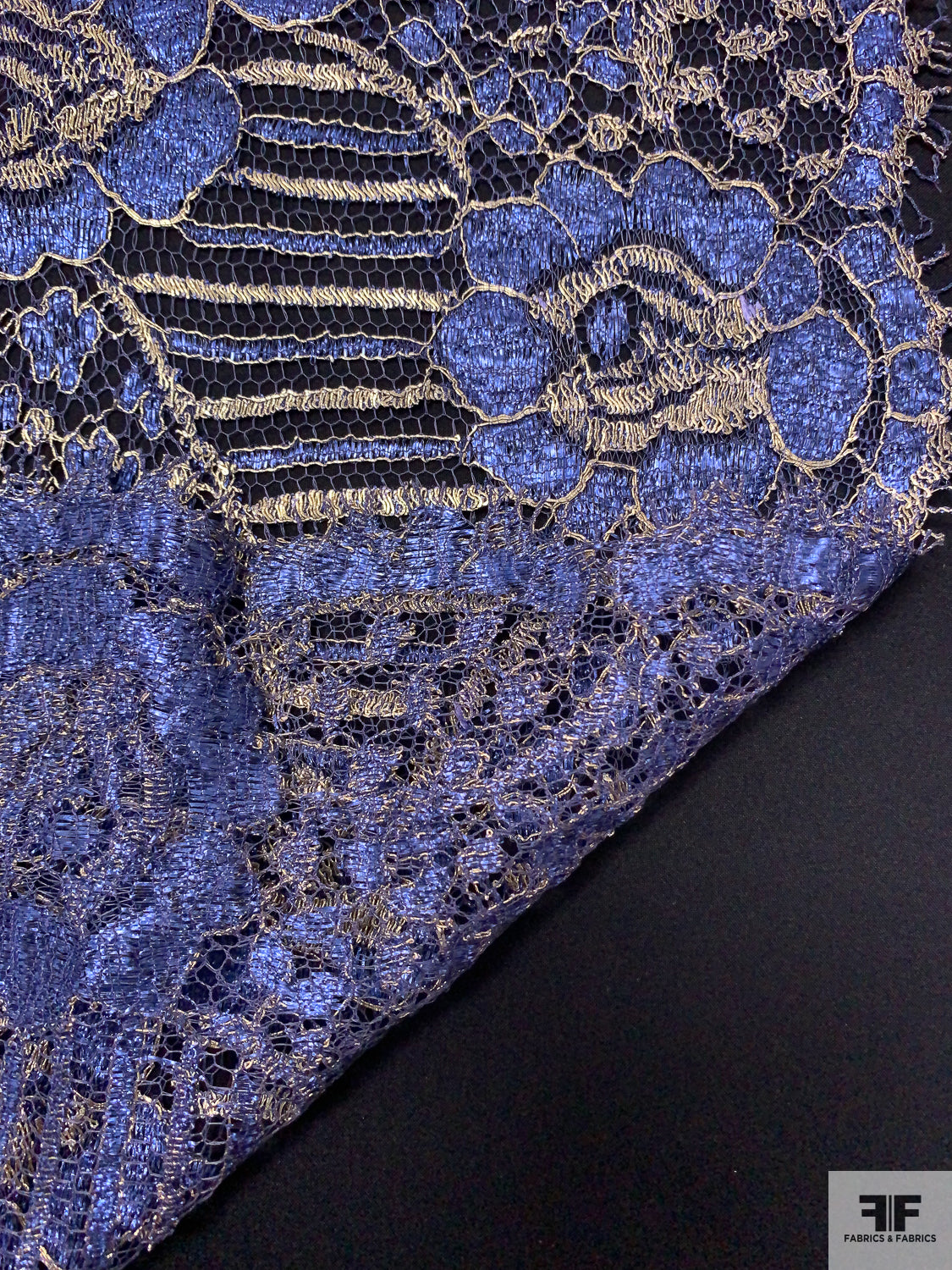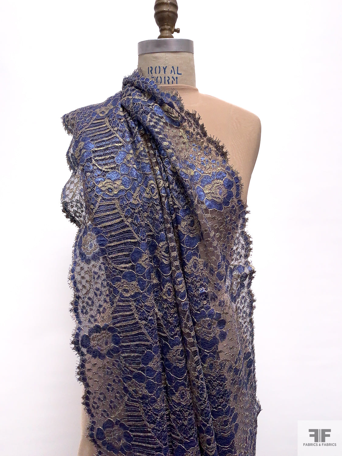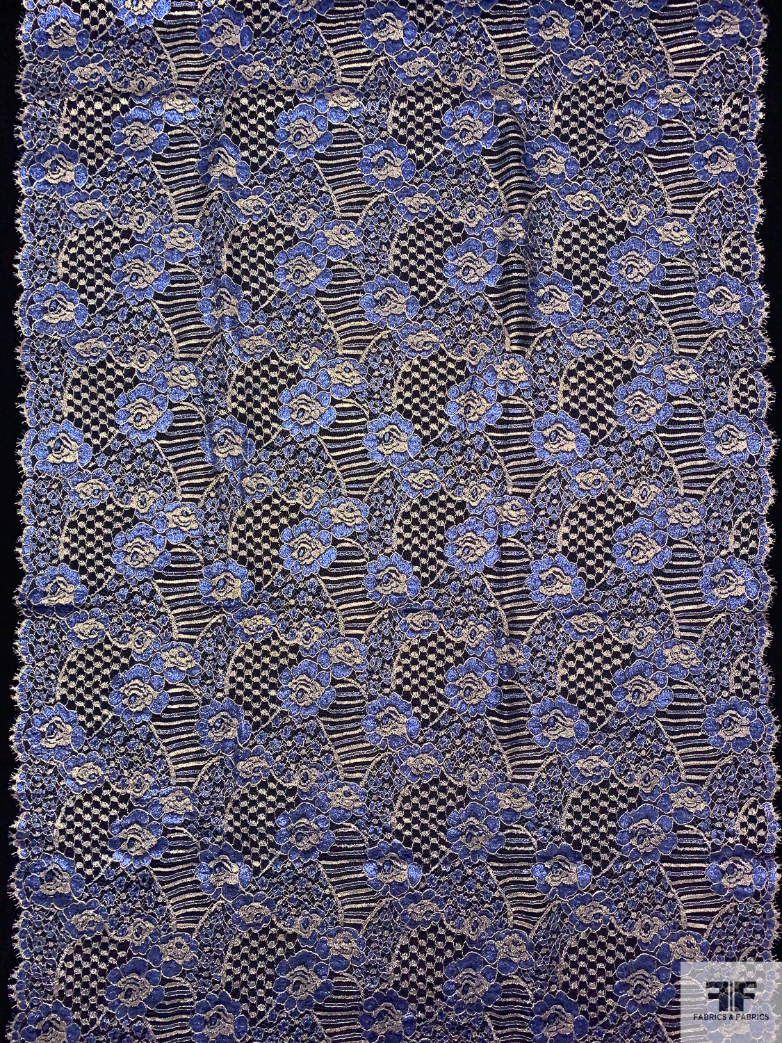 Double Scalloped Floral Metallic French Chantilly Lace - Metallic Periwinkle / Gold