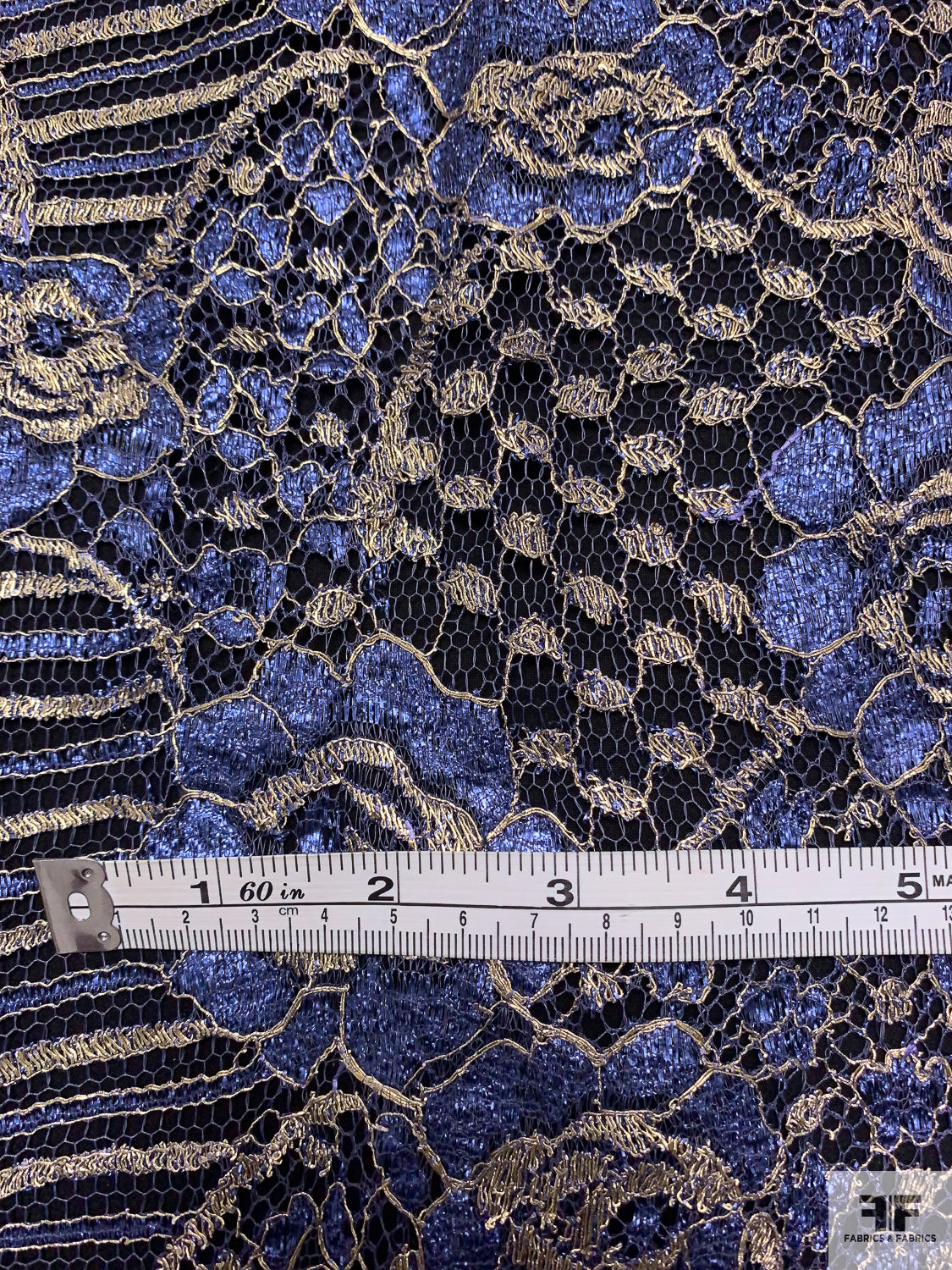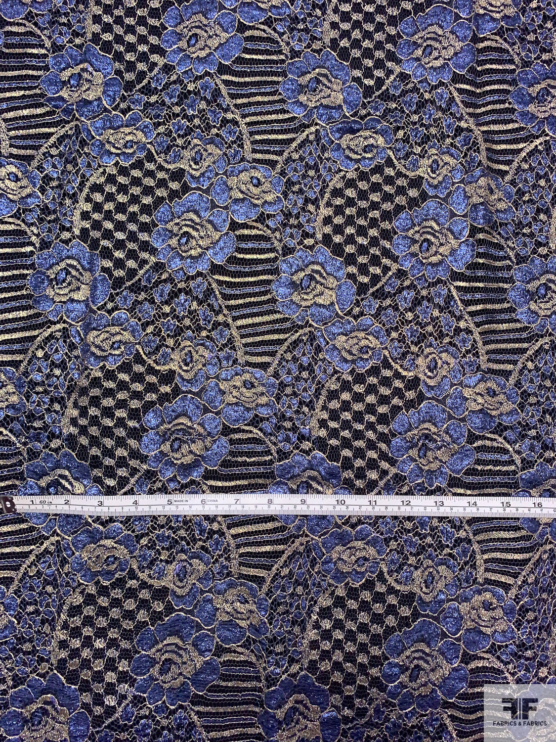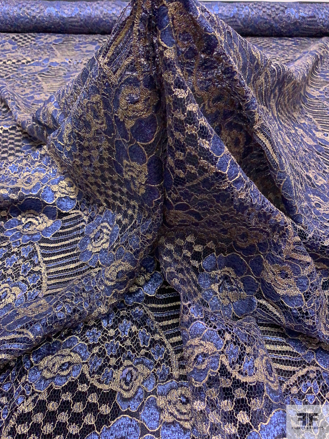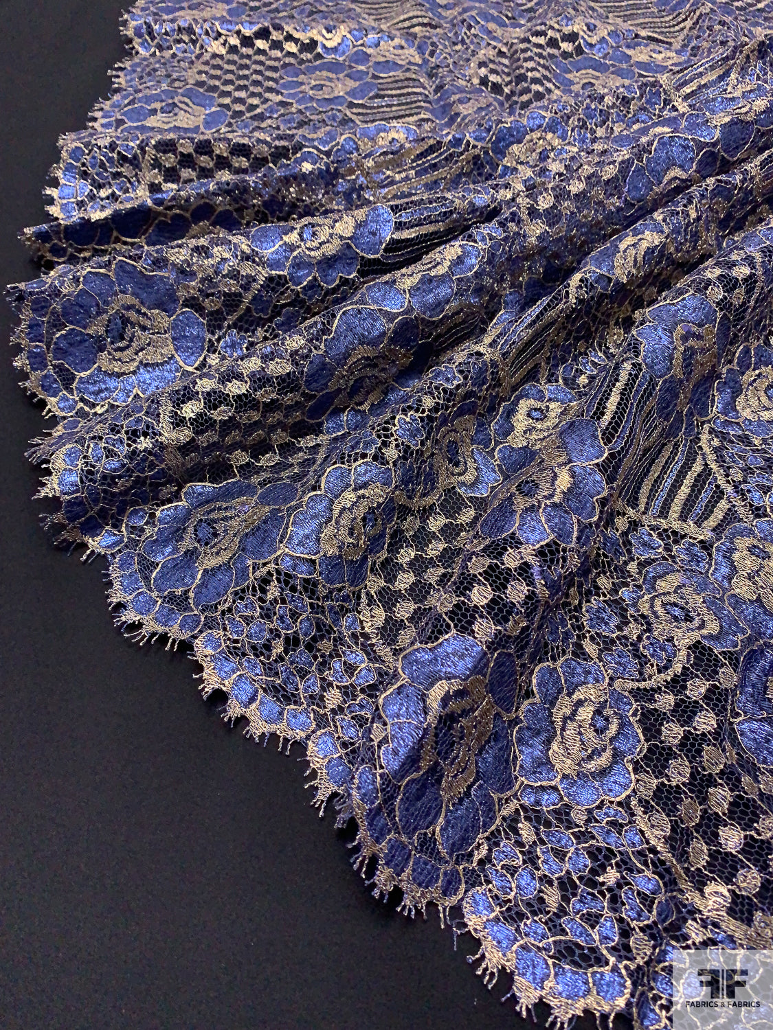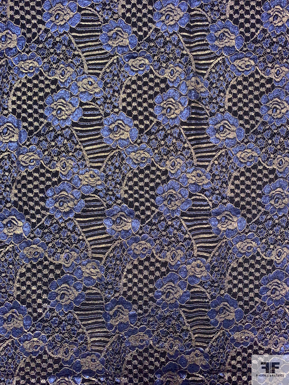 Double Scalloped Floral Metallic French Chantilly Lace - Metallic Periwinkle / Gold