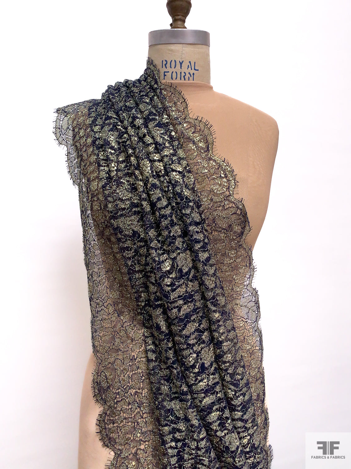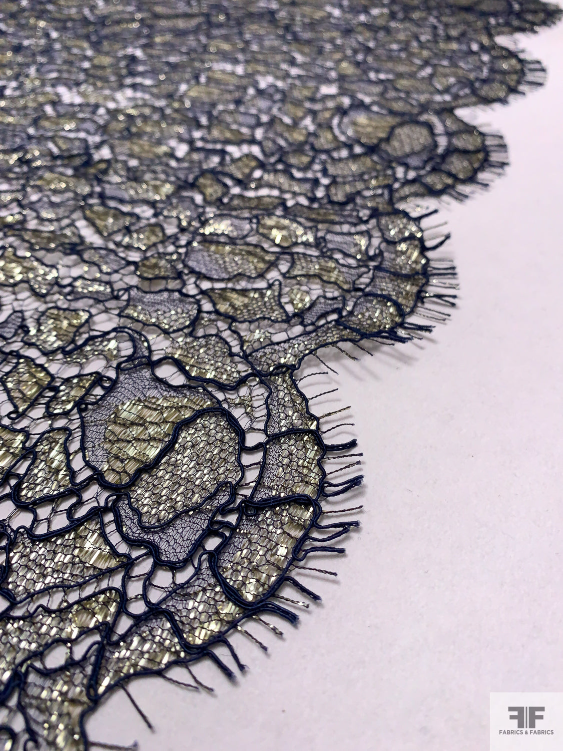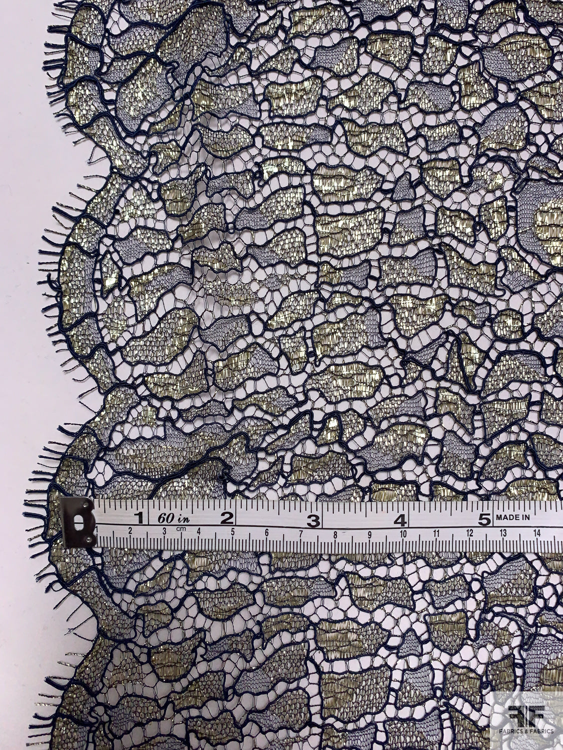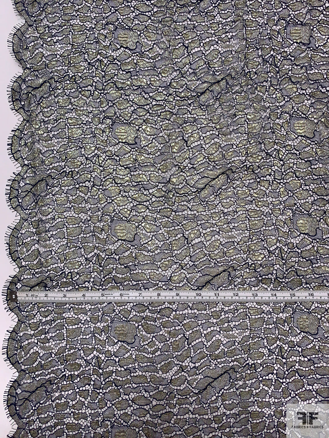 Double Scalloped Metallic French Chantilly Lace with Cording - Light Gold / Navy