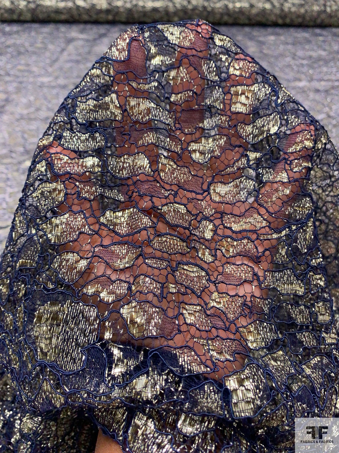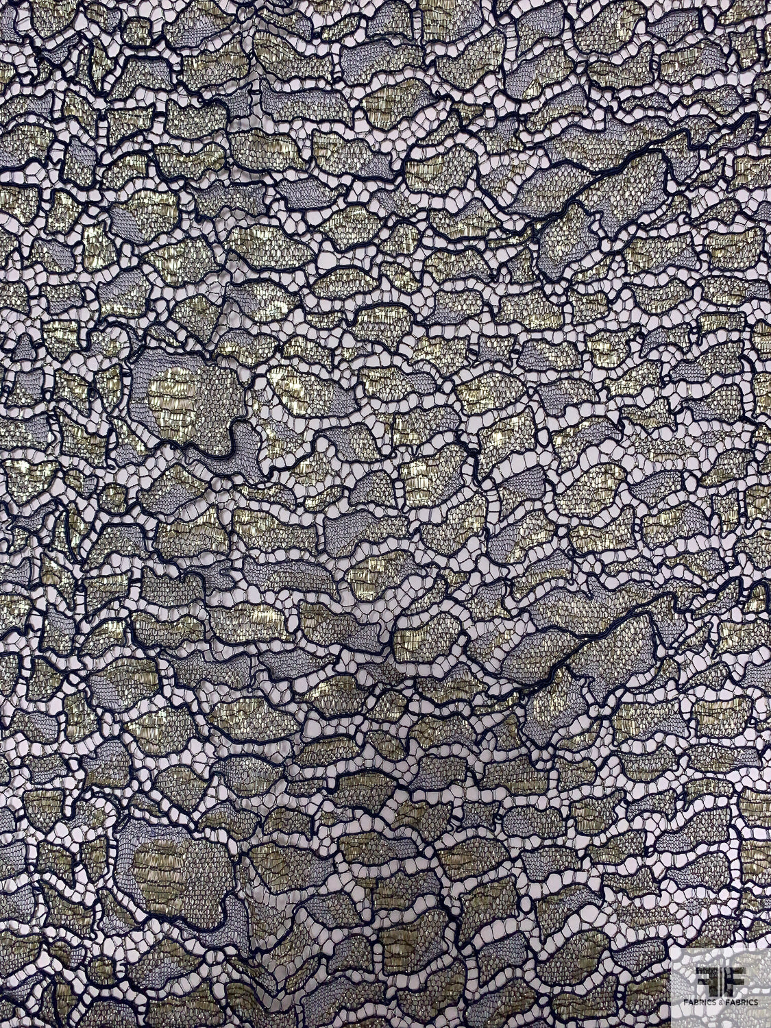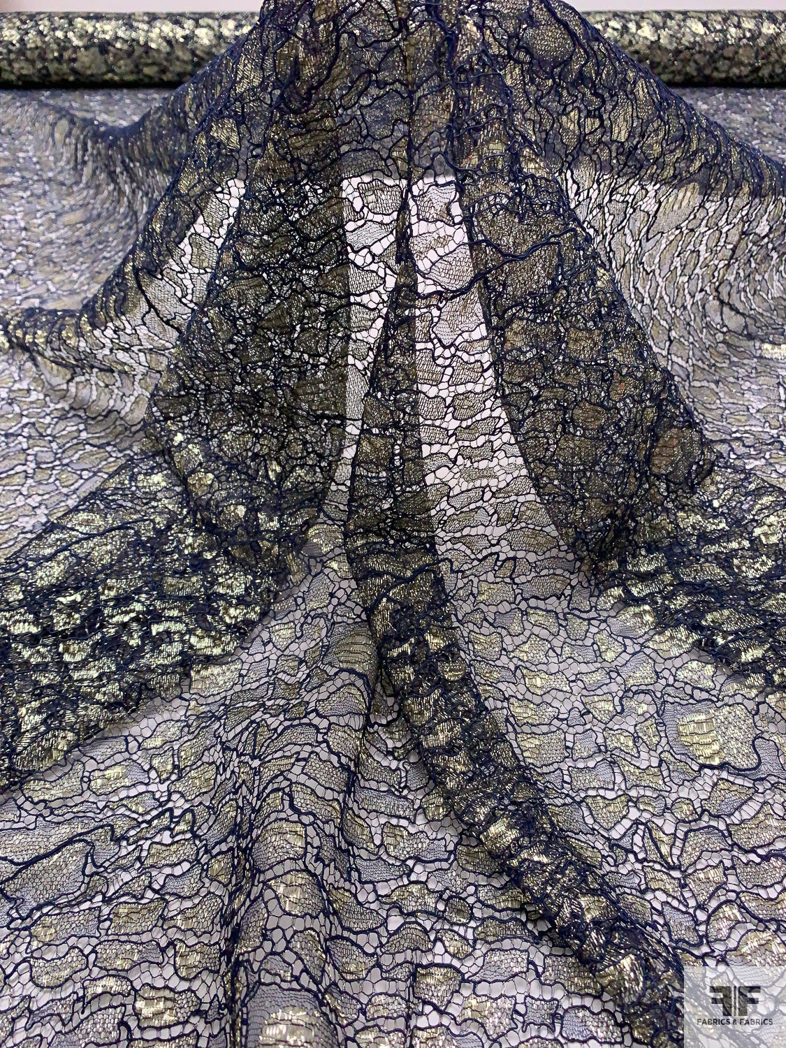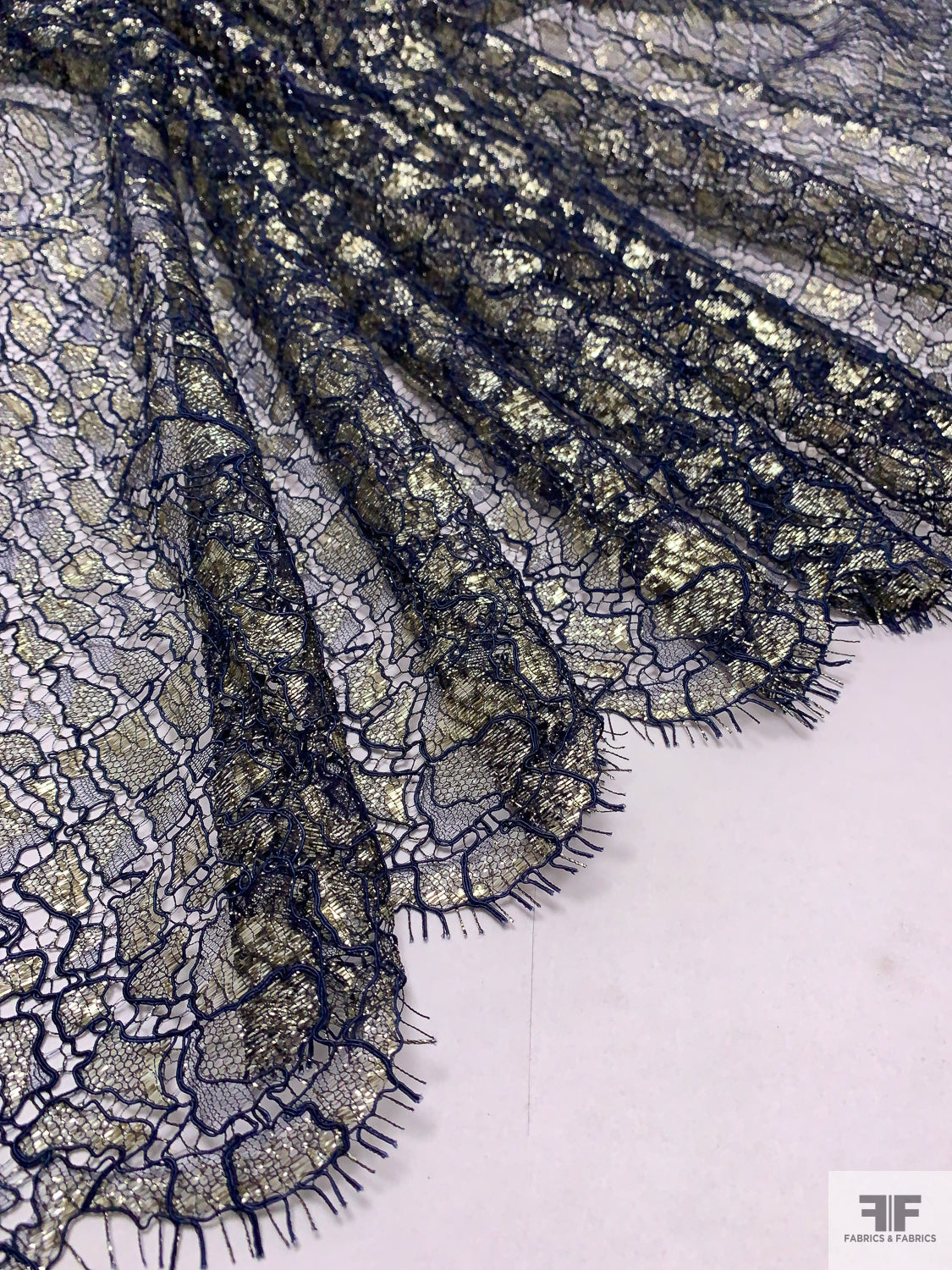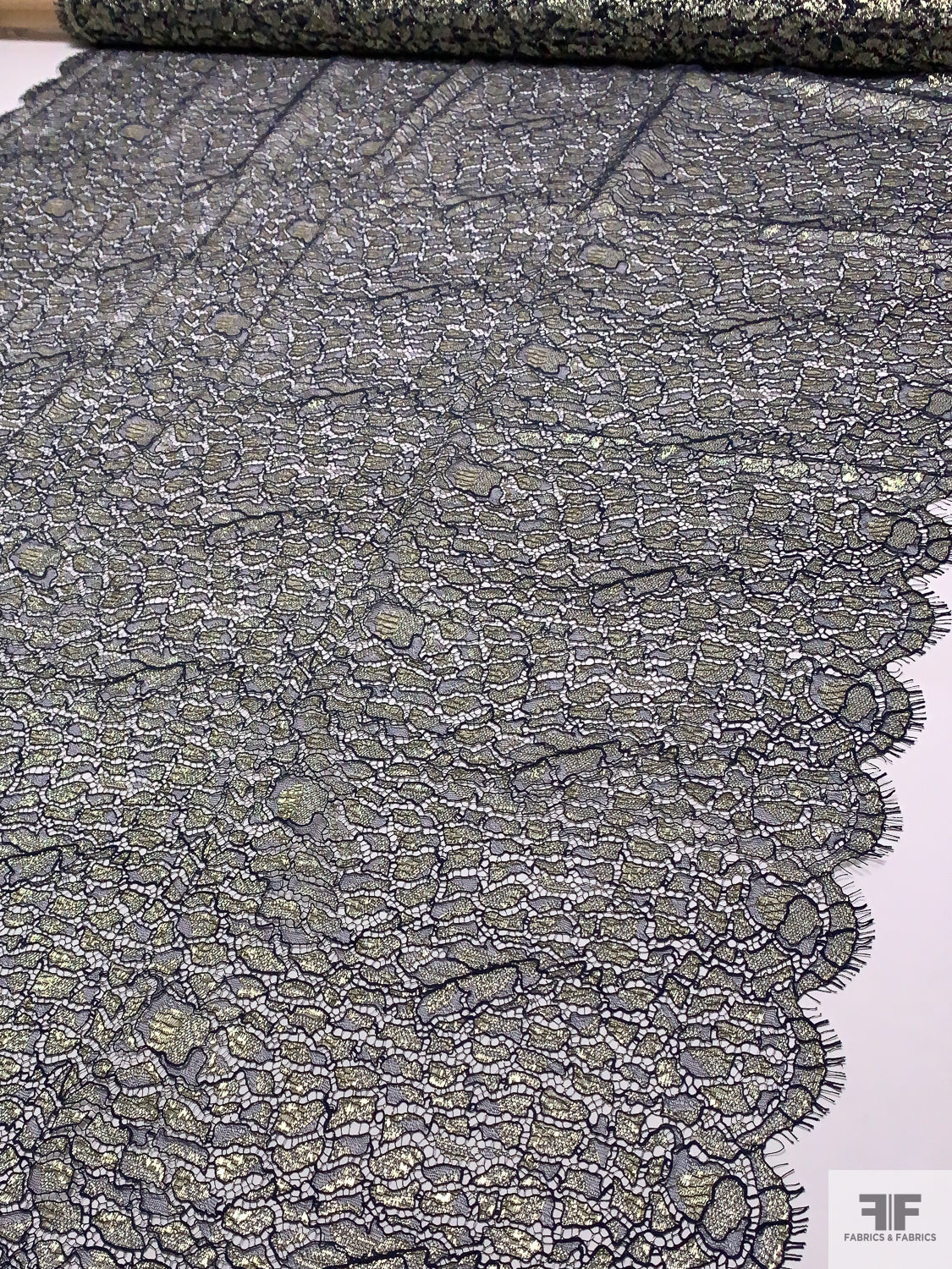 Double Scalloped Metallic French Chantilly Lace with Cording - Light Gold / Navy