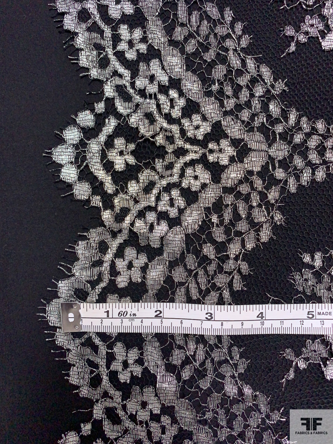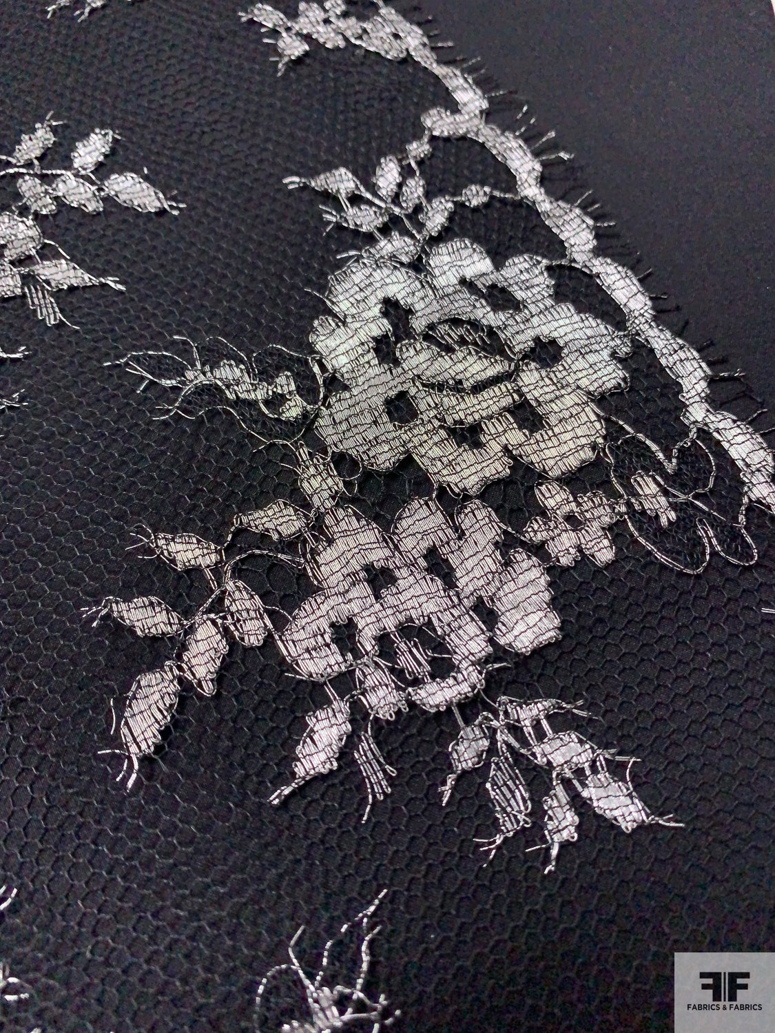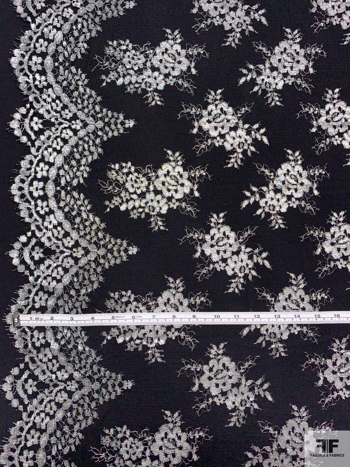 Single Scalloped Floral Metallic French Chantilly Lace - Silver / Black